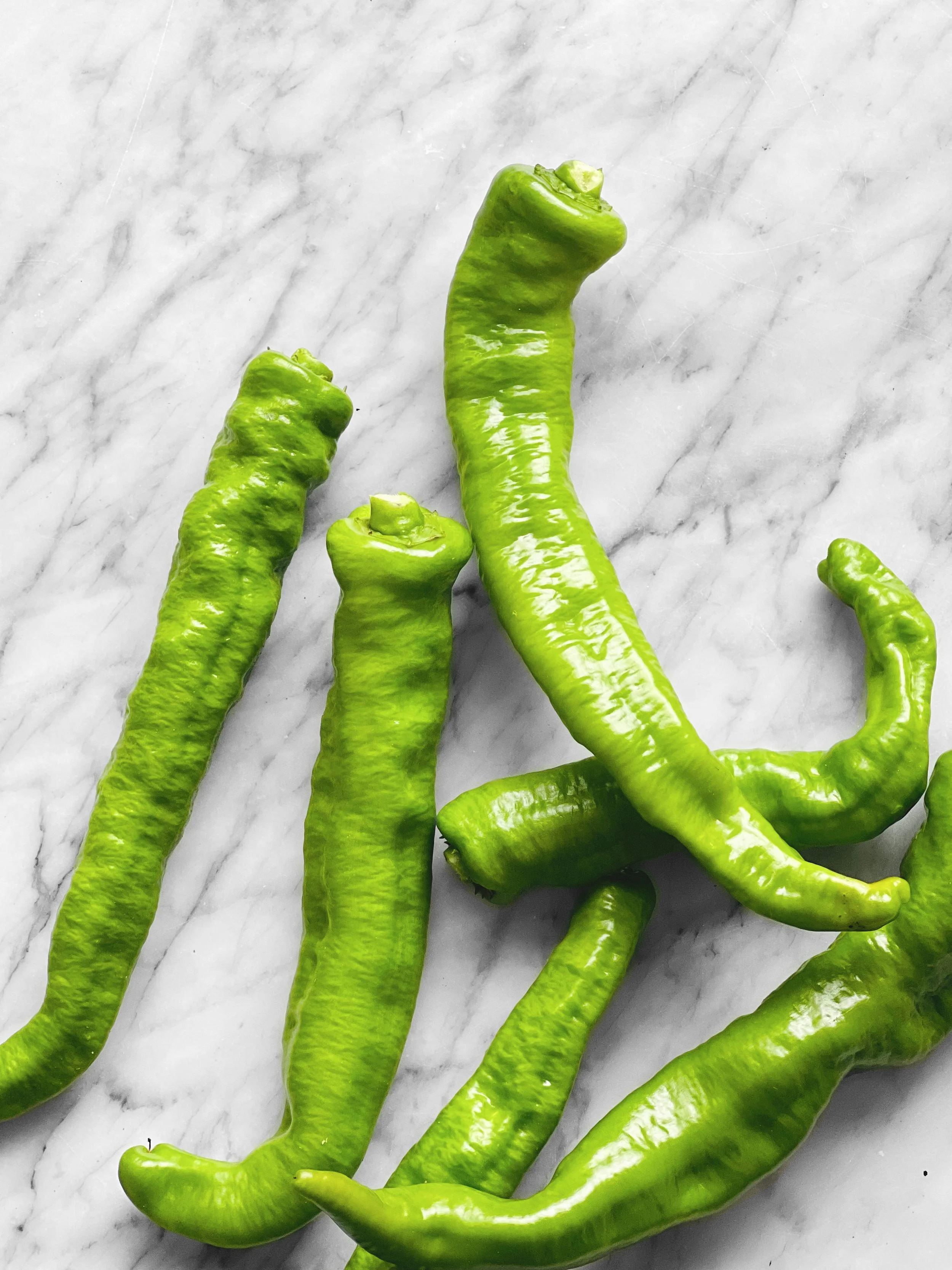 Pepperoncini : Le piment pepperoncini est une variété italienne de Capsicum annuum, reconnaissable à sa forme allongée et légèrement courbée, mesurant généralement entre 7 et 12 cm de long et de couleur vert tendre. Contrairement à ce que son nom pourrait laisser croire, il est très peu piquant, avec une intensité située entre 100 et 500 SHU, ce qui le rend accessible même aux palais sensibles.