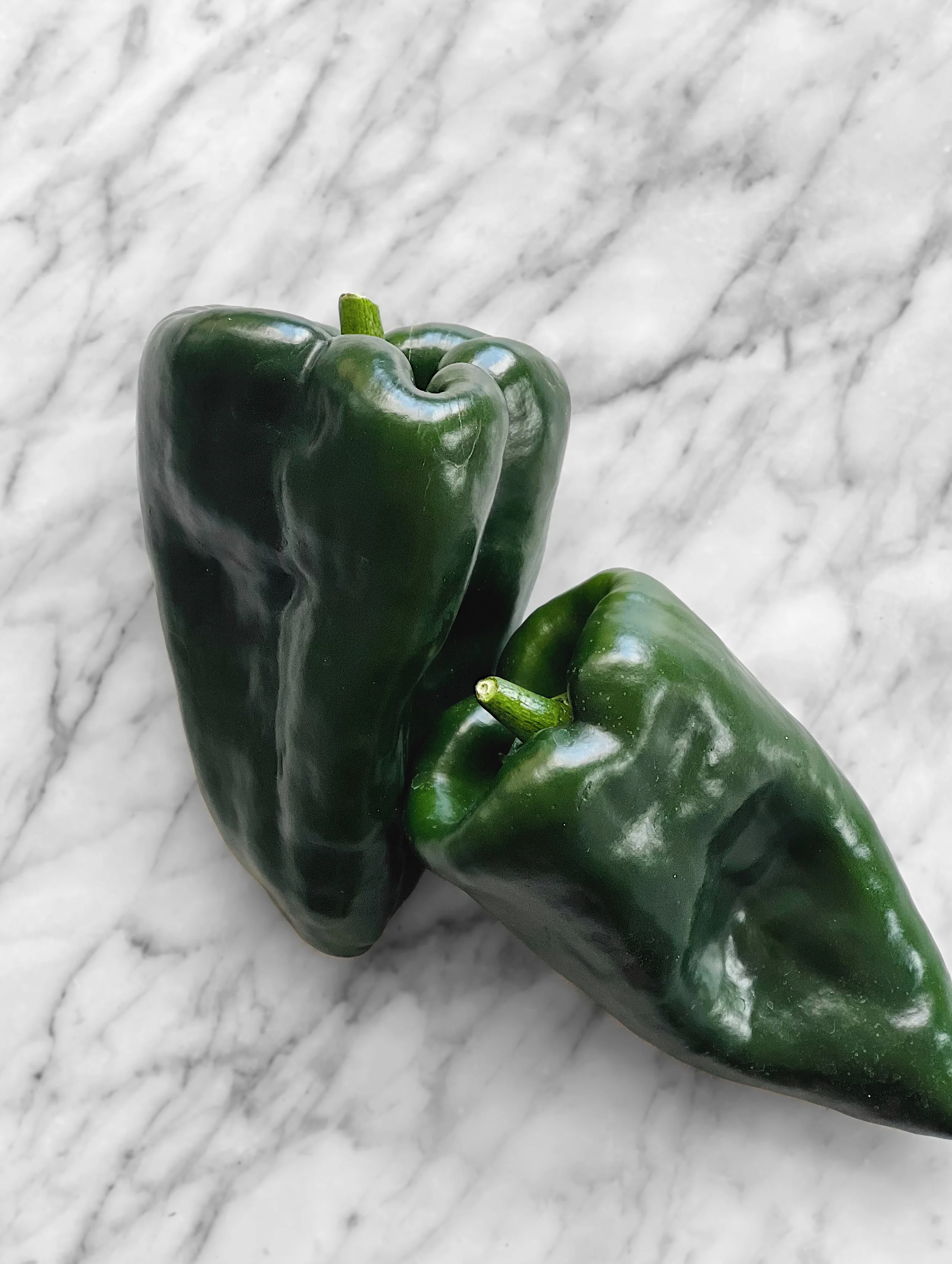 Poblano : Le piment poblano est une variété mexicaine de Capsicum annuum, originaire de l’État de Puebla. Reconnaissable à sa grande taille (jusqu’à 15 cm de long), sa forme légèrement triangulaire et sa couleur vert foncé, il est considéré comme un piment doux, avec une intensité modérée située entre 1 000 et 1 500 SHU. Lorsqu’il est frais, le poblano est souvent utilisé dans des plats emblématiques comme les piments farcis, les plats en sauces crémeuses aux accents fumés. Une fois séché, il prend le nom de piment ancho, très prisé pour sa saveur profonde et légèrement sucrée dans les sauces mole et les marinades.