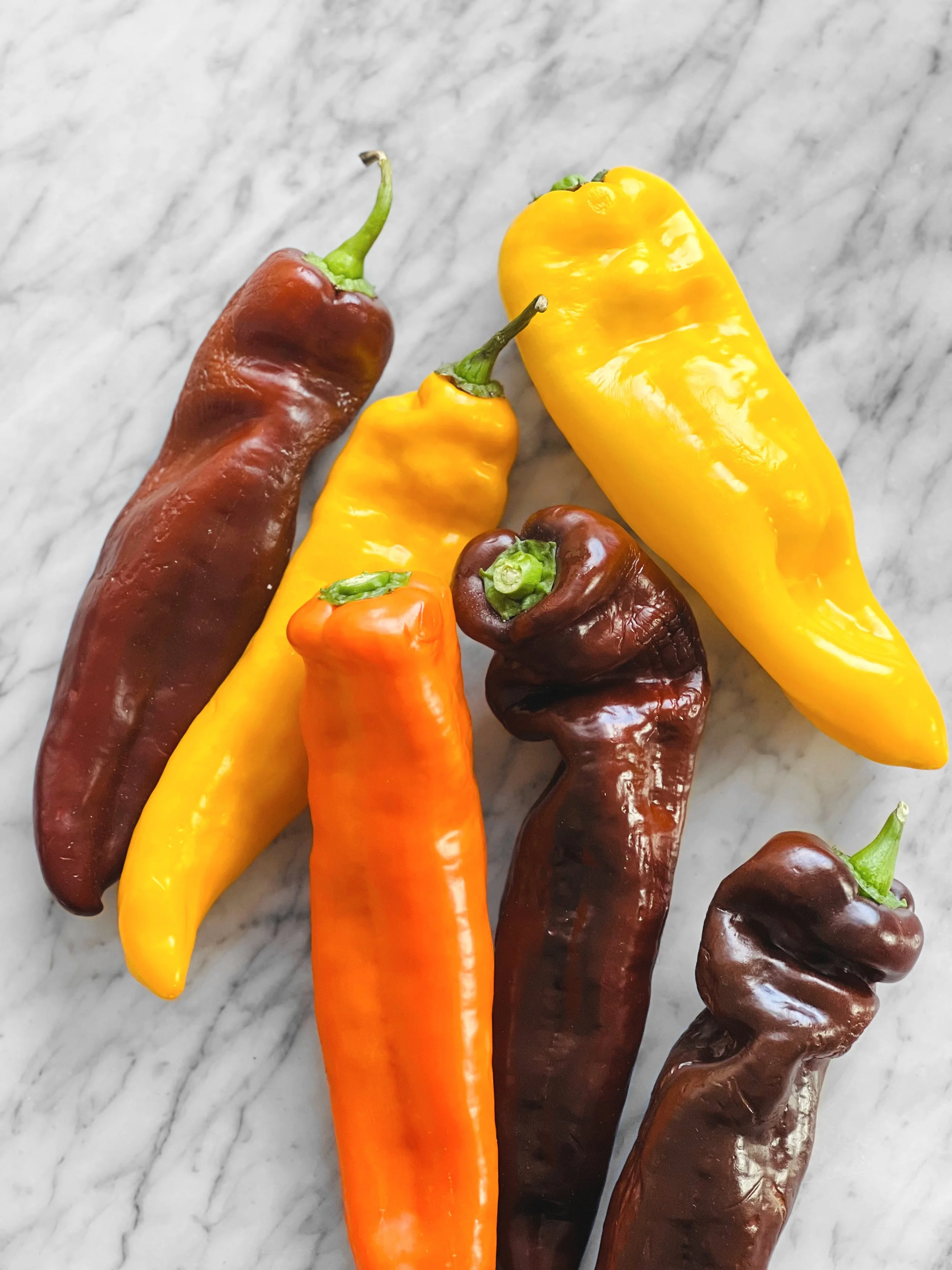 Piment banane & Hongrois : Le piment banane est généralement doux, avec une chaleur très légère (entre 0 et 500 SHU), ce qui le rend parfait pour les salades, les sandwichs, ou les marinades. Il est croquant, juteux et souvent utilisé comme garniture ou farci. Le piment cireux hongrois, ou Hot Wax, quant à lui, est un peu plus imprévisible. Sa force varie de 1 500 à 15 000 SHU, ce qui le place dans une catégorie de piquant moyen. Il est souvent utilisé dans les plats hongrois traditionnels, farci, grillé ou mariné. Sa texture cireuse et sa saveur légèrement sucrée en font un excellent choix pour les recettes qui demandent du caractère sans excès de brûlure.