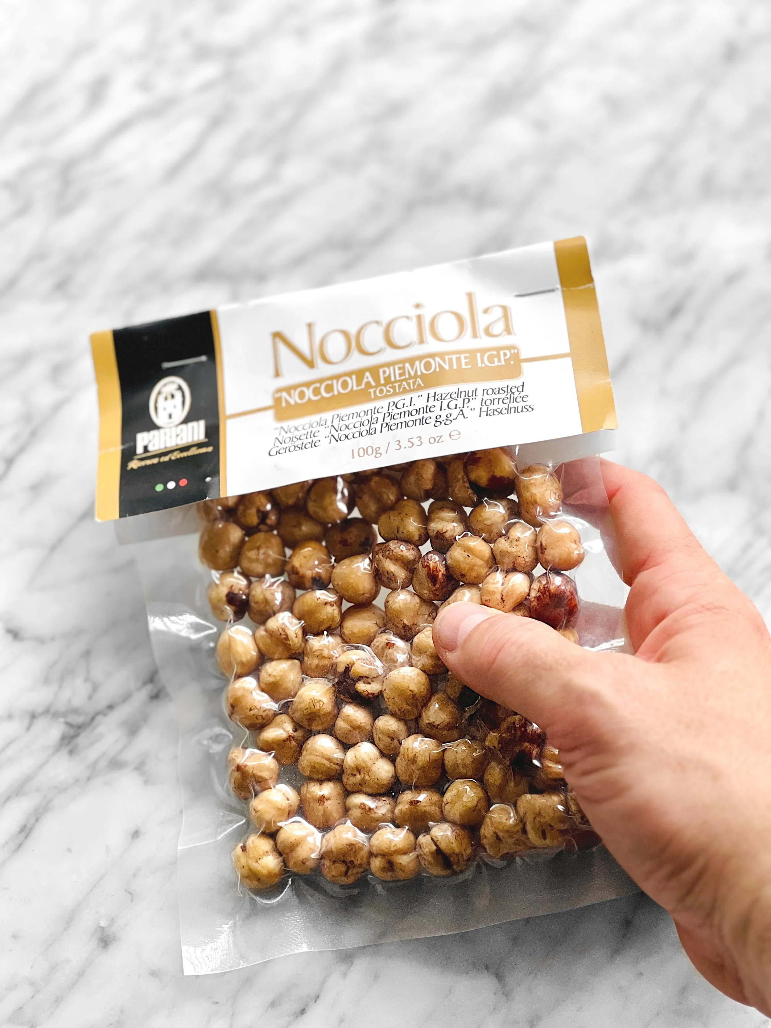 Oui, vous pouvez utiliser les noisettes que vous trouvez plus facilement ici. Prenez-les entières et faites les torréfier sur une plaque au four à 350°F (180°C) pendant 10 minutes en surveillant régulièrement, jusqu’à ce qu’elles soient légèrement dorées. Retirer le plus possible de petites peaux en les frottant dans un linge sec.