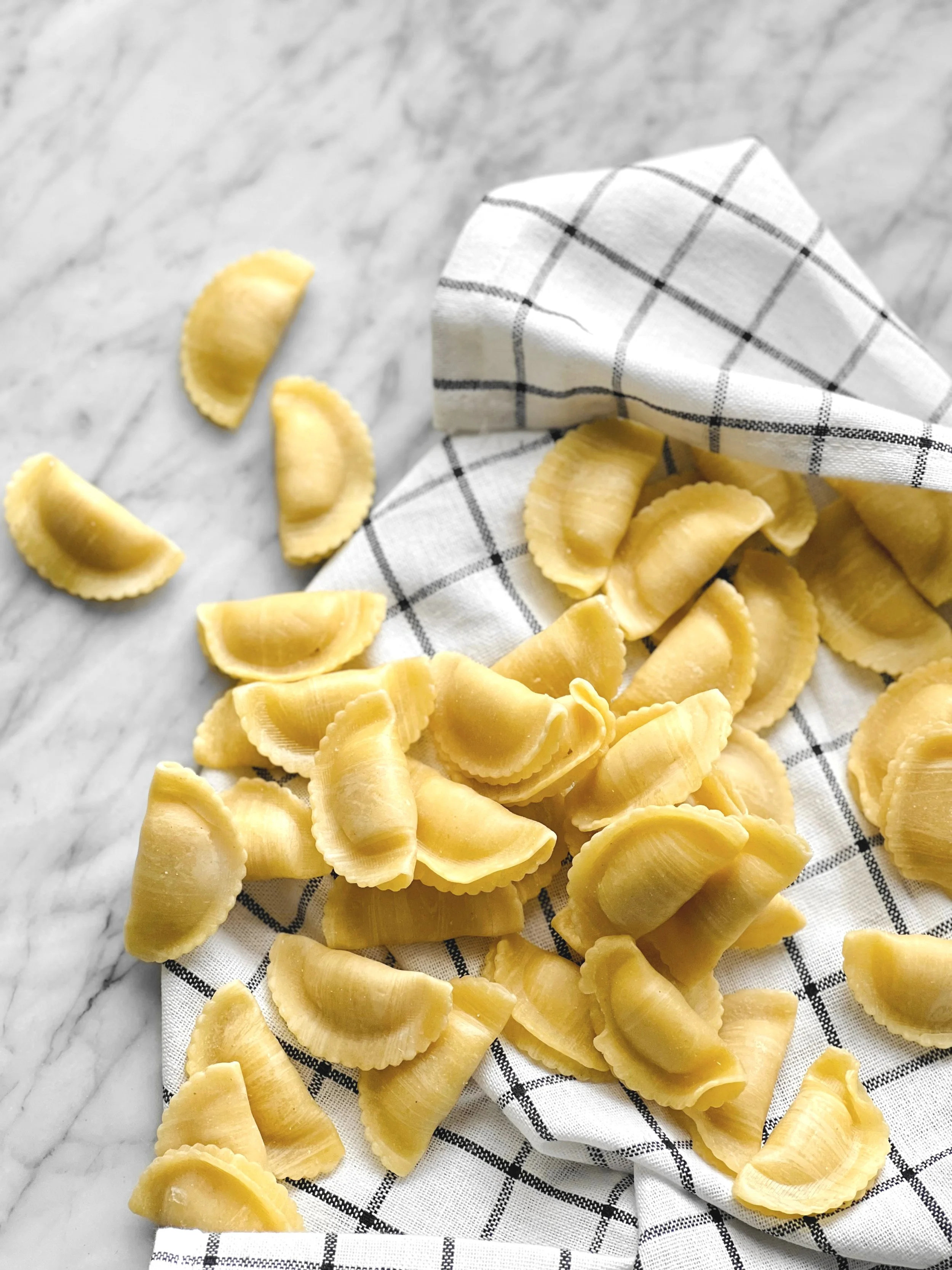 Les agnolotti (ou agnoletti) sont également une grande spécialité de la région du Piémont qui tire son nom de son inventeur. Ces petits ravioli rectangulaires ou en demi-lune sont traditionnellement farcies de viande rôtie, de légumes ou de fromage, selon les saisons et les traditions familiales. Heureusement les boutiques spécialisées en produits italiens ou en pâtes fraîches en proposent souvent et pas besoin d’aller jusqu’en Italie pour en trouver. À moins que… SI vous avez la patience et la dextérité, vous pouvez vous lancer dans leur fabrication! Mais tant qu’à moi, je me tourne sur des agnolotti du commerce.