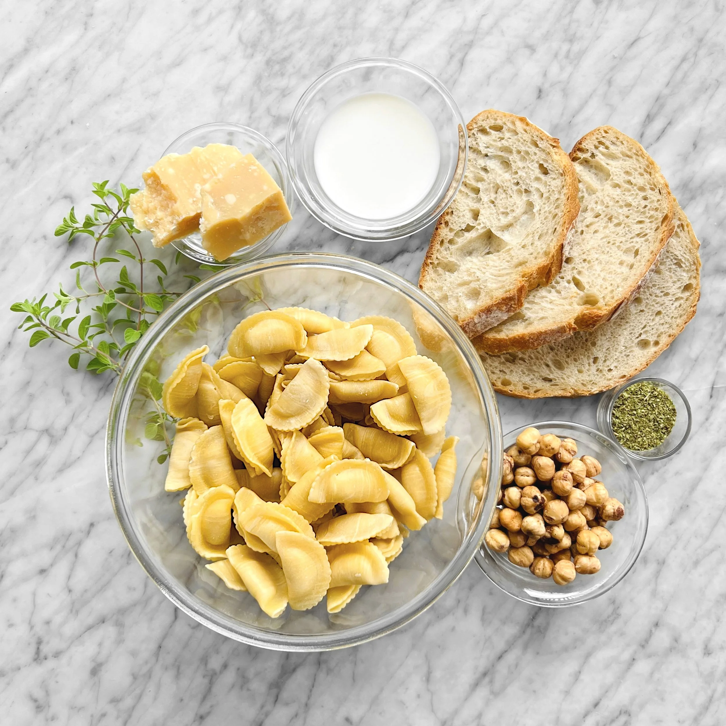 Tremper la mie de pain dans le lait, puis mélanger avec les noisettes, le parmesan, l’origan séché ou la sauge et le parmesan dans le contenant d’un robot culinaire. Mixer le tout de façon à obtenir un mélange homogène et finement granuleux. Alors que le moteur tourne toujours, ajouter graduellement l’huile d’olive en un mince filet, puis procéder de la même façon avec l’eau. Assaisonner de sel et de poivre au goût.
