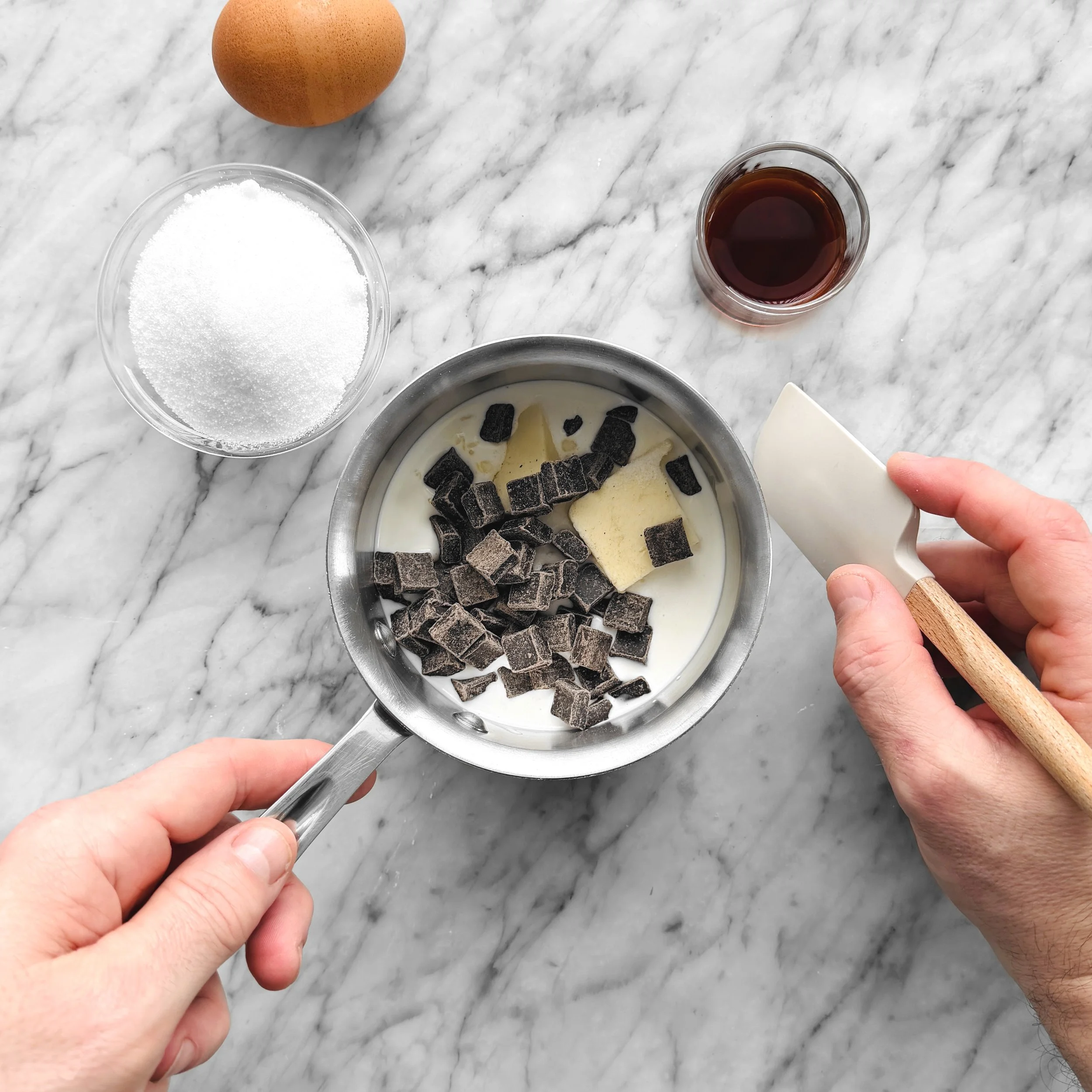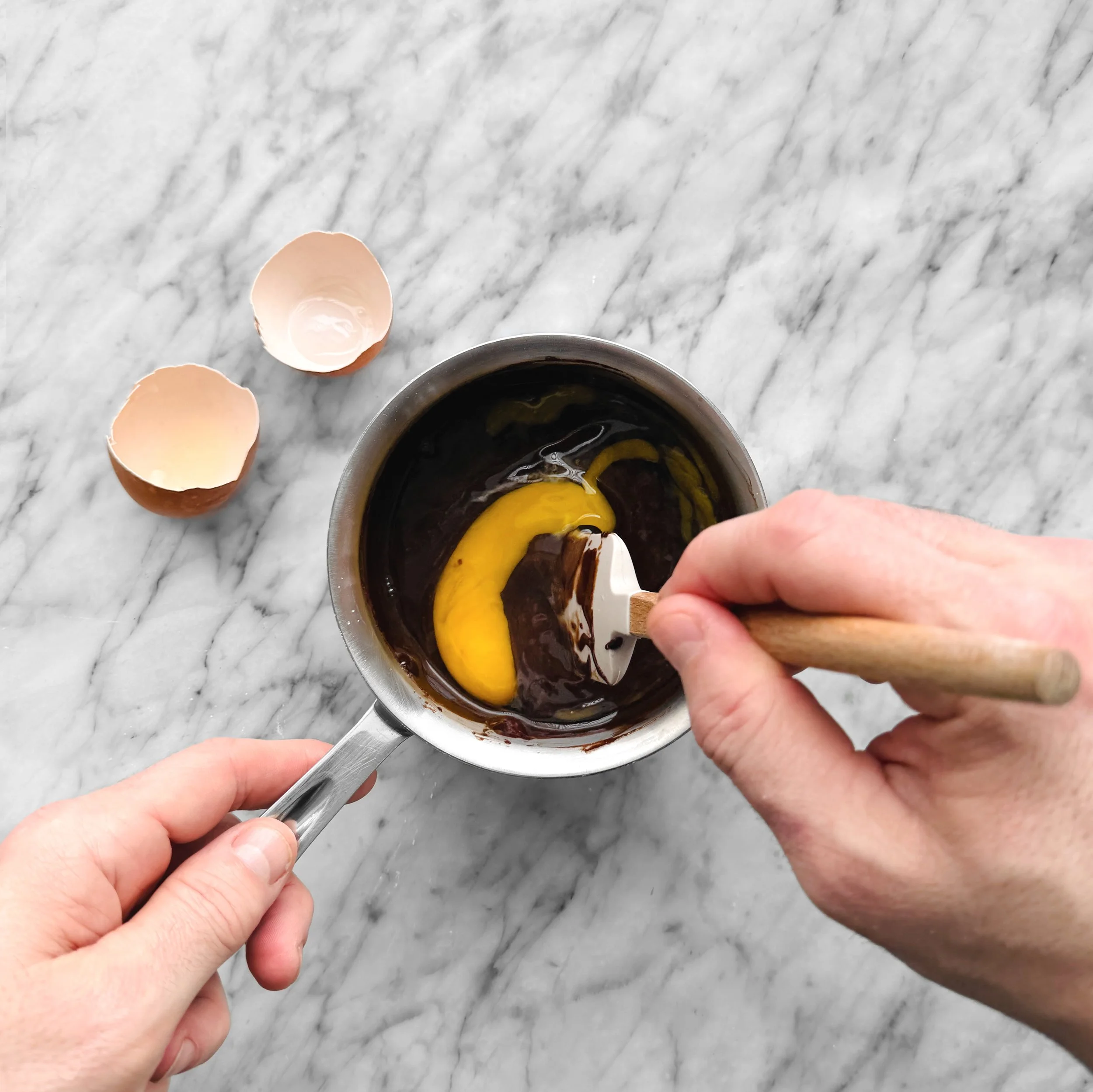 Dans une petite casserole, chauffer le crème et y faire fondre le beurre et le chocolat. Ajouter le sucre et le sel et faire également fondre. Laisser tempérer avant d’incorporer l’œuf en mélangeant bien. Mettre la ganache dans une petite poche à douille si désiré. Réserver.