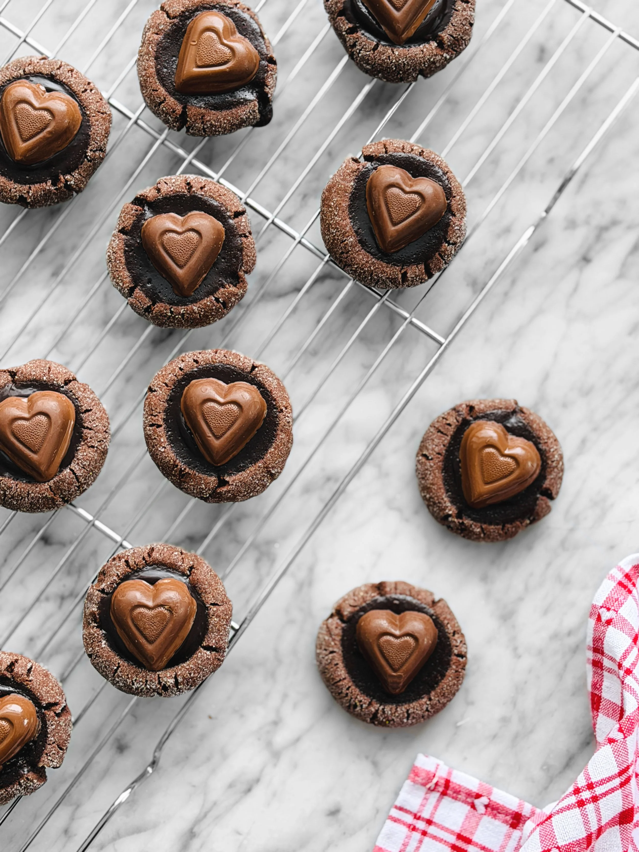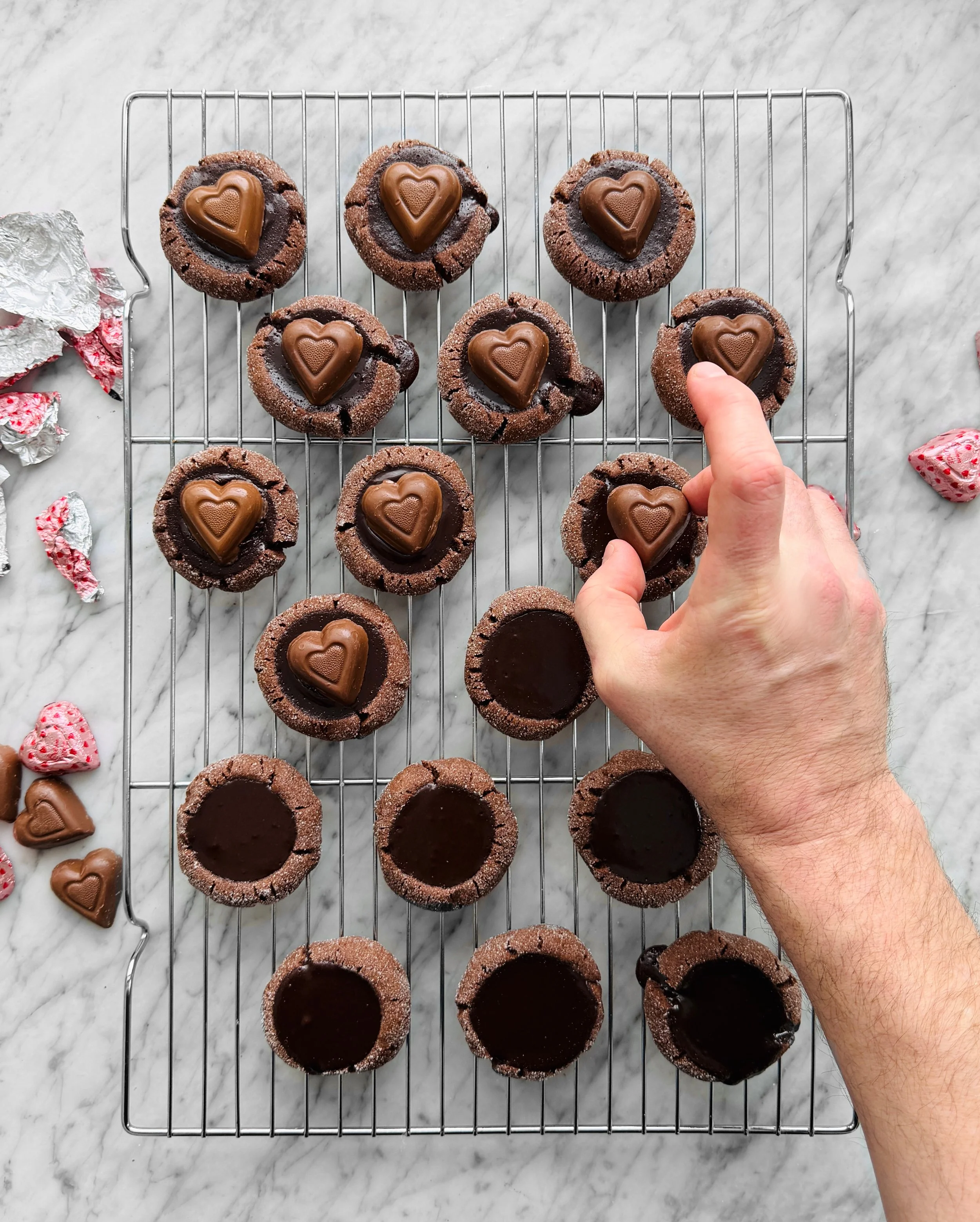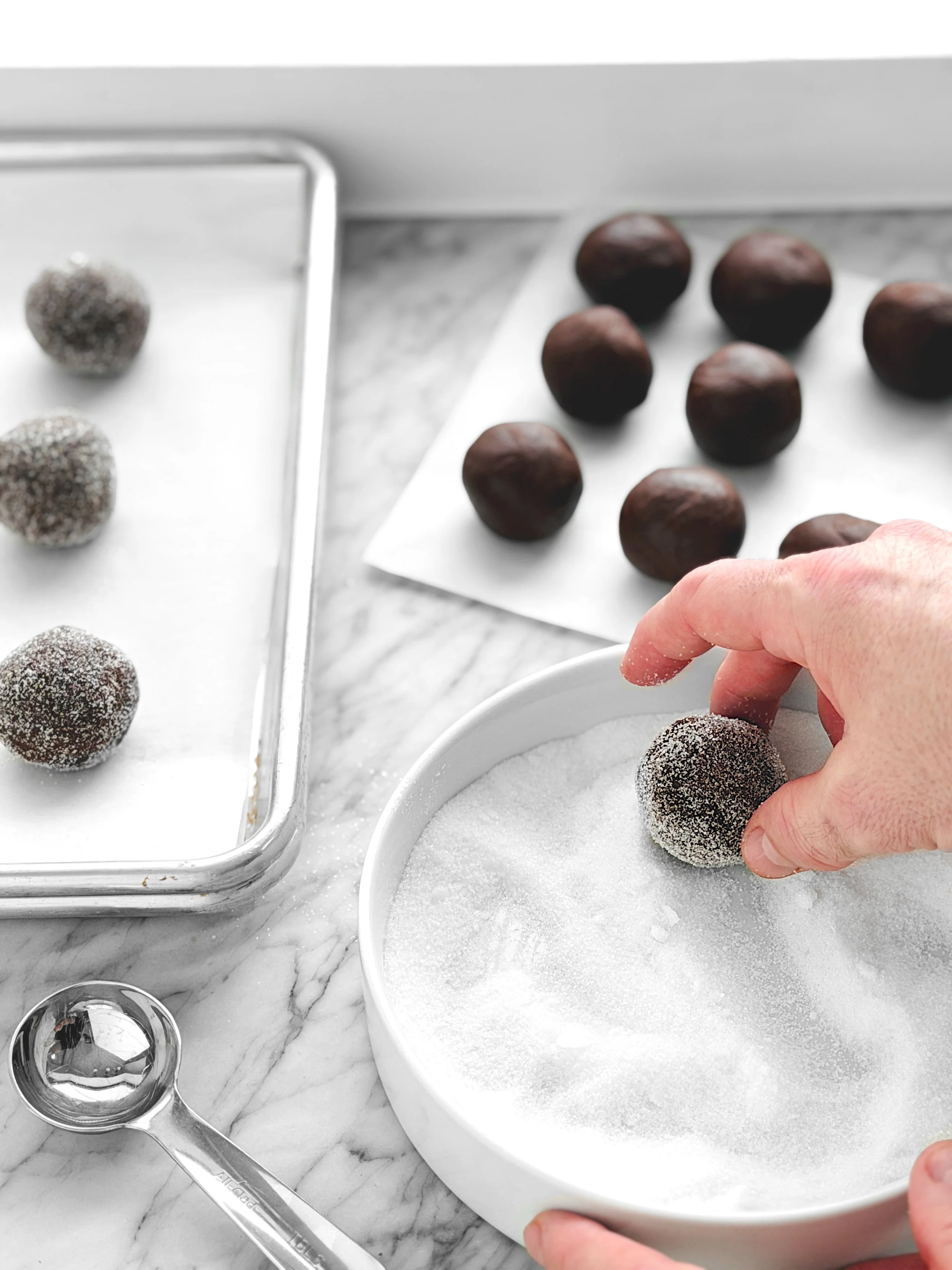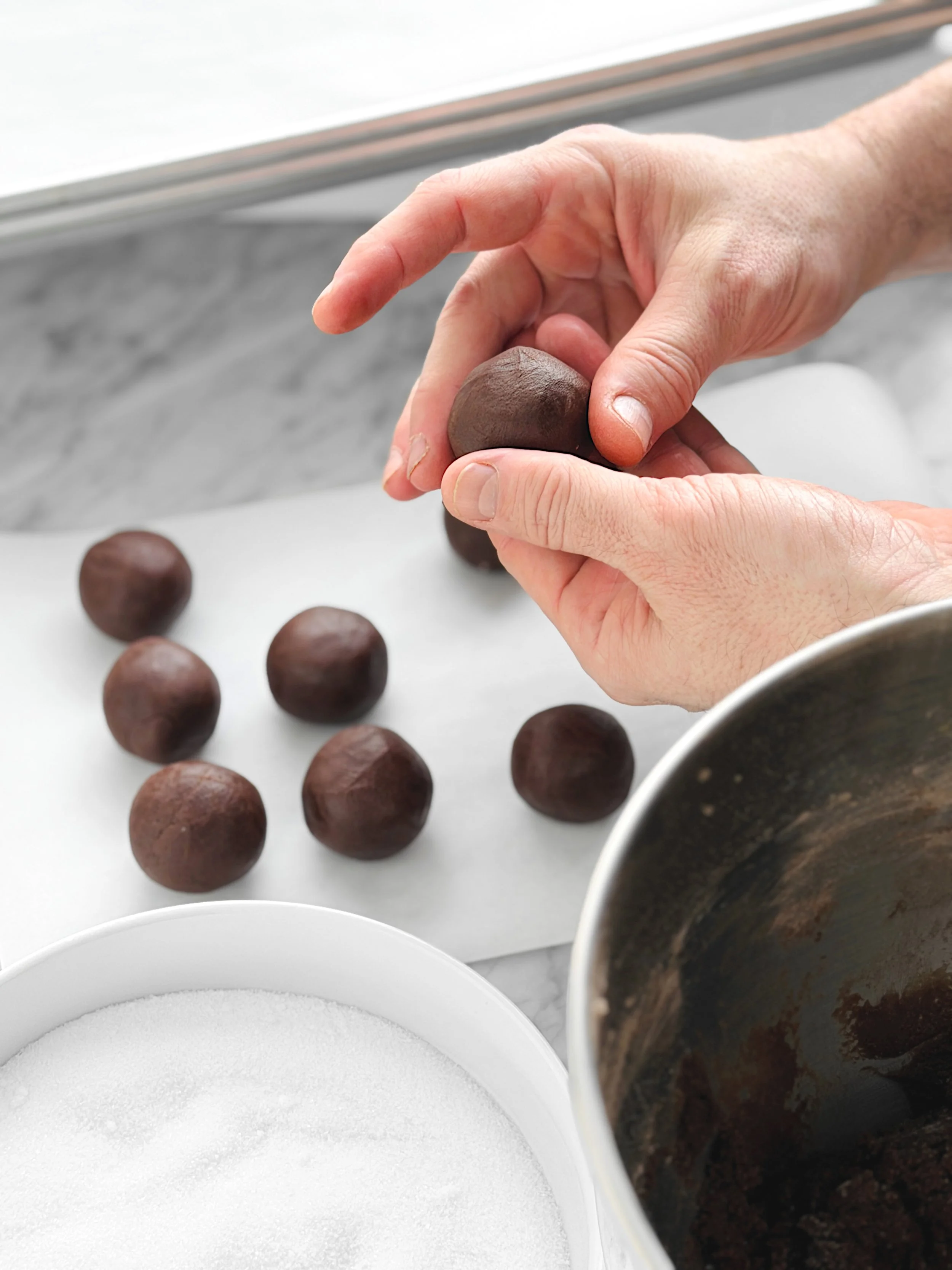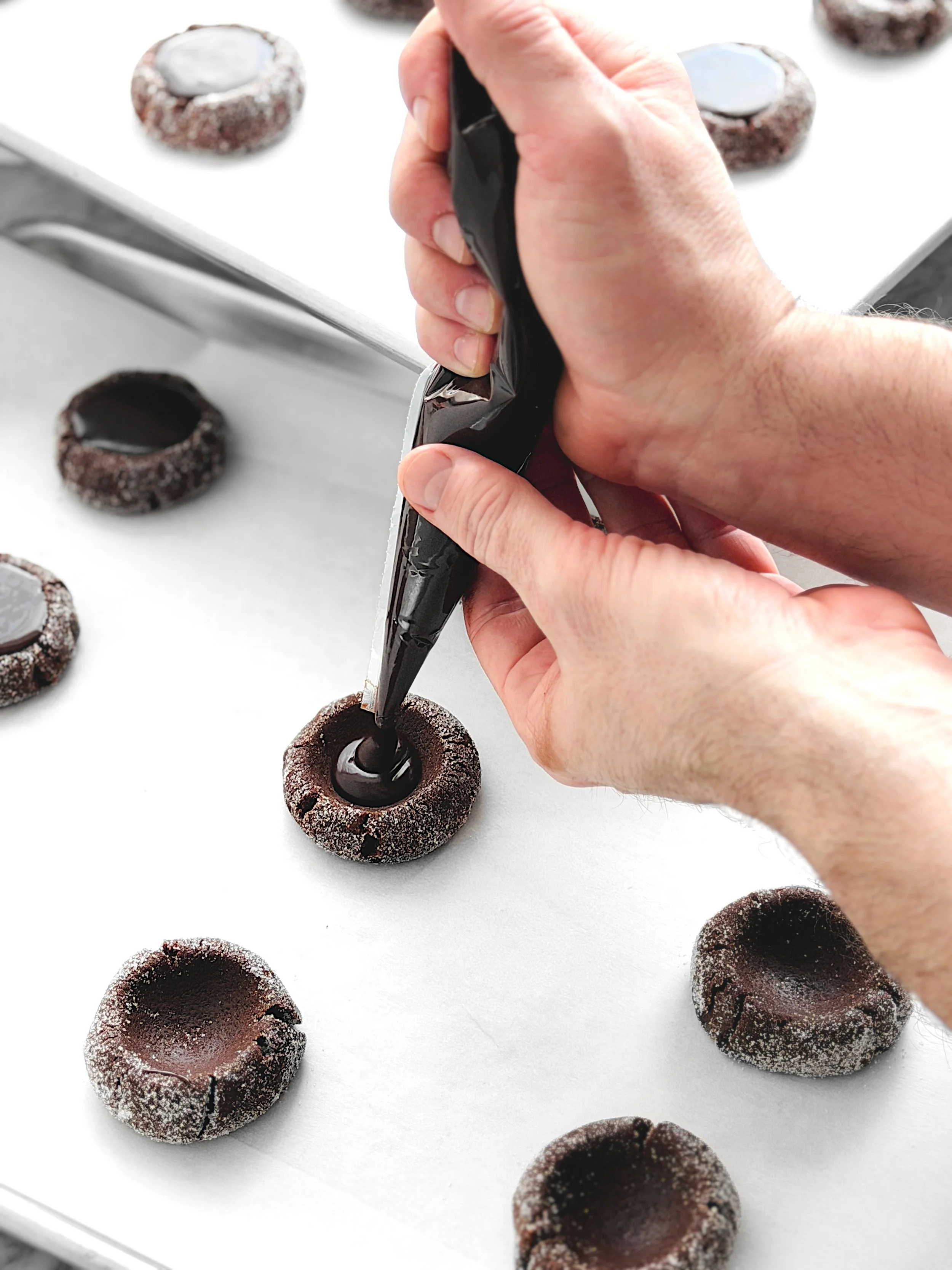 À la main, former des boules avec environ 2 c. à soupe de pâte. Rouler ensuite les boule dans le sucre granulé et disposer sur les plaque. Avec le dos d’une cuillère bien ronde, presser les boules pour créer une cavité. Remplir les cavité de ganache au chocolat. Cuire au four de 8 à 12 minutes.
