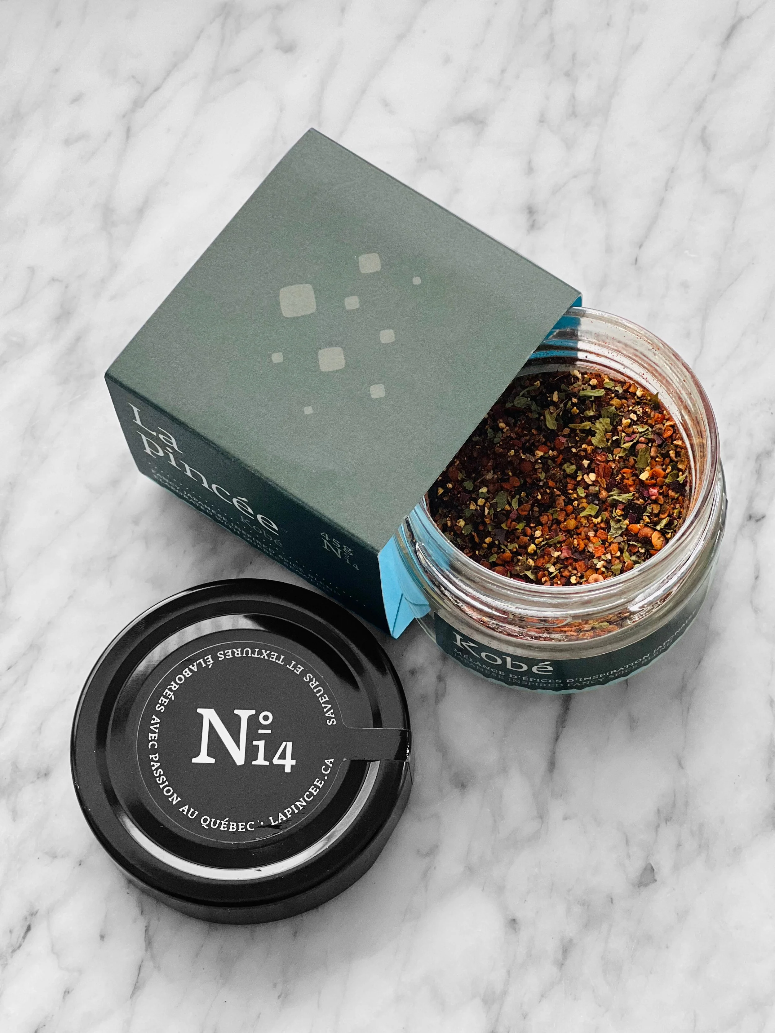 La pincée Kobé N°14 est un mélange d'épices d'inspiration japonaise qui n’est pas sans rappeler le classique mélange shichimi togarashi, mais en version locale. Il composé de poivre aromatique et légèrement relevé aux subtils arômes d’agrumes avec une texture unique et un caractère distinctif grâce aux quatre variétés de flocons d’algues provenant de haute Gaspésie. Une belle façon d’intégrer ce légume de mer bien de chez nous à votre menu. Ce mélange est né d’une collaboration entre les artistes de La pincée et un savant cueilleur d’algues établi en Gaspésie.