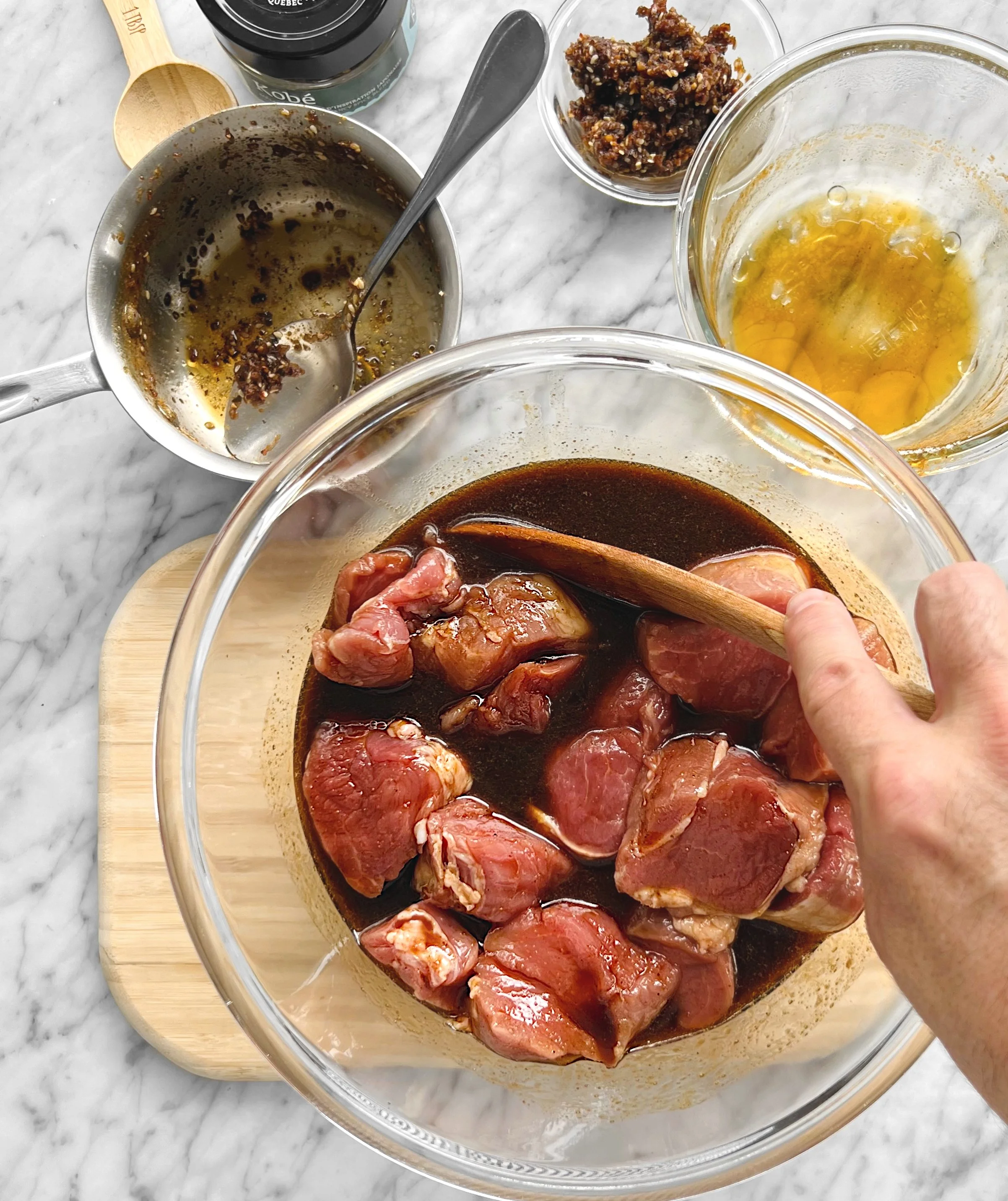 1 - Pour la marinade/sauce : À l’aide d’un mortier ou d’un moulin à épices, moudre les graines de sésame grillées grossièrement. Déposer dans une petite casserole et ajouter le reste des ingrédients y compris les épices La pincée Kobé N°14, l’oignon, l’ail et le gingembre râpés. Porter le tout à ébullition et laisser mijoter le temps de faire fondre le sucre tout en remuant. Fermer le feu et laisser infuser et tempérer quelques minutes.