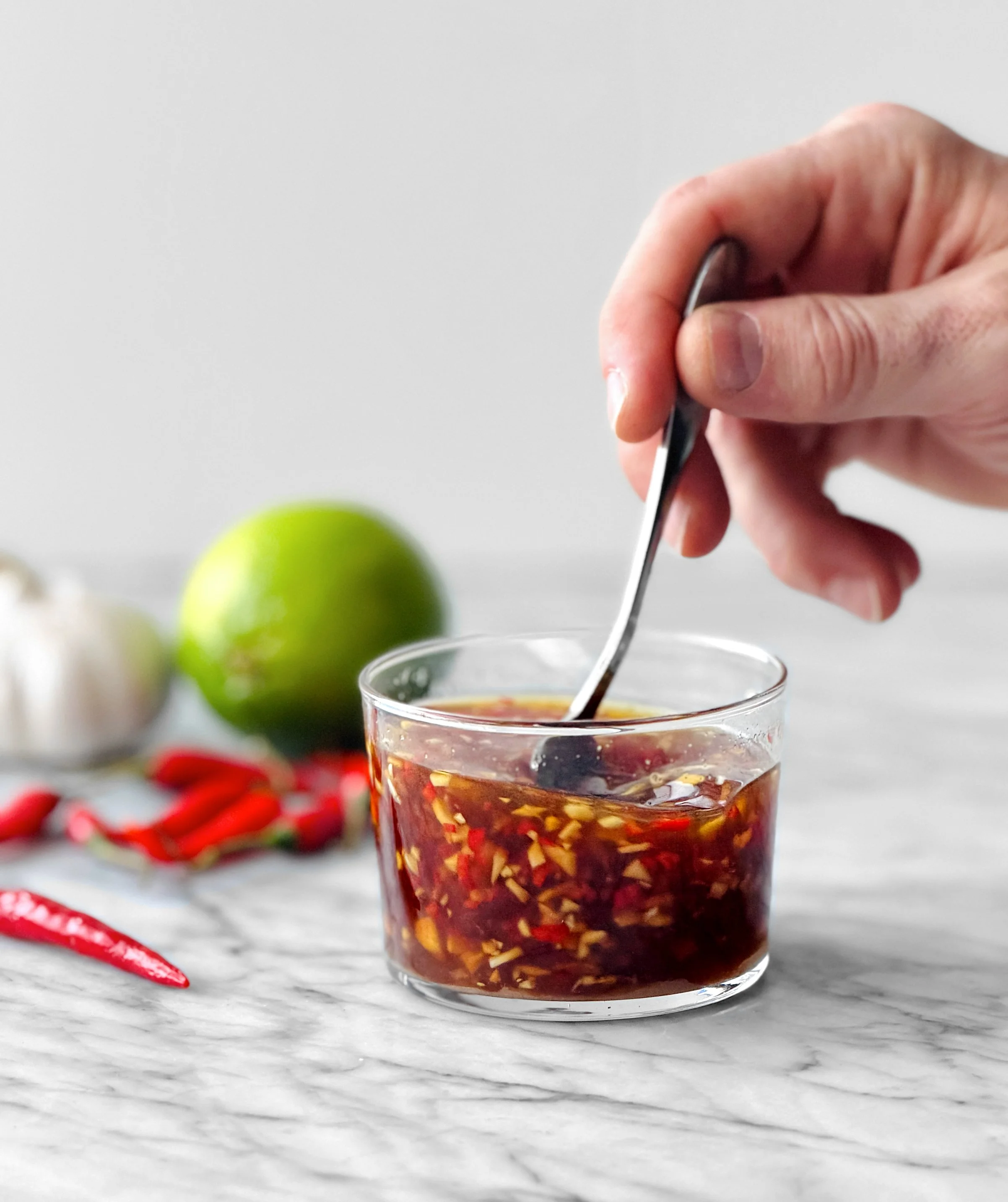 Traditionnellement, le Chả Cá se sert avec une petite vinaigrette qui vient ajouter du kick et une belle chaleur au plat. Le Nuoc Cham se prépare en 2 minutes et je vous encourage à la faire si le piquant ne vous fait pas peur. Une petite c. à thé par portion sera suffisante. Voici la recette :