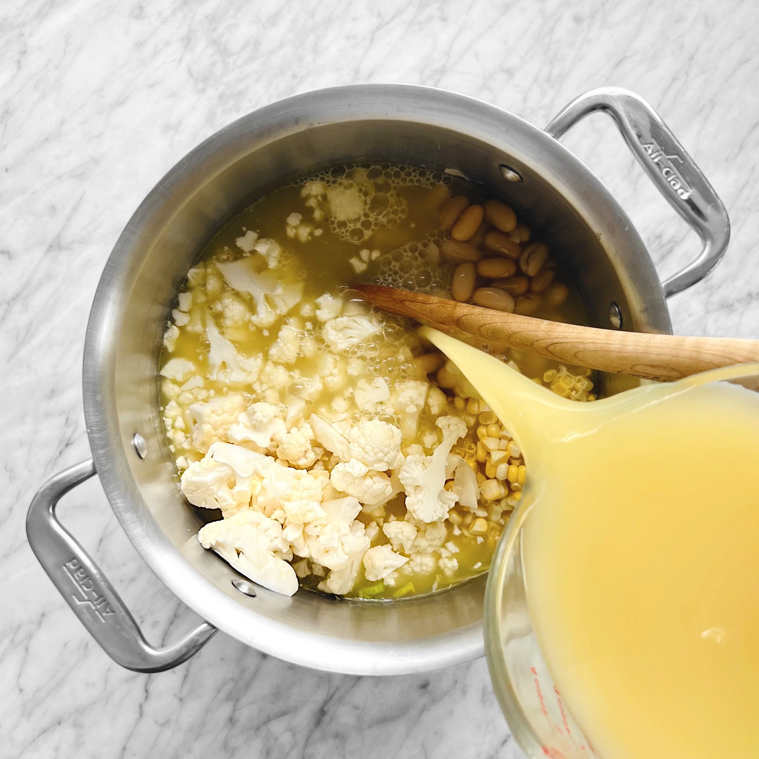Dans une casserole, suer le poireau et l’ail à feu moyen-élevé dans l’huile d’olive pendant 4 minutes. Ajouter les fleurettes de chou-fleur, le maïs, les haricots blanc et le bouillon. Porter à ébullition puis laisser mijoter à feu doux à couvert pendant 15 minutes ou jusqu’à ce que le chou-fleur soit tendre.
