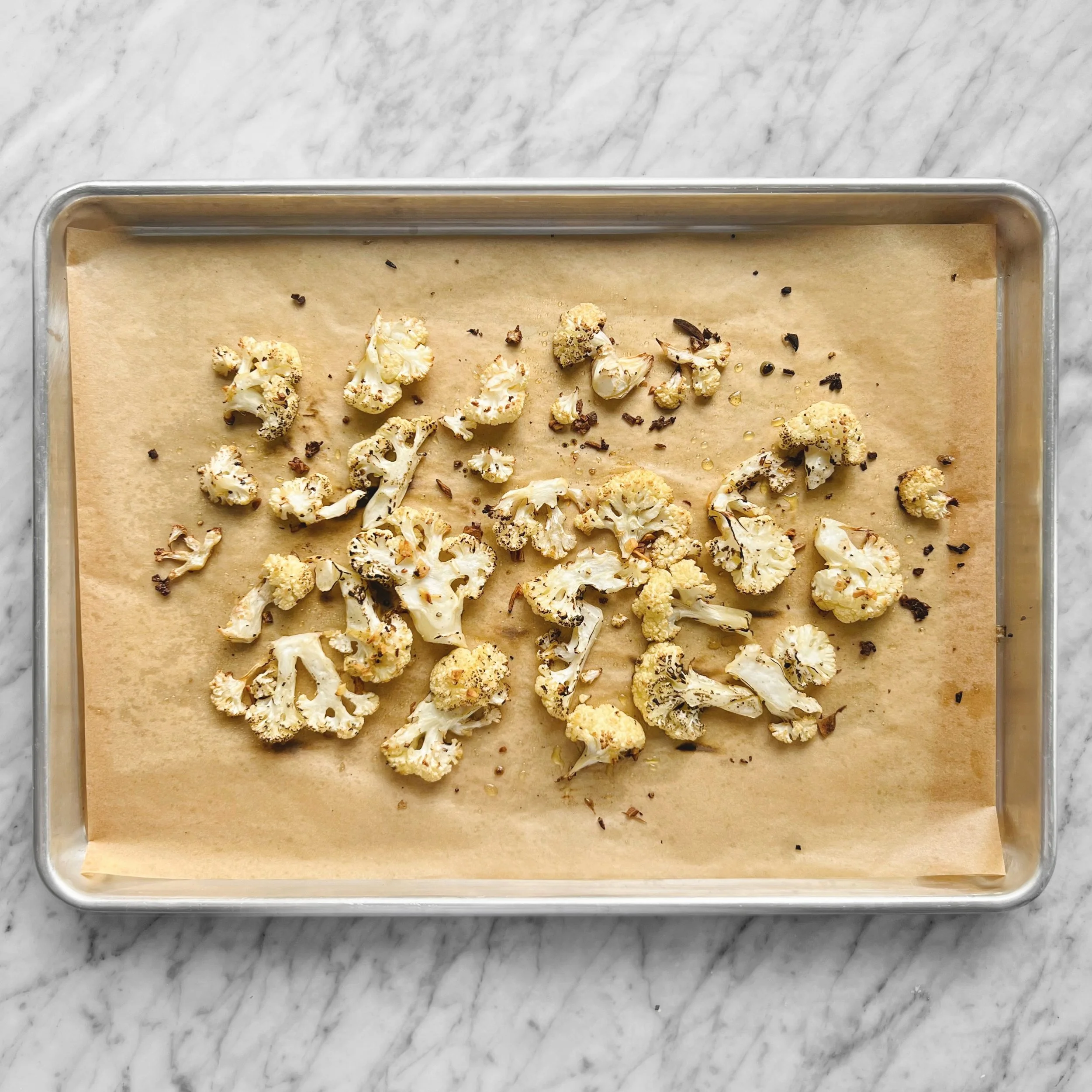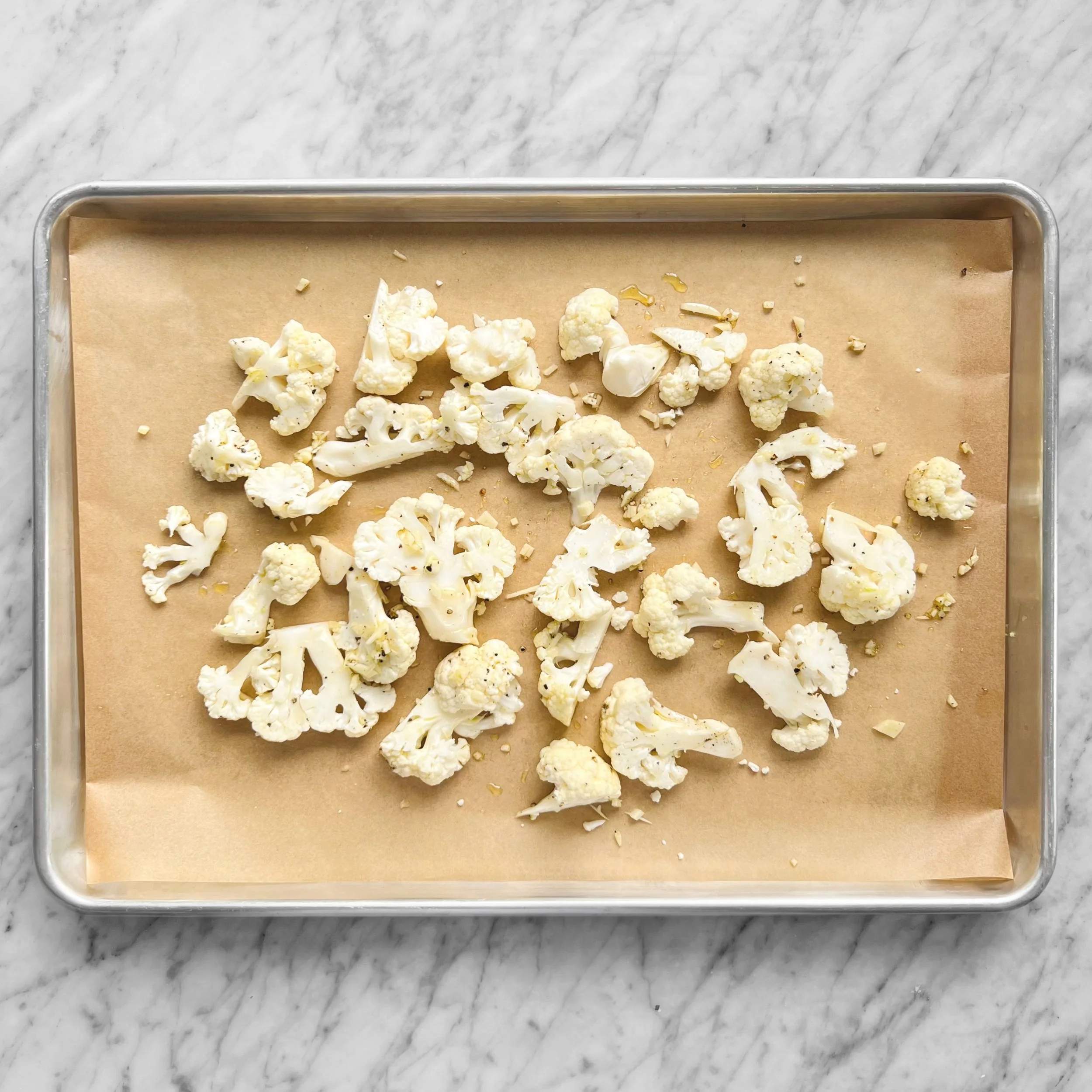 Préchauffer le four à 400°F et chemiser une grande plaque avec un papier parchemin. Étendre la moitié des fleurettes de chou-fleur avec 1 gousse d’ail hachée et arroser d’un trait d’huile d’olive et bien mélanger pour répartir uniformément. Saler, poivrer et rôtir au four 20 minutes. Terminer la cuisson sous le grill (broil) 3-4 minutes pour bien colorer.