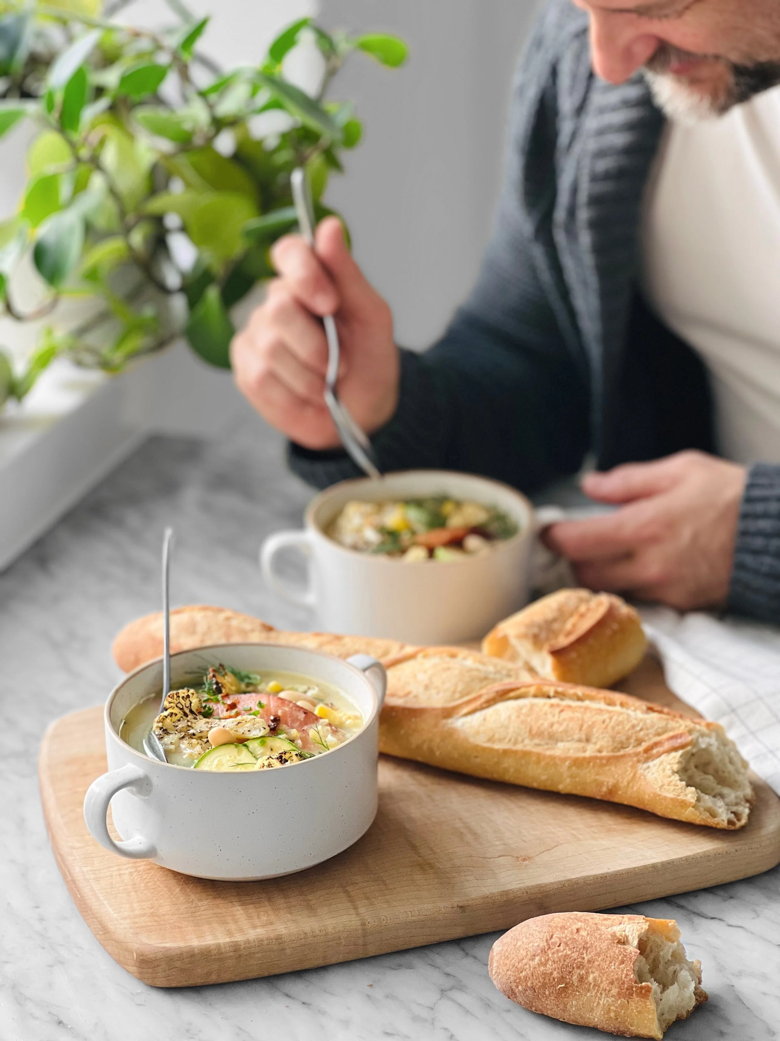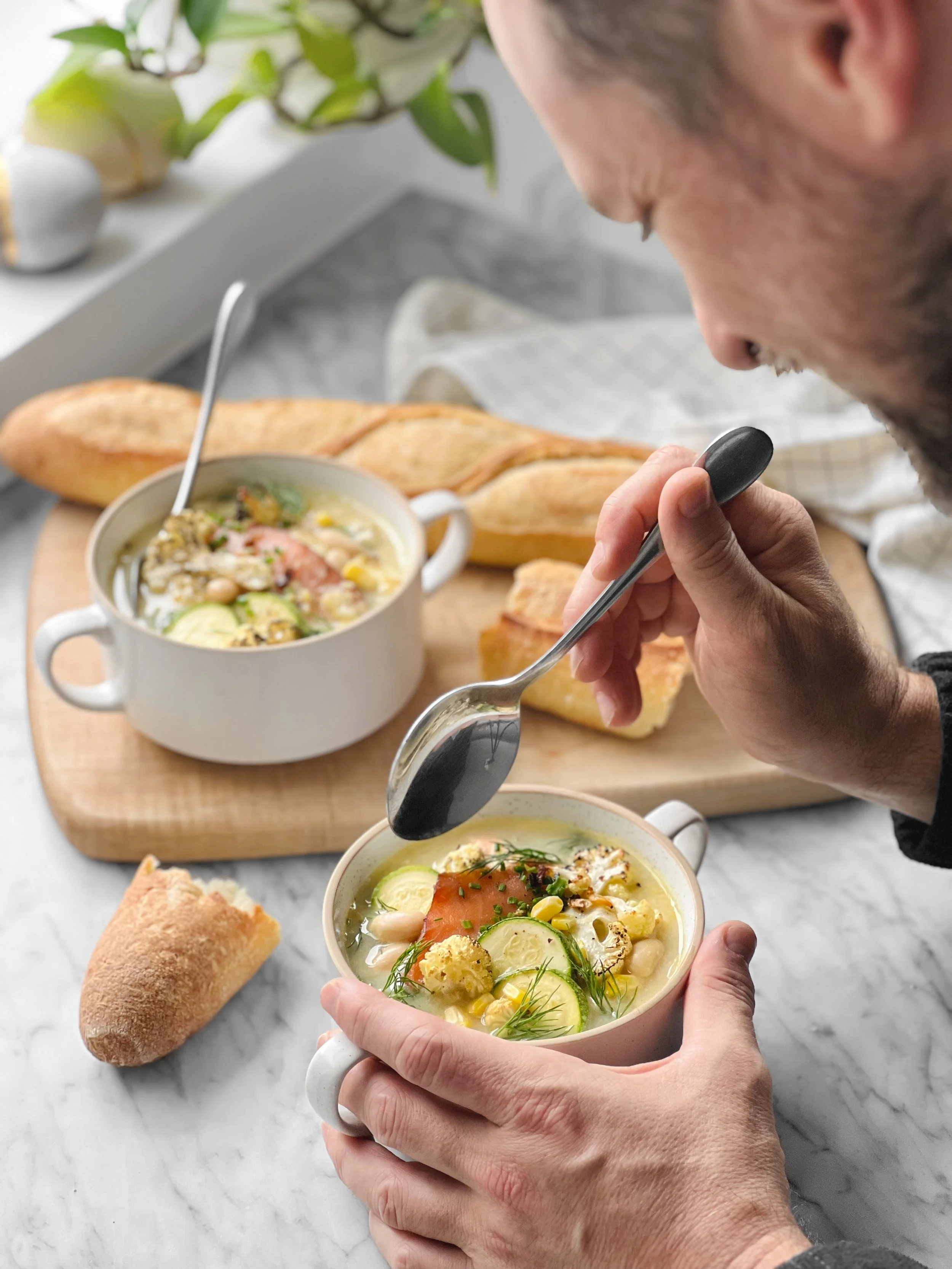 soupe - soupe-repas - poireau - maïs - chou-fleur - ail - courgettes - saumon fumé - haricots - légumineuses - aneth - ciboulette - exclusivité