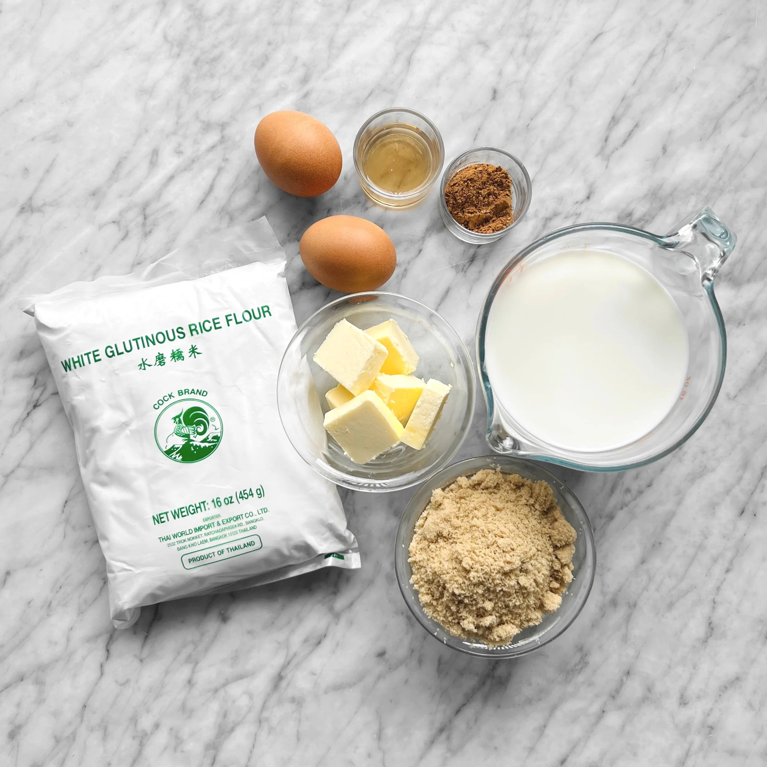 En effet, ces petits gâteaux trouvent leurs origines dans les traditions culinaires asiatiques, notamment coréennes et japonaises, où le riz gluant est travaillé pour obtenir cette texture contrastée. Ces délices combinent deux éléments clés : le riz gluant (ou farine de riz gluant) et le beurre, souvent utilisés pour enrichir la saveur et favoriser la caramélisation en surface. On peut ensuite aromatiser ces gâteaux avec des essences et même en variant le type de sucre utilisé. L’intérieur très tendre et fondant n’est pas sans rappeler la texture des fameux mochis japonais. D’ailleurs au Japon il n’est pas rare qu’on appelle ces gâteaux des mochis grillés. Voilà! J’entre dans la vague!