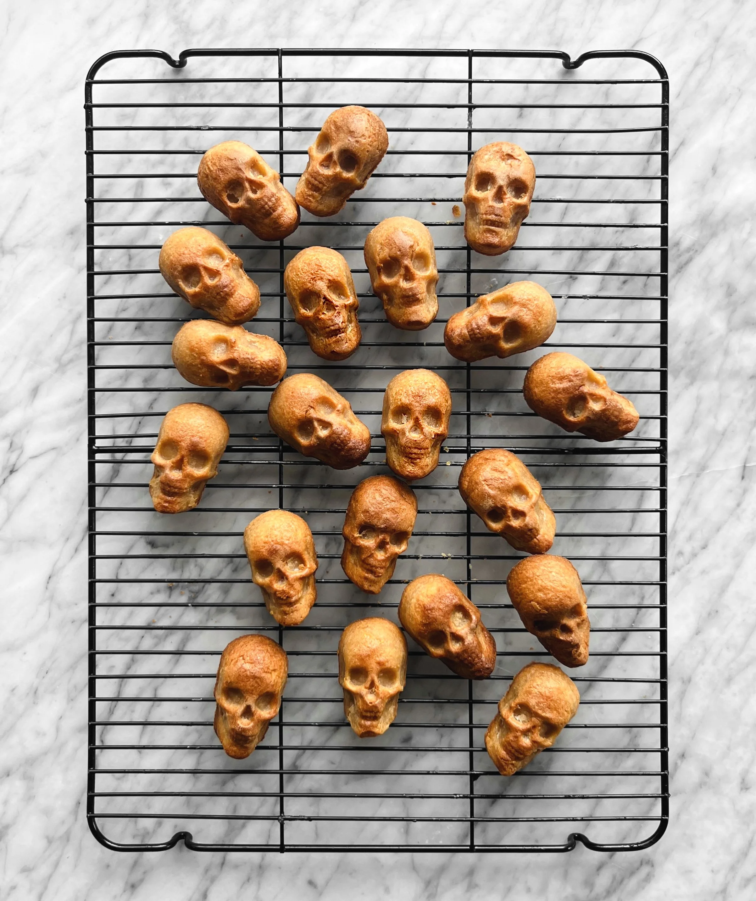 Rendement : Pour vous donner une idée de la quantité de préparation, en utilisant les moules à cannelés qui sont un peu plus profonds que des moules à muffins standard, j’ai pu faire une seule fournée, la recette donne très exactement 12 cannelés. Avec les têtes de mort, j’ai dû diviser la préparation en deux et procéder à deux fournées pour 40 gâteaux en version minis… de quoi gâter le voisinage!