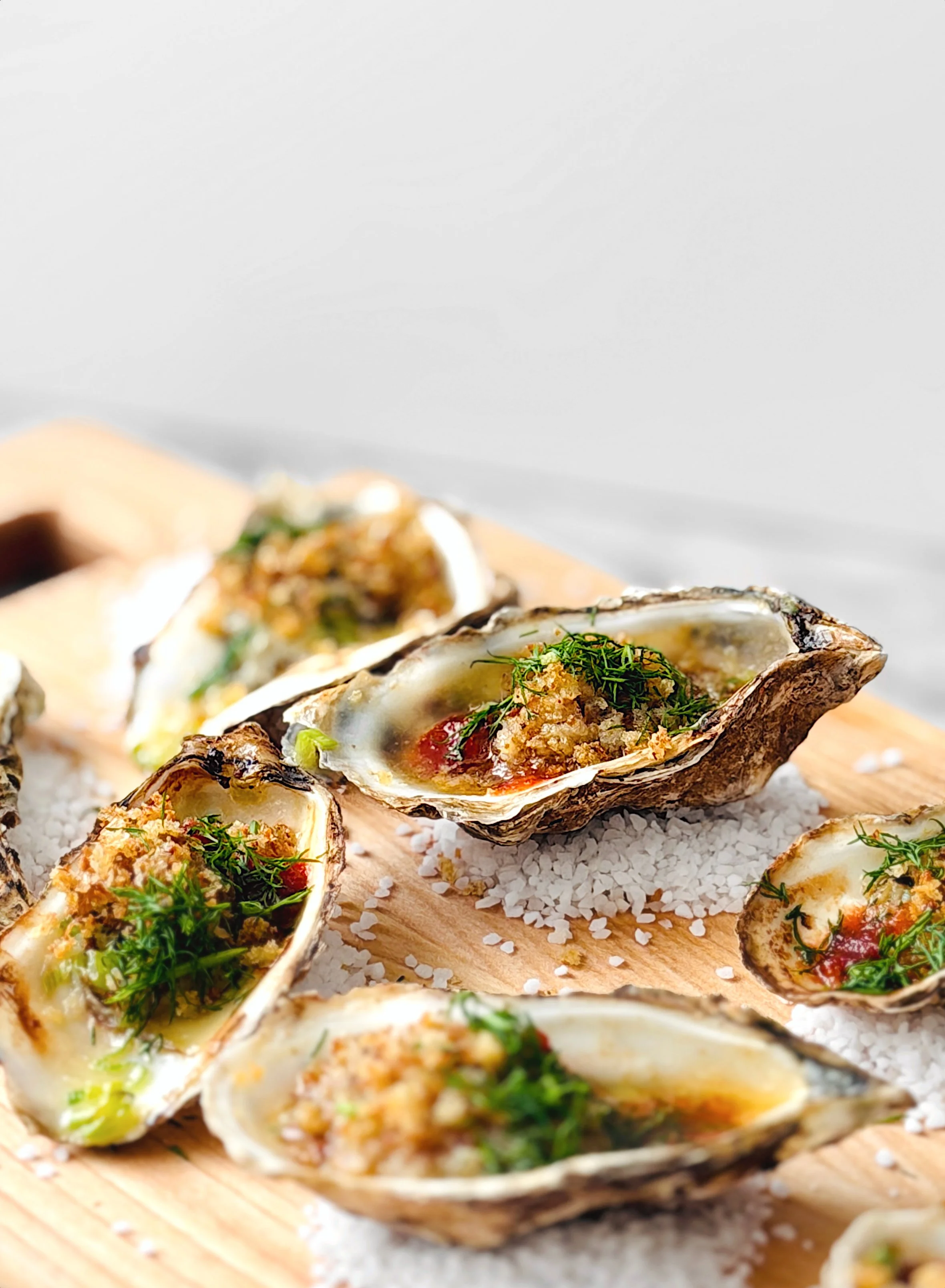 __ SUGGESTION #2 : HUÎTRES CHAUDES, BEURRE À L’AQUAVIT ET CHAPELURE GRILLÉE
