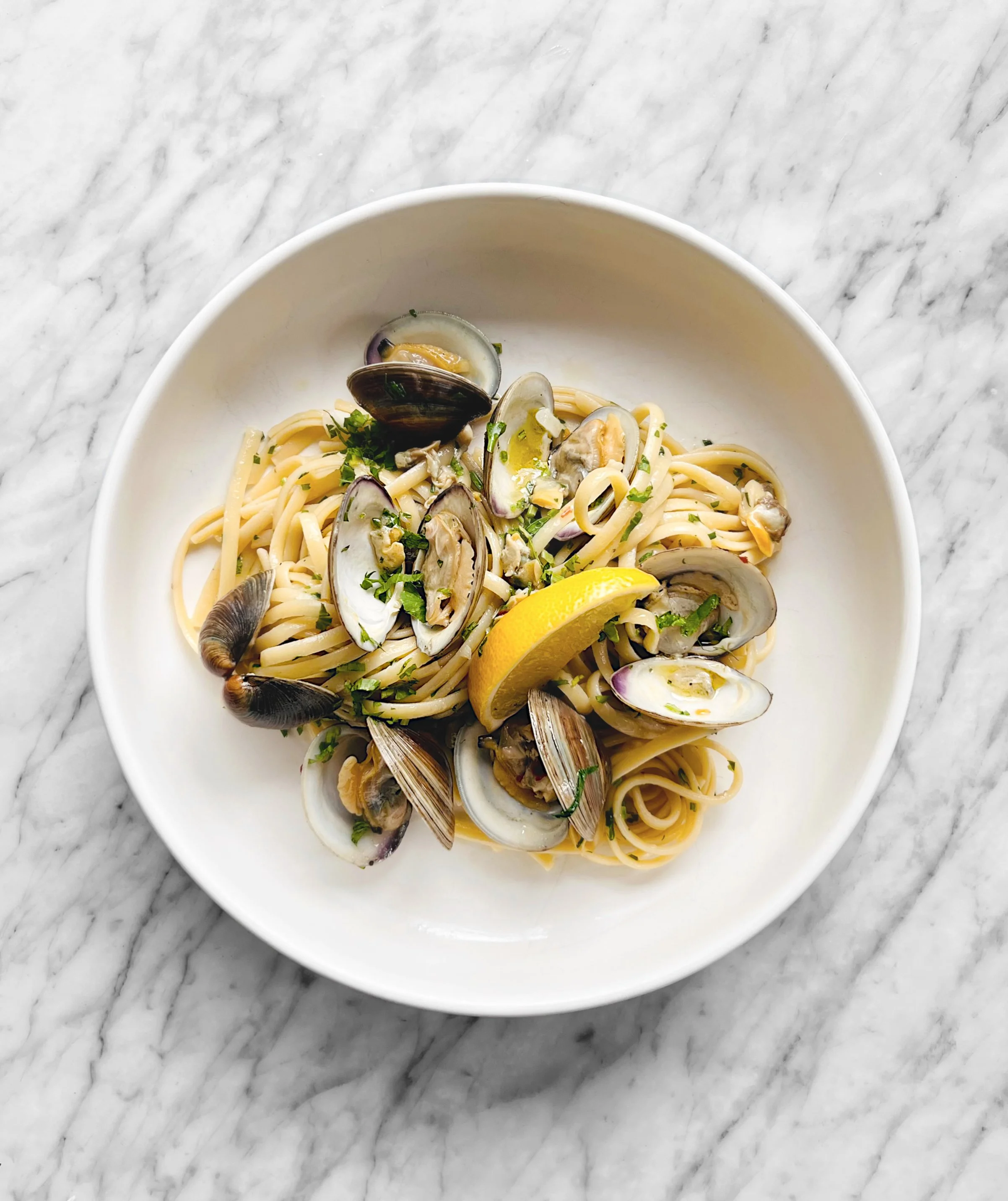pâtes - pâtes longues - fruits de mer - coquillages - mollusques - palourdes - spaghetti - vin blanc - citron - ail - persil - cuisine italienne