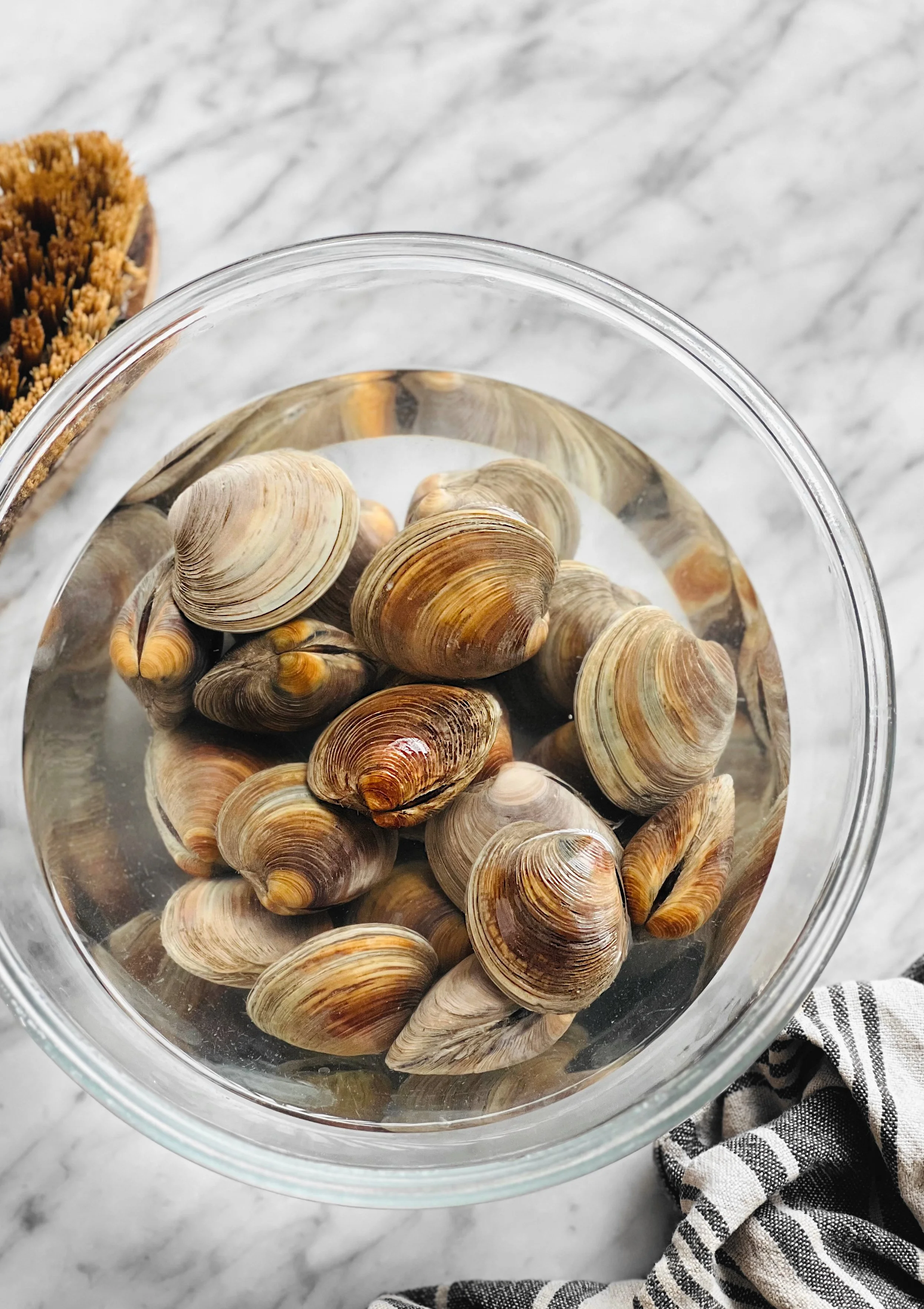 Faire tremper les palourdes vivantes dans un grand bol d’eau froide légèrement salée pendant 15 minutes pour qu’elles purgent le surplus de sable qu’elles pourraient contenir. Bien les nettoyer à l’aide d’une brosse sous l’eau courante. Réserver.
