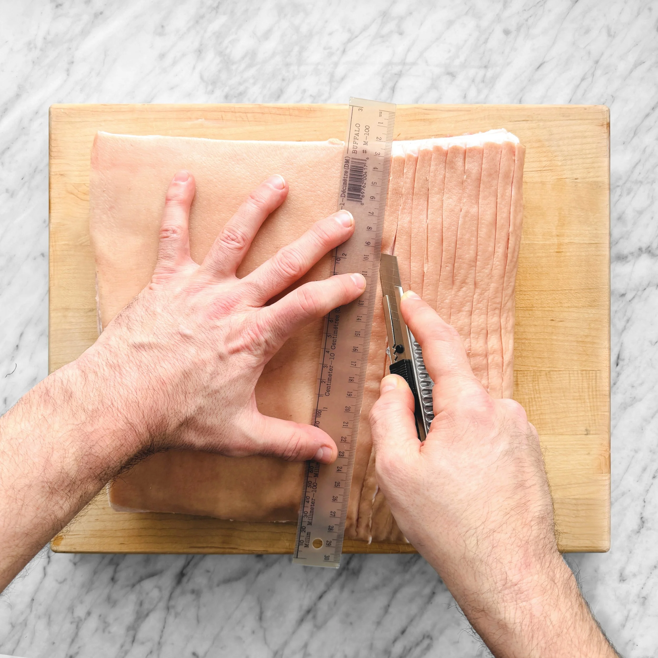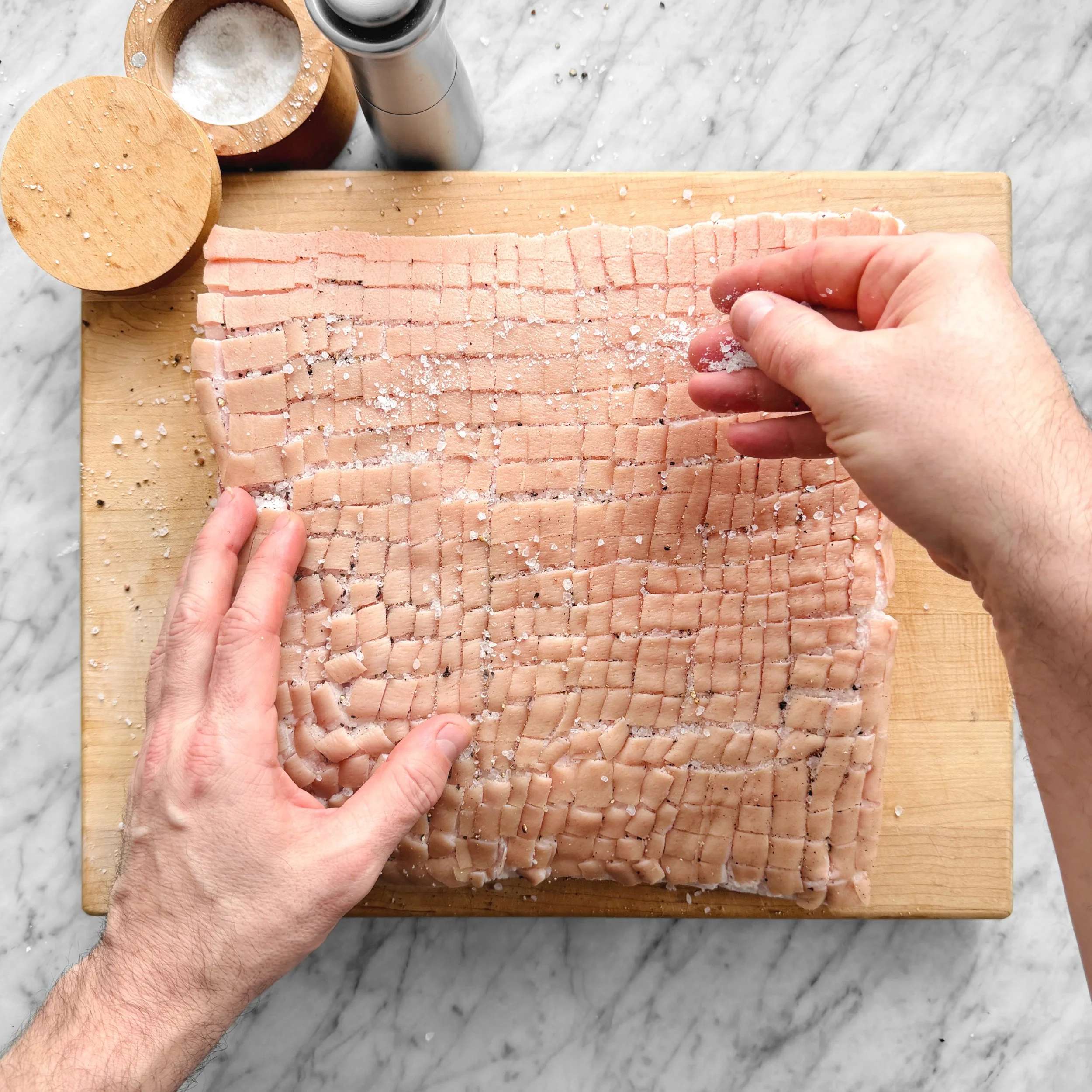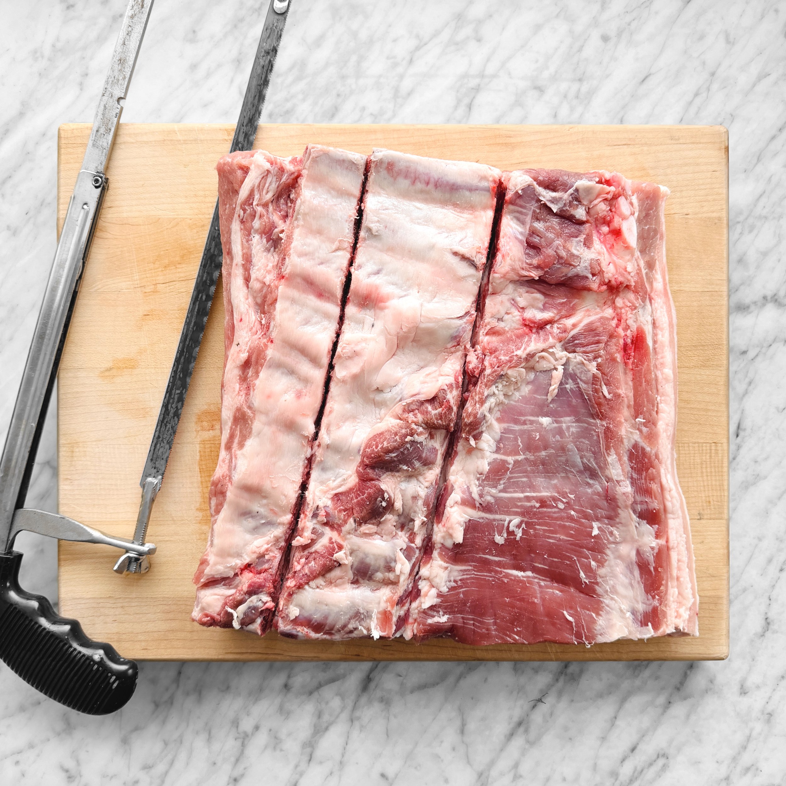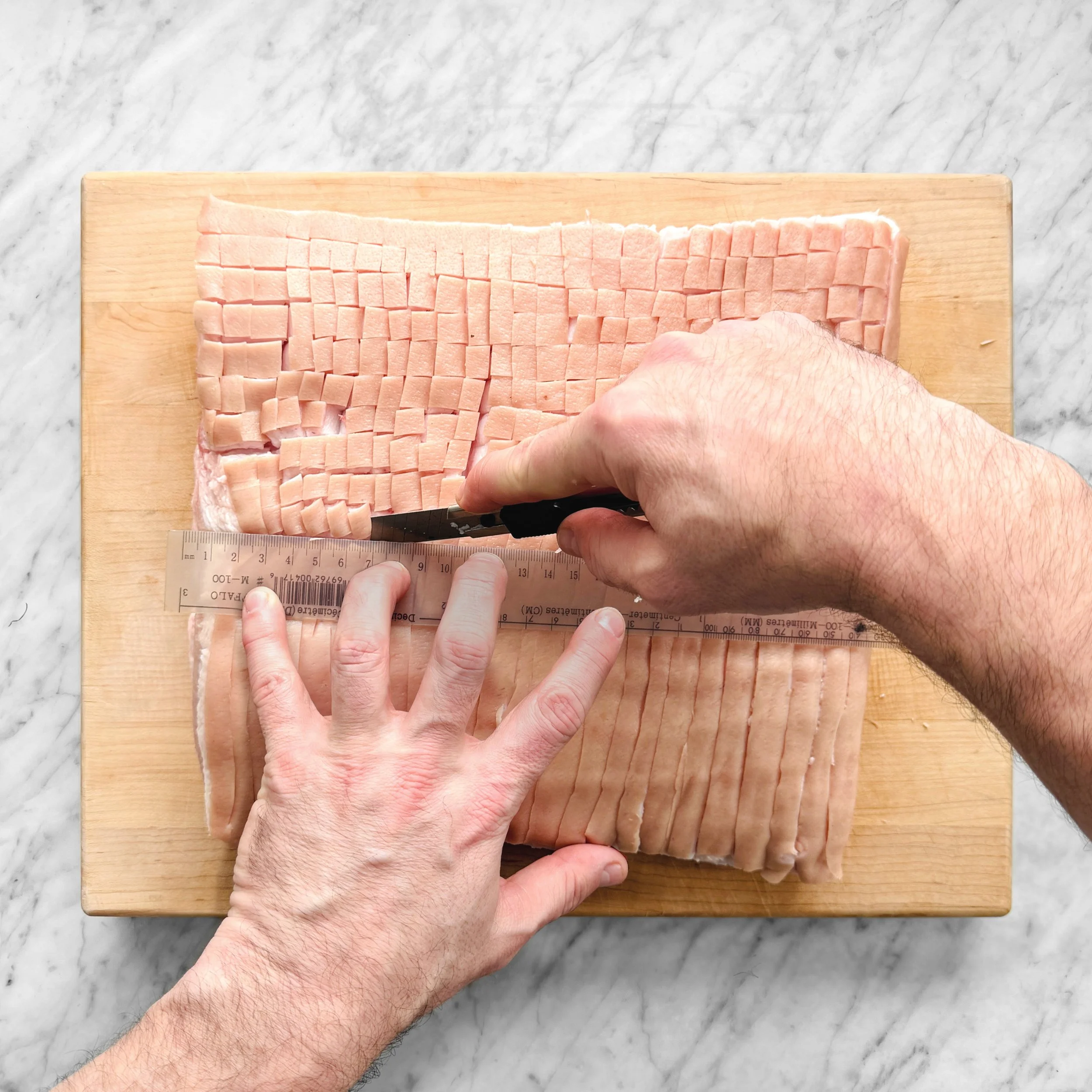 À l’aide d’un couteau très affûté ou d’une lame de type X-Acto, marquer la peau en quadrillé en coupant à tous les 2 cm à travers la peau sans atteindre la chair. Procéder à la verticale puis à l’horizontal. Retourner la poitrine et sectionner les côtes à l’aide d’une scie. Cette étape peut être faite par le boucher et facilitera le service une fois le ribbe cuit.