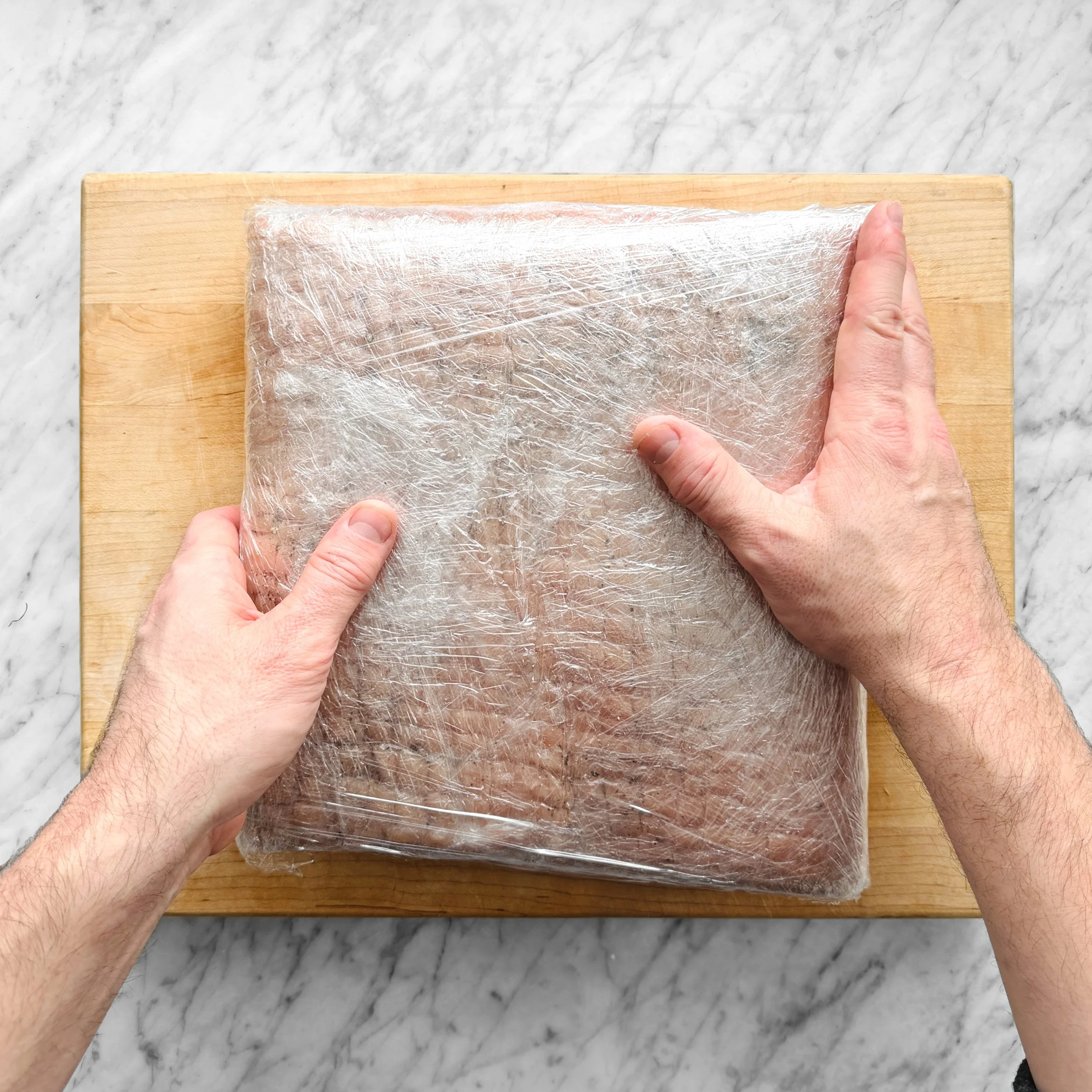 Saler et poivrer généreusement le porc des deux côtés et bien masser pour faire pénétrer dans la viande. Emballer la poitrine fermement dans plusieurs couches de pellicule plastique et laisser reposer au réfrigérateur de 1 à 3 jours.