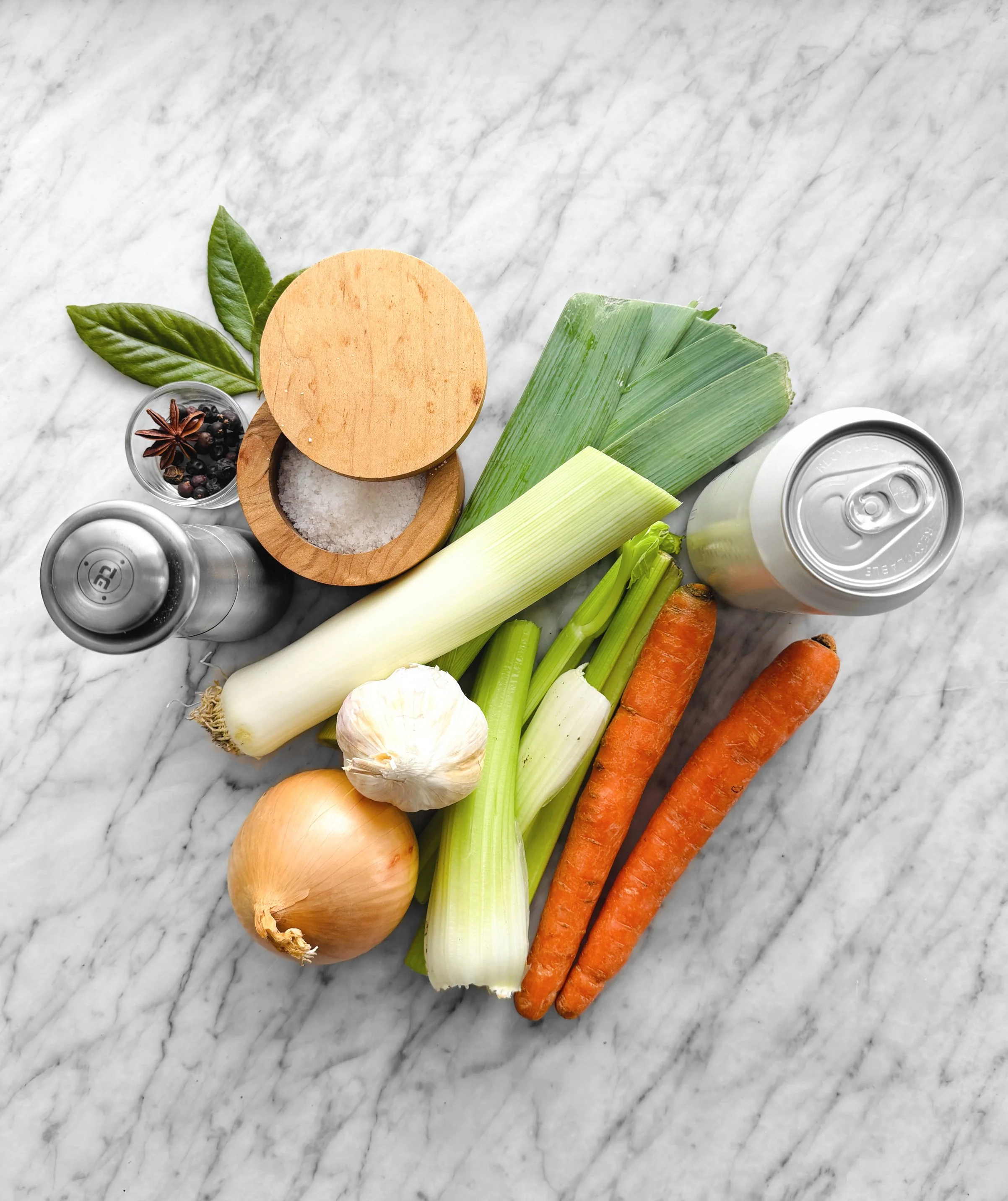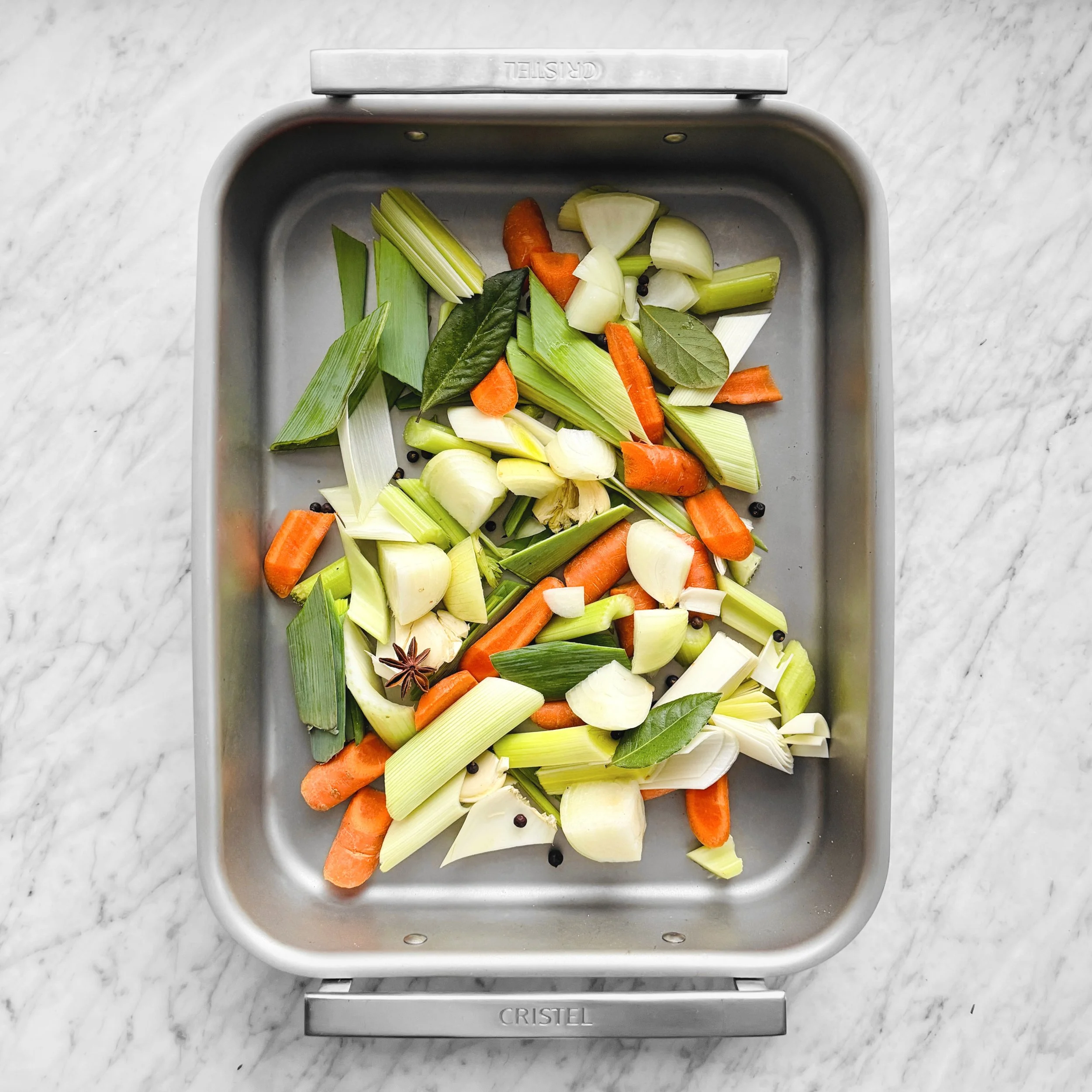 aromates : 1 oignon, 1 poireau, 1-2 carottes, 1-2 branches de céleri, 3 gousses d’ail, 2-3 feuilles de laurier, baies de genièvre, anis étoilé
