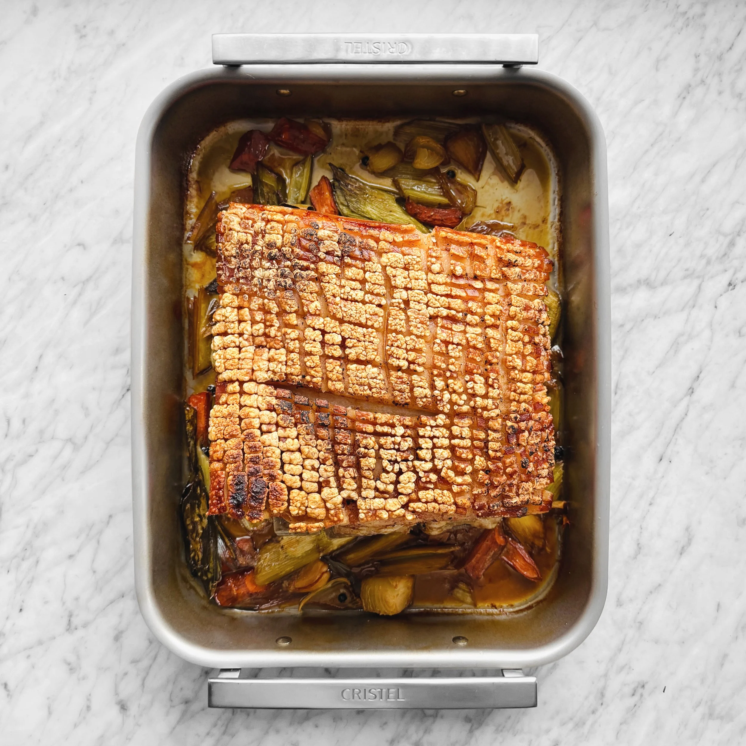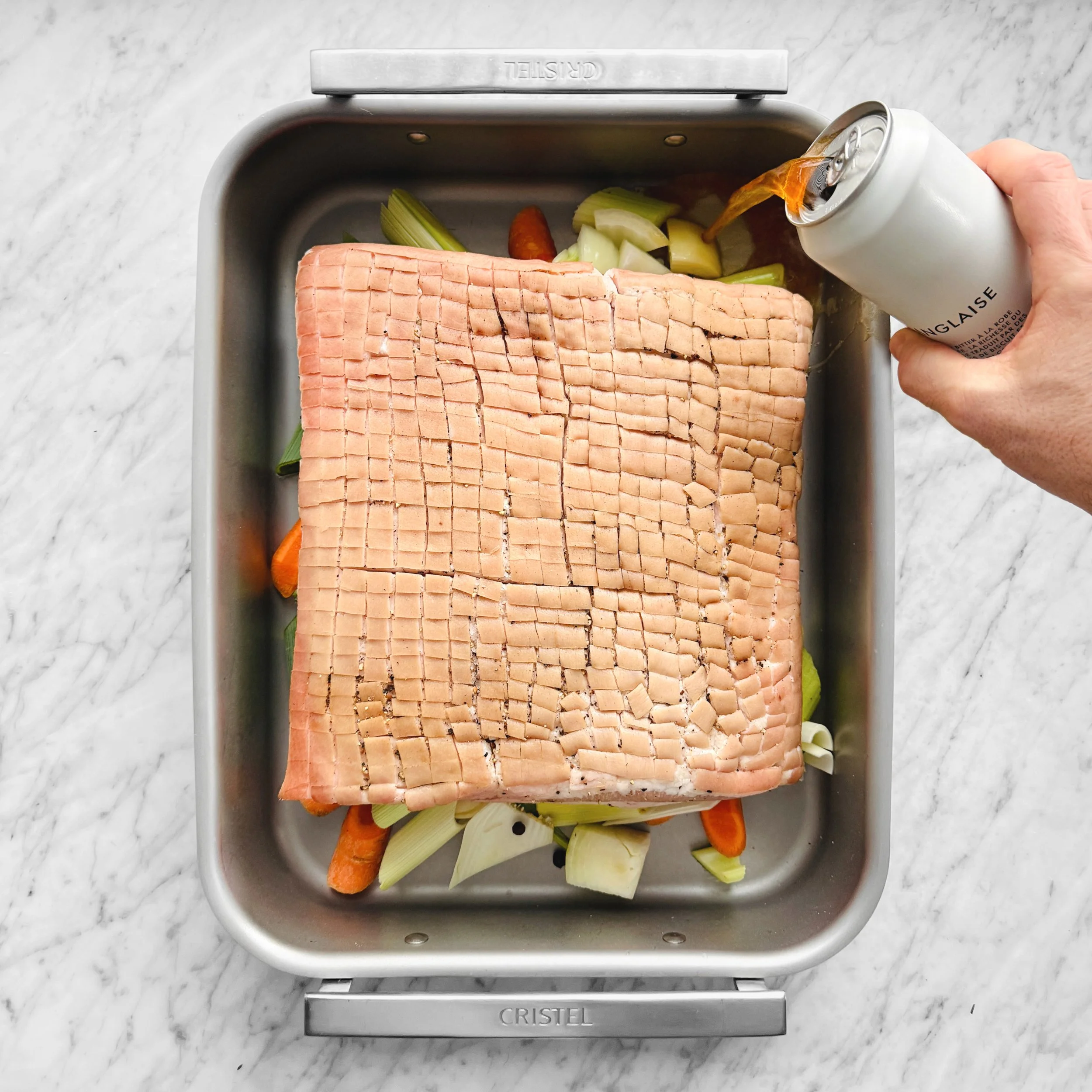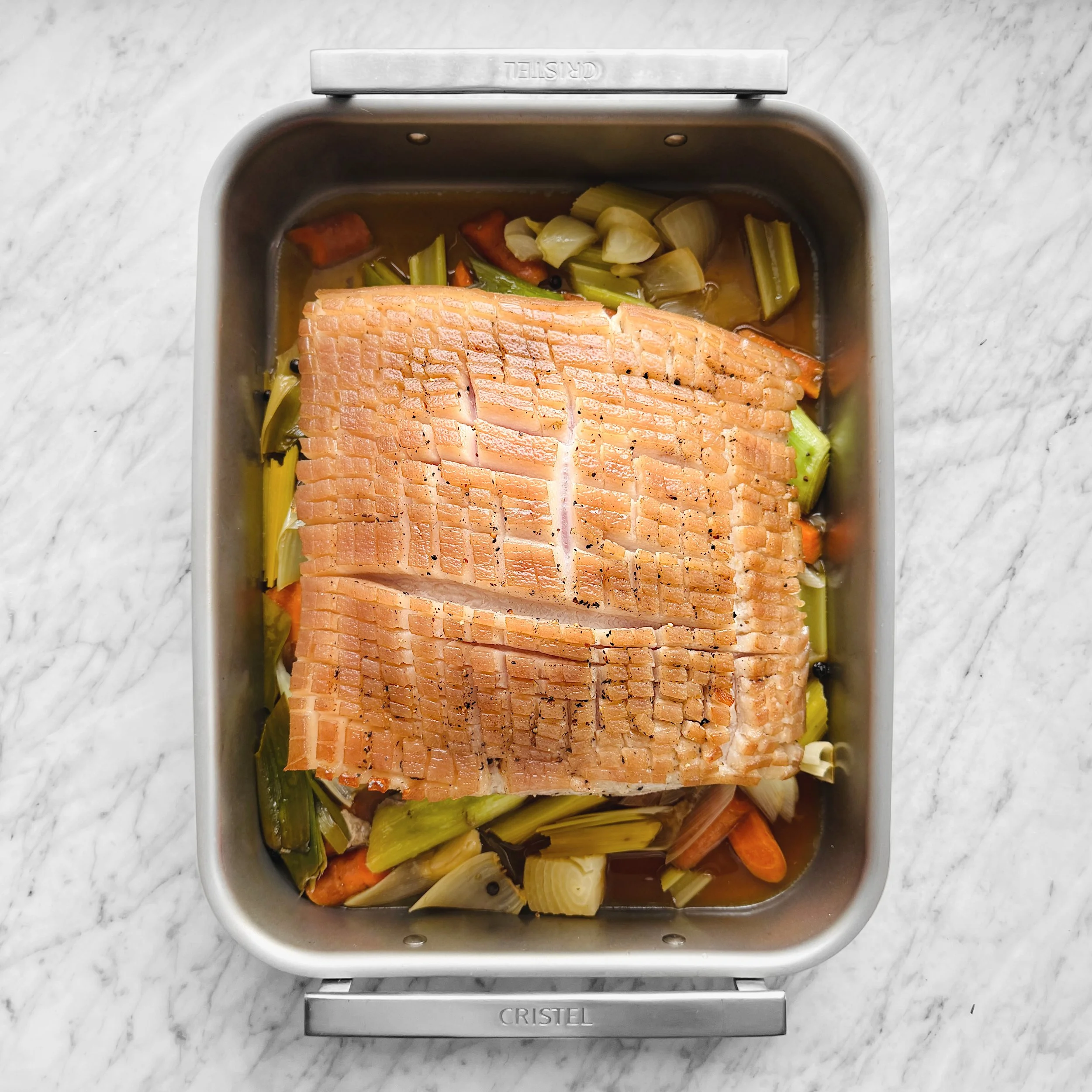 Pour la cuisson : Préchauffer le four à 450°F. Déposer les légumes hachés grossièrement et les aromates dans le fond d’une grande rôtissoire. Déballer la poitrine de porc, bien l’éponger avec un papier absorbant et la déposer sur les légumes, côté peau vers le haut. Verser la bière dans le fond de la rôtissoire. Recouvrir ensuite hermétiquement avec un grand papier d’aluminium et enfourner. Cuire à l’étouffé pendant 45 minutes.