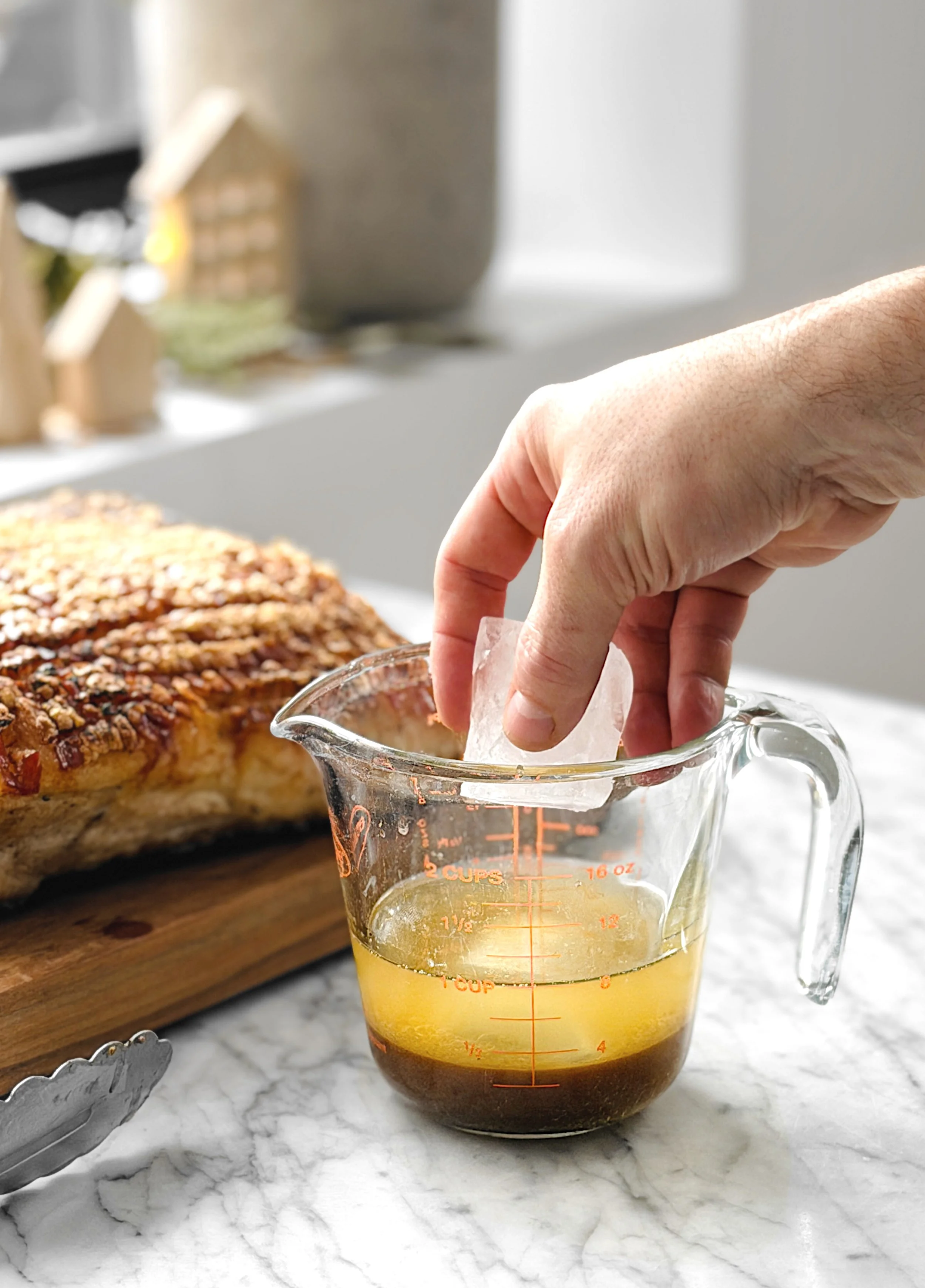 Pour dégraisser le jus de cuisson (il sera très gras, vous vous doutez bien), il existe des gadgets de cuisine et des tasses spéciales conçues pour cette opération. Si comme moi vous n’en avez pas, voici un truc ingénieux qui va changer vos vie! Déposez 1 ou 2 glaçons dans le contenant dans lequel vous avez récupéré les jus. Le gras se solidifiera autour des glaçons et vous pourrez l’enlever à la cuillère. Pas besoin d’attendre que le gras durcisse complètement, il se gélifiera. Trop bien!