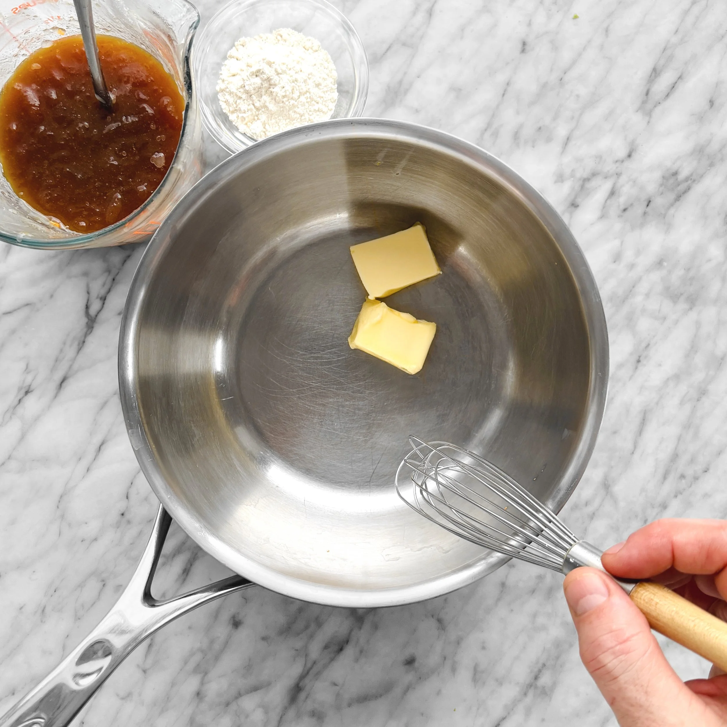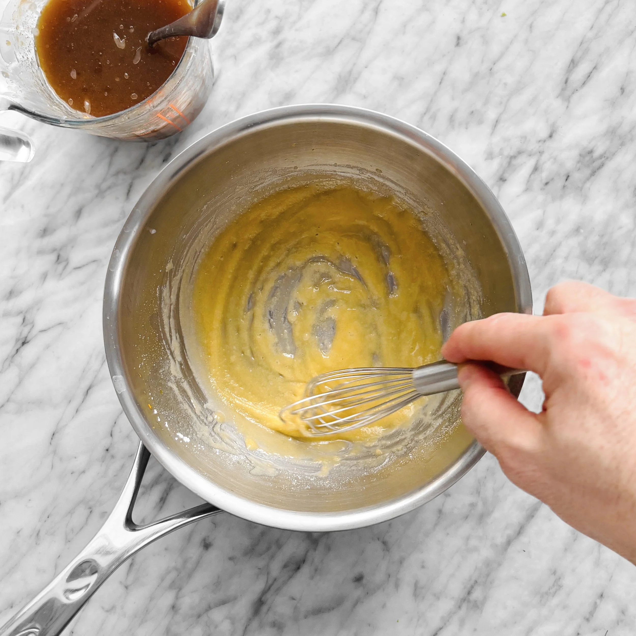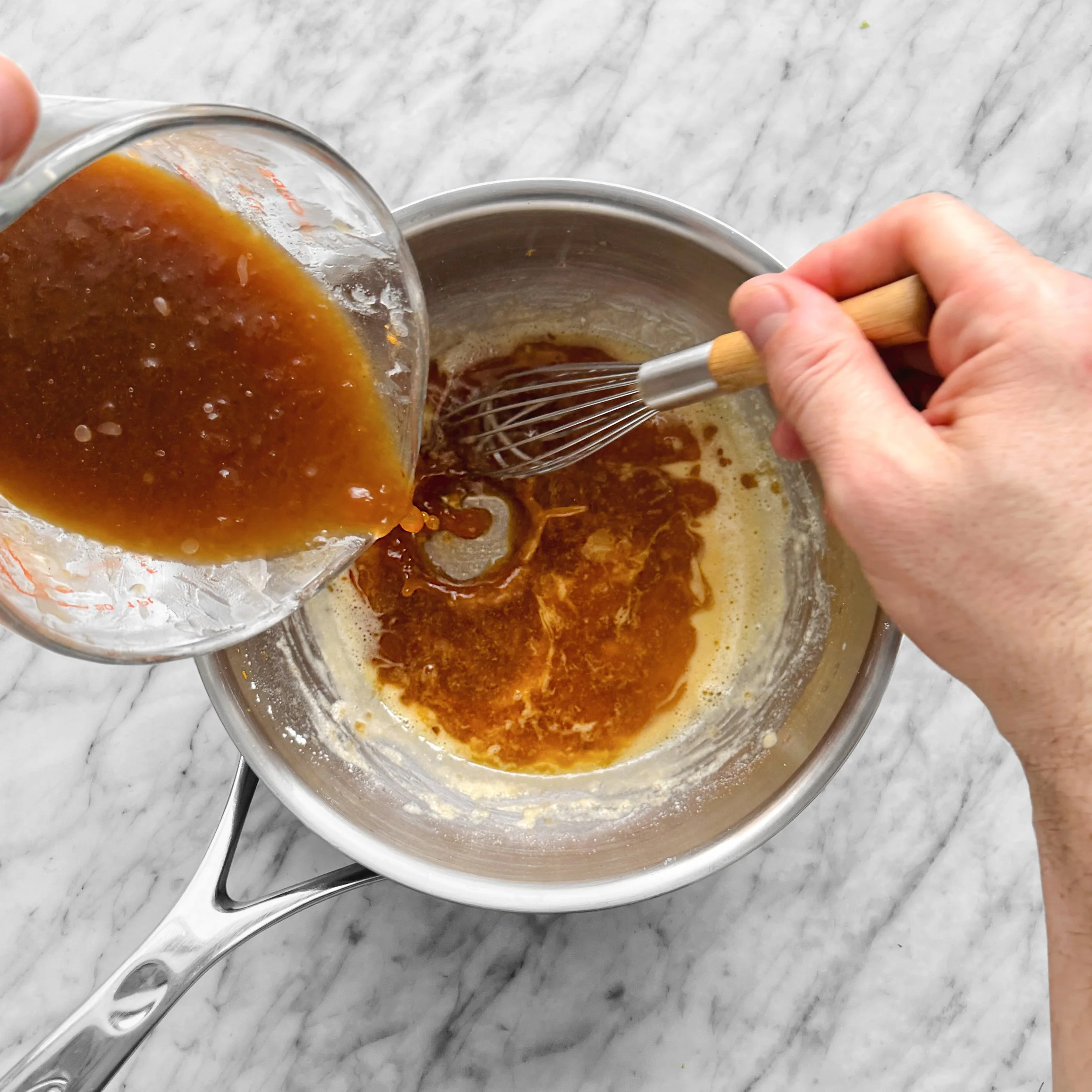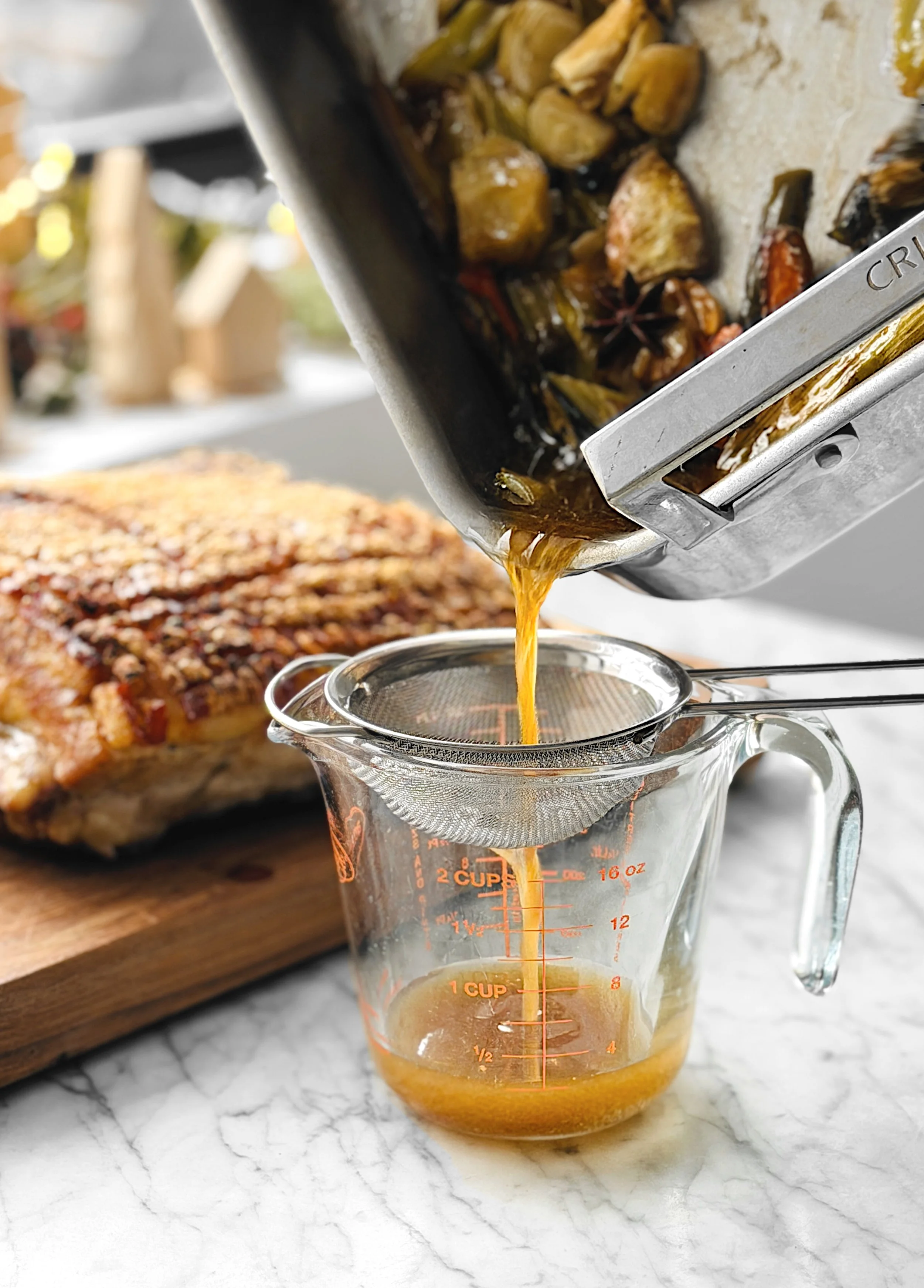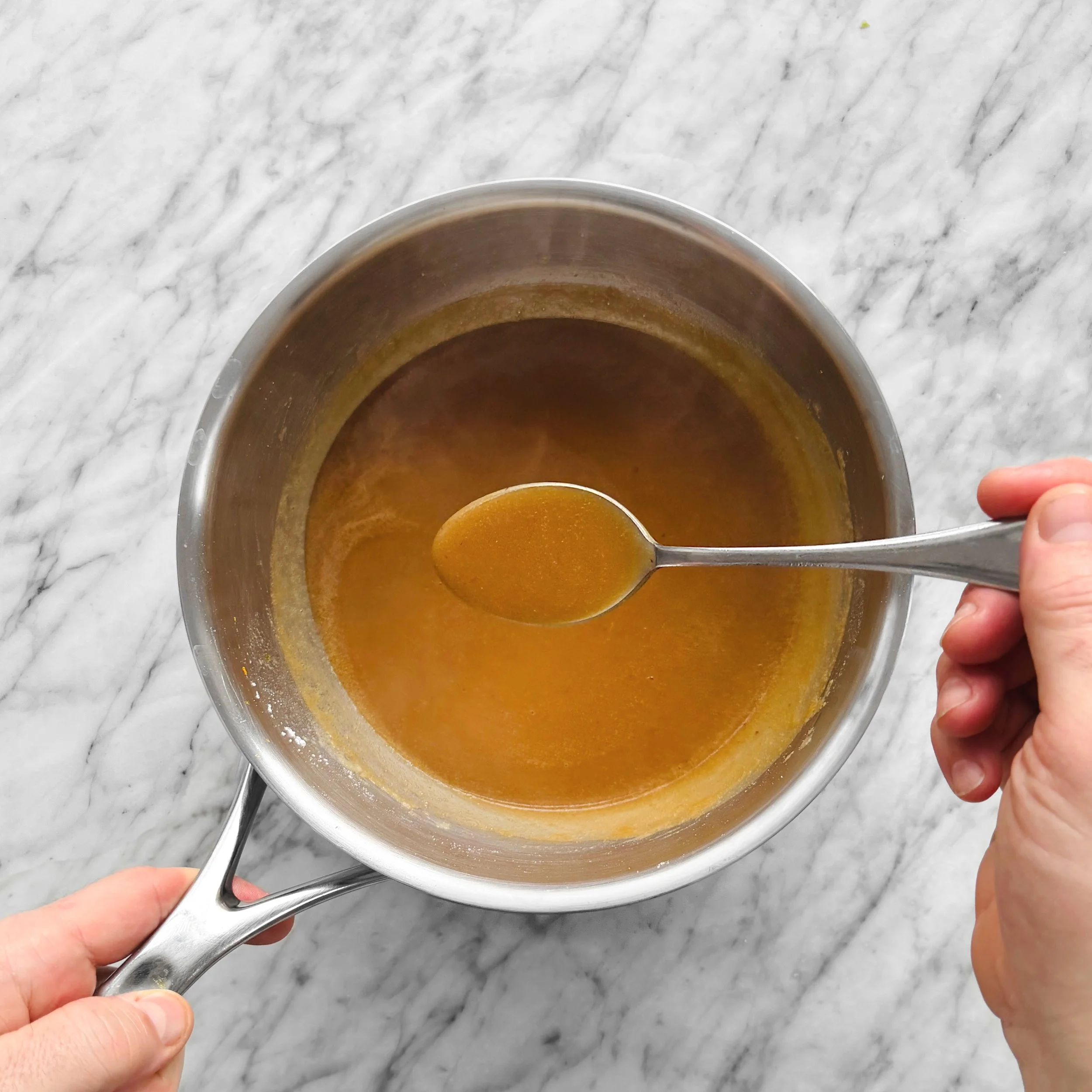 Pendant ce temps, faire la sauce. Récupérer tout le jus de cuisson de la rôtissoire et dégraisser au maximum (voir notes). Ajuster la quantité de liquide avec du fond de veau de manière à avoir environ 400ml de bouillon en tout.