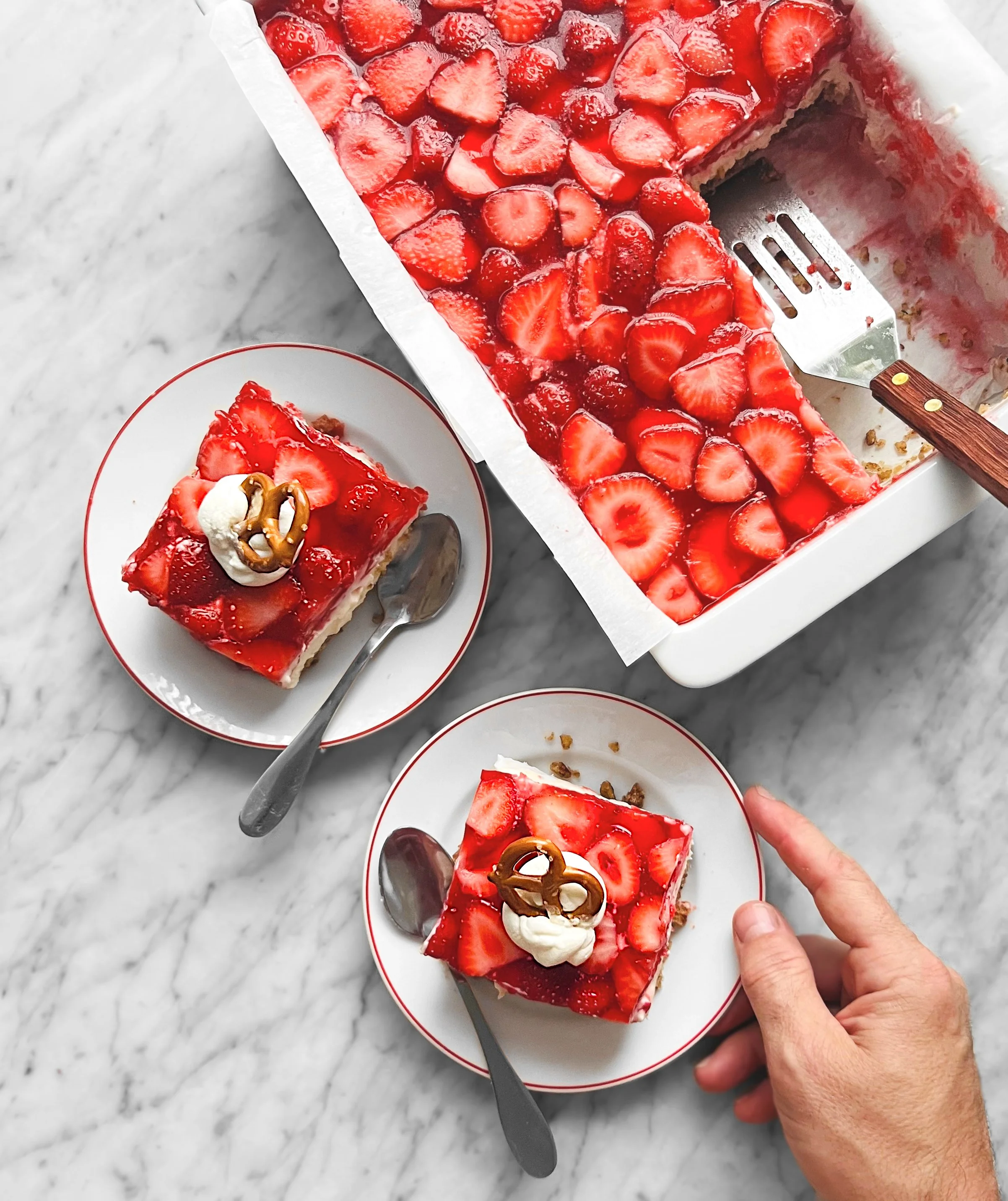 Non, vous ne rêvez pas, ce dessert s’appelle bien «salade» et a beaucoup plus l’apparence d’un cheesecake que d’une véritable salade. Il s’agit d’un classique on ne peut plus américain fait d’une croûte de bretzels salés surmontée d’une généreuse garniture de fromage à la crème et d’un étage de fraises fraîches prises dans une gélatine à la fraise. Le bon vieux Jell-O rouge! Je l’avoue, j’ai été pris d’un élan de nostalgie et j’avais envie de vous proposer un dessert parfaitement rétro pour mettre en valeur nos délicieuses fraises du Québec.