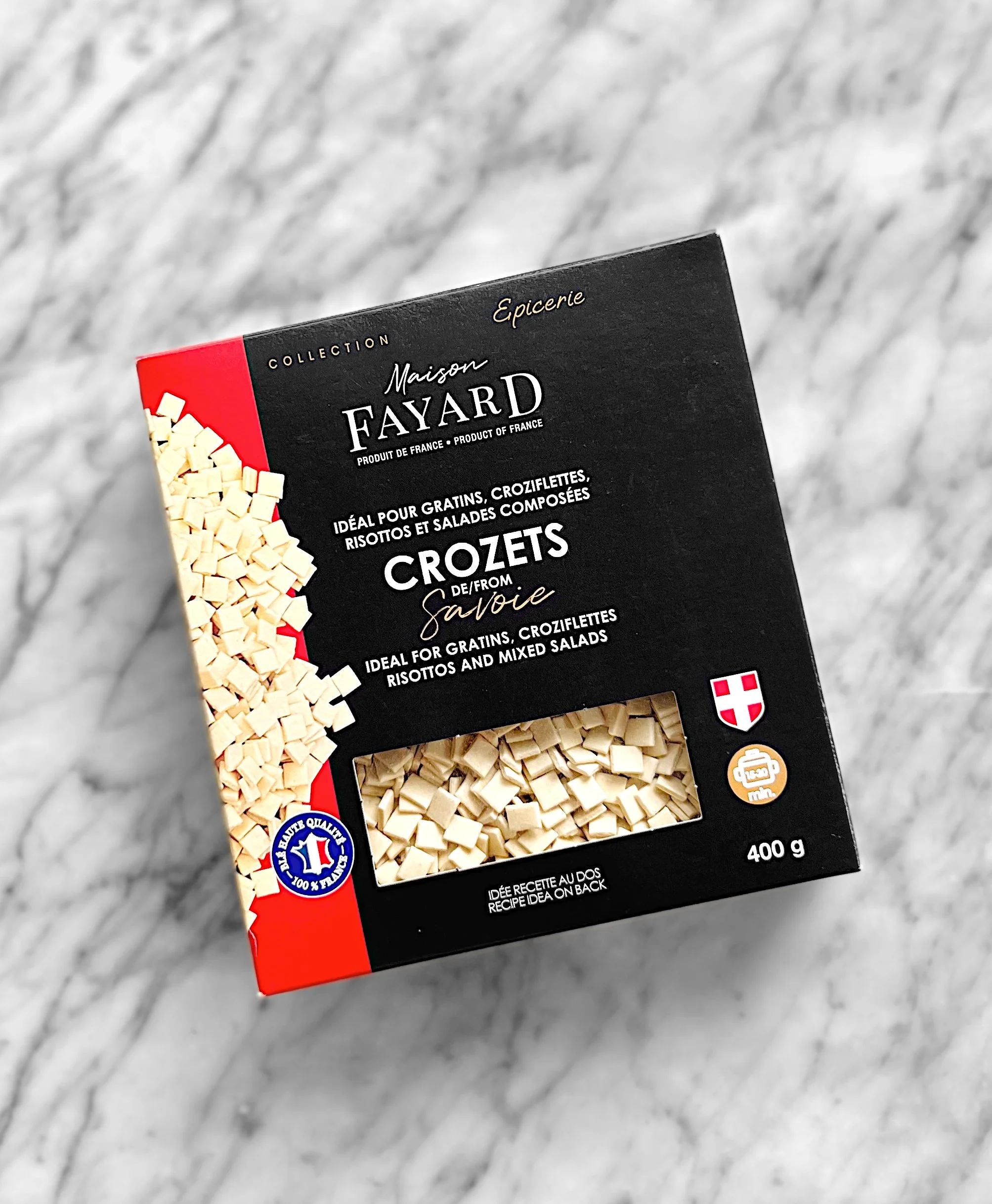 Je me doute bien que vous vous demandez quelle sorte d’orzo j’ai bien pu utiliser pour ma recette, j’y arrive enfin. Sur les photos, j’ai effectivement choisi de travailler avec une autre sorte de petites pâtes que je n’avais jamais vu avant : les crozets, une spécialité des Alpes françaises. On les reconnaît à leur forme de petits carrés qui ressemble à des petits coussins douillets.