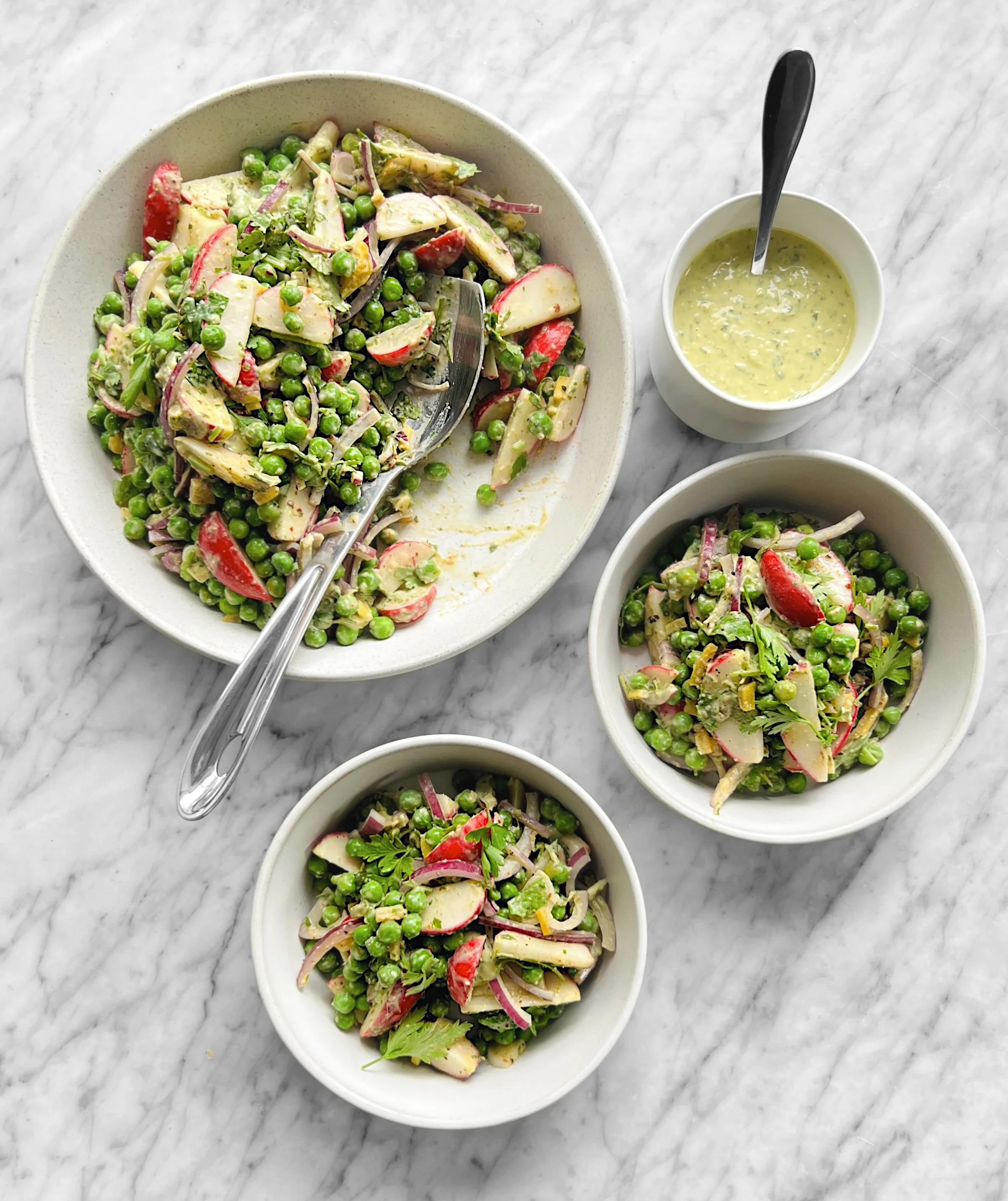 salade - accompagnement - légumes - végétarien - vegan - petits pois - radis - hummus - herbes - coriandre - citron - citron confit - cuisine du monde - cuisine du Moyen-Orient - salades estivales