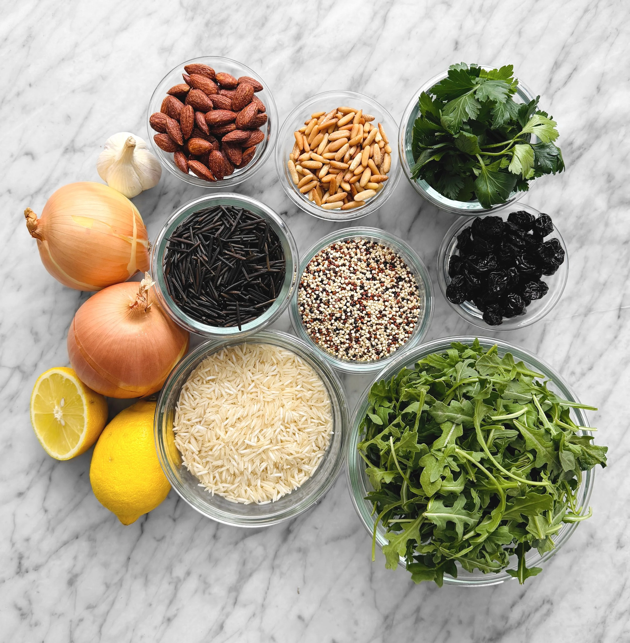 salade - salade-repas - accompagnement - riz - quinoa - amandes - noix de pin - cerises - végétarien - persil - basilic - roquette - boîte à lunchs - meal prep