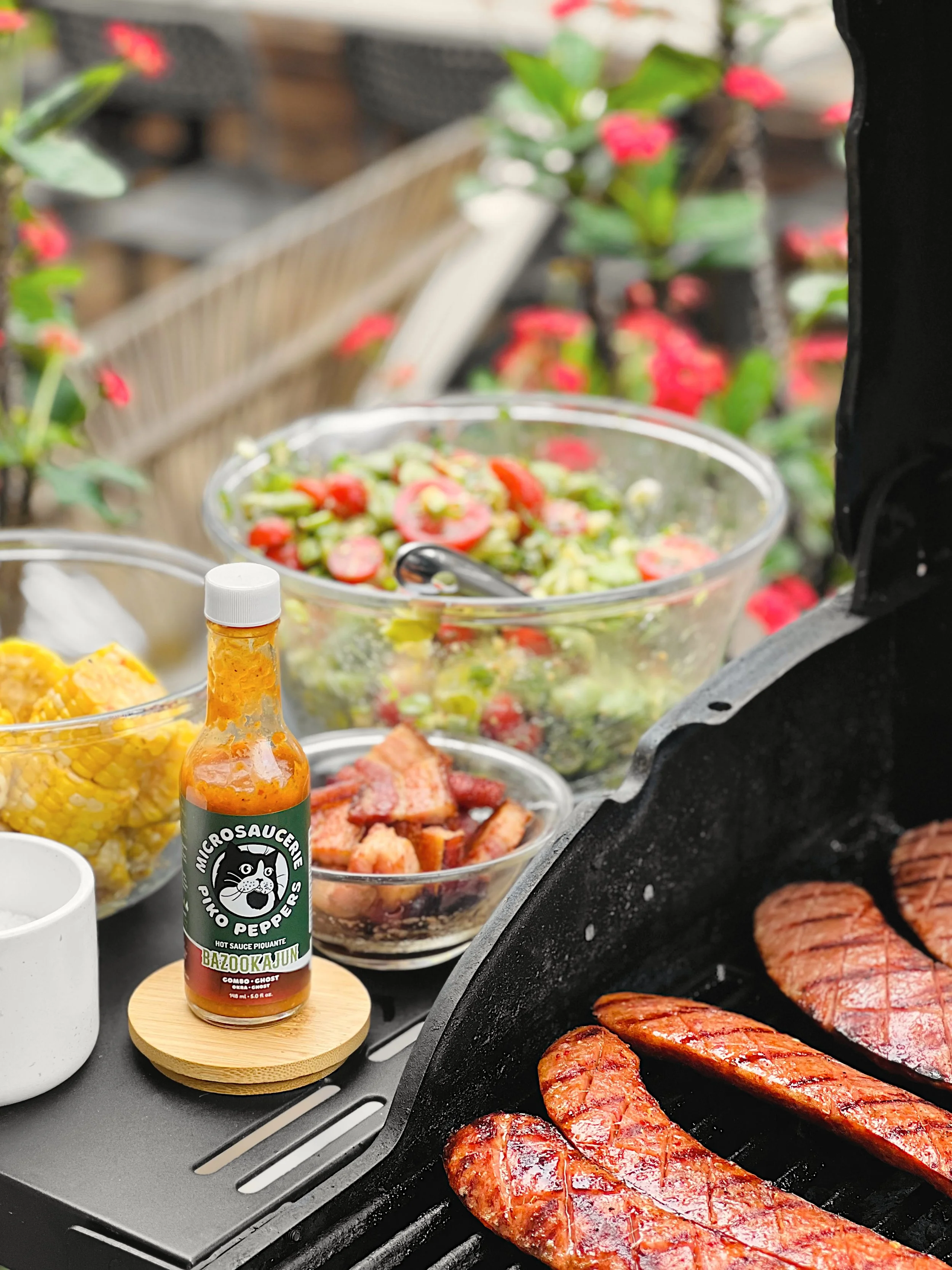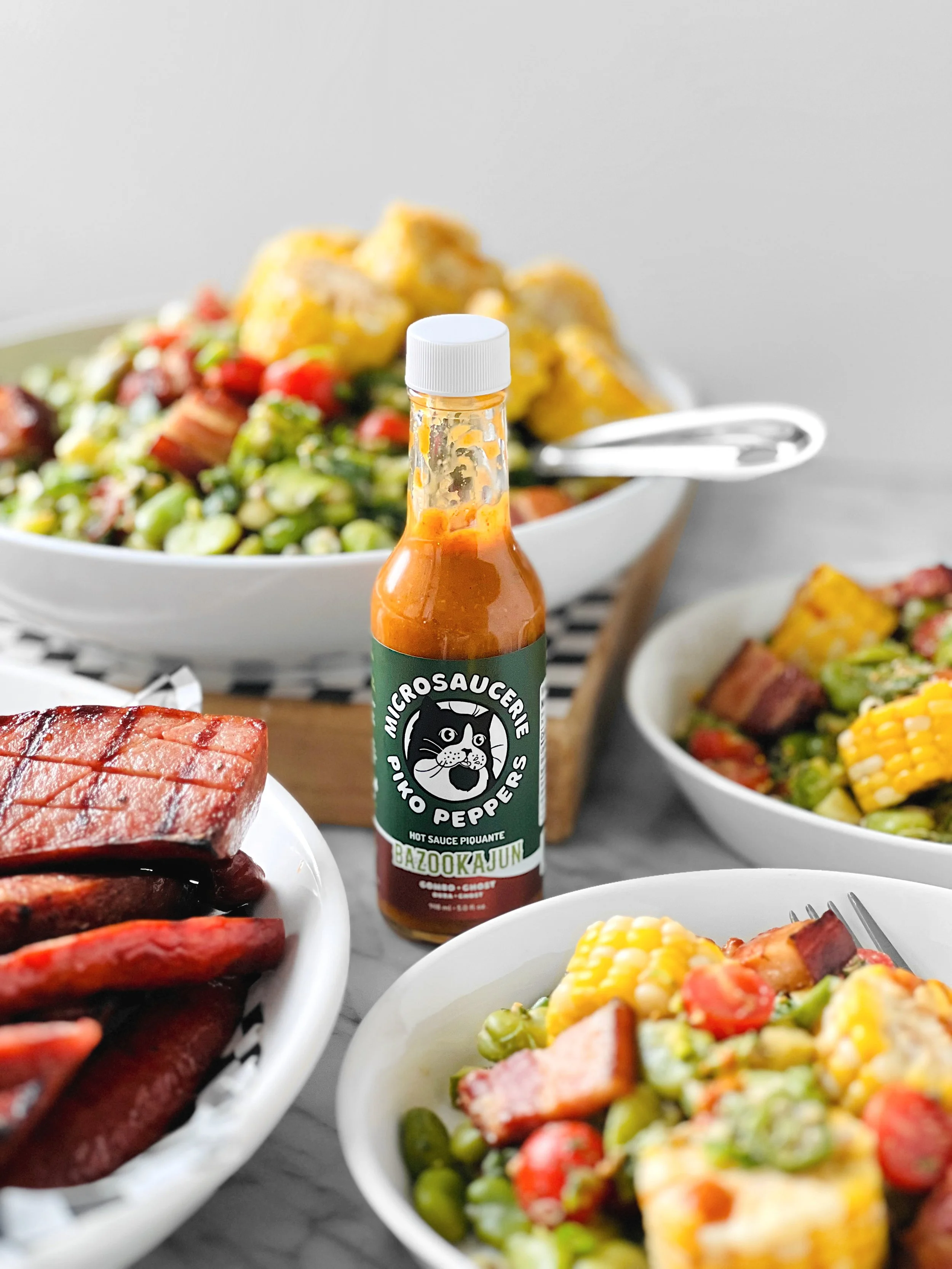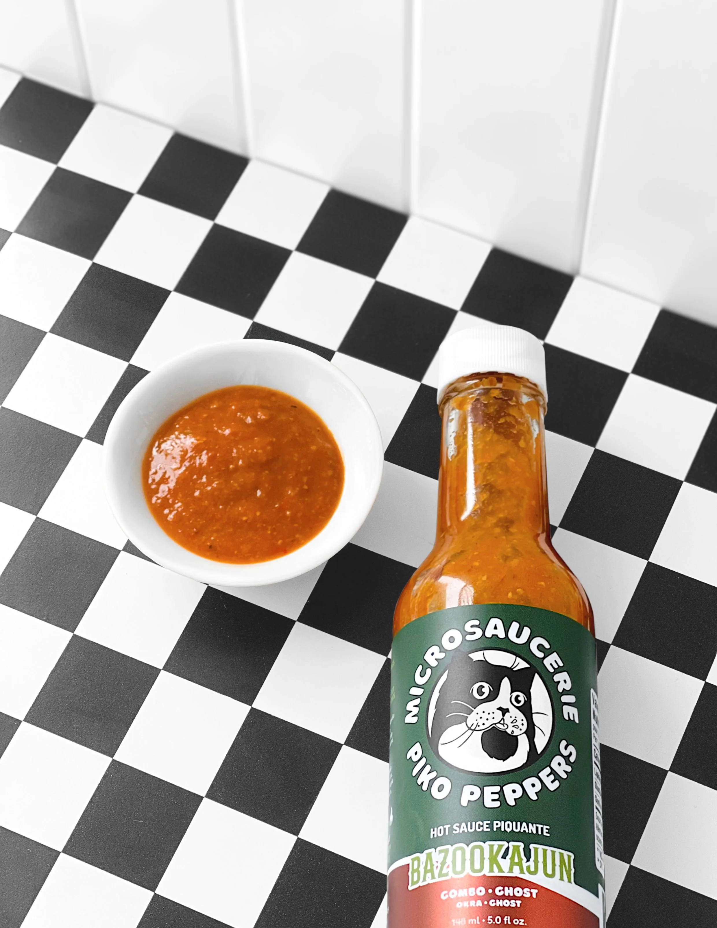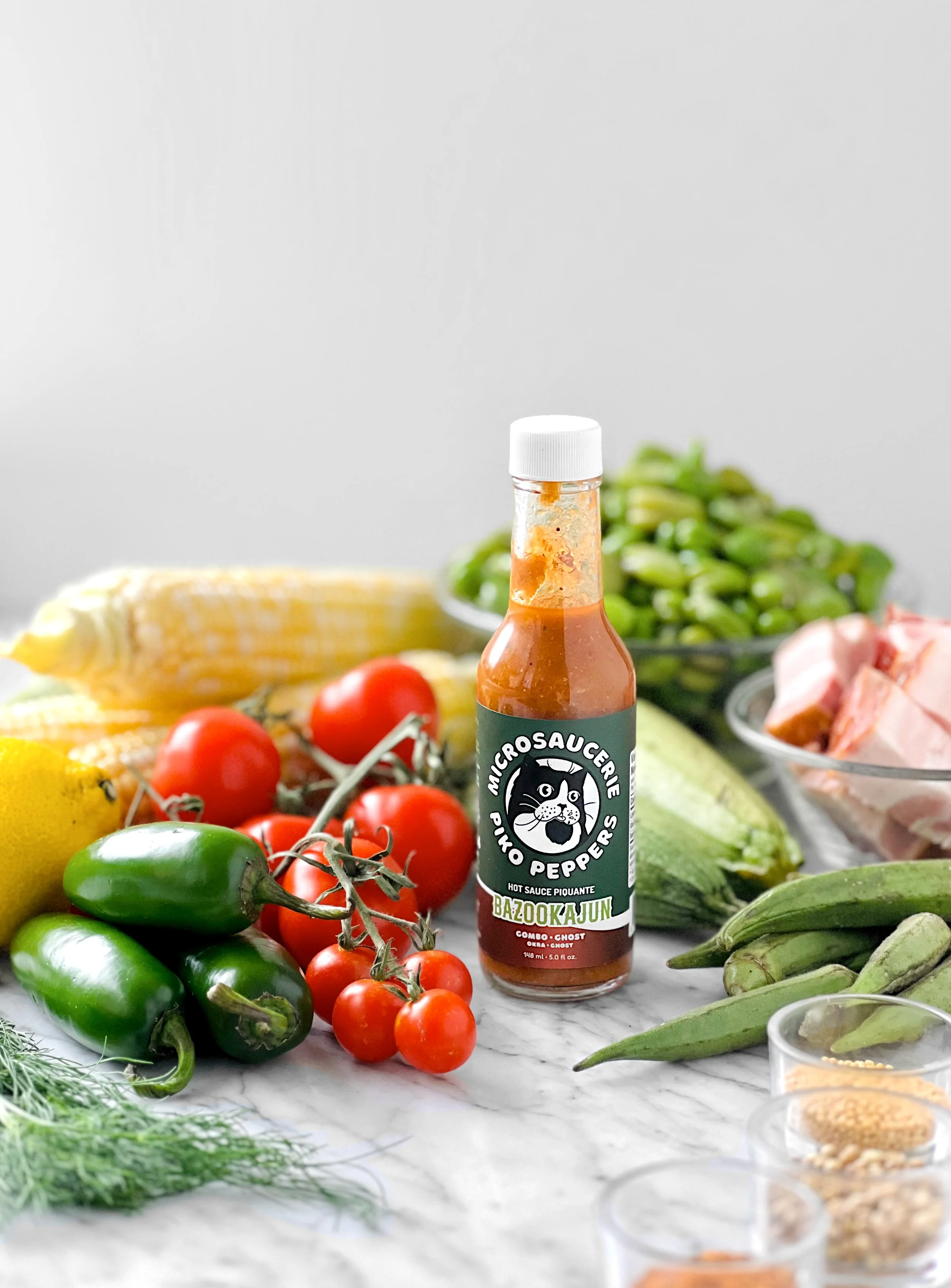 Attention, ça va chauffer! La toute nouvelle sauce Bazookajun de PIko Peppers débarque avec un punch cajun qui ne laisse pas indifférent, ou qui vise dans le mille si vous préférez! Elle est minutieusement faite d’un mélange explosif de piments ghost pepper, de jalapeño frais, d’épices cajun maison, de gumbo (okras) et de tomates cuites à feu doux… Un hommage piquant aux bayous de la Louisiane. Cette sauce inspirante d’une intensité de 4/5 est parfaite pour ceux qui n’ont pas peur d’avoir chaud! Elle sera idéale avec les crevettes, le poulet grillé, le grits, les gombos ou dans le succotash, plat typique cajun, mijoté ou encore en version réinventée comme ce qu’on s’apprête à vous dévoiler.