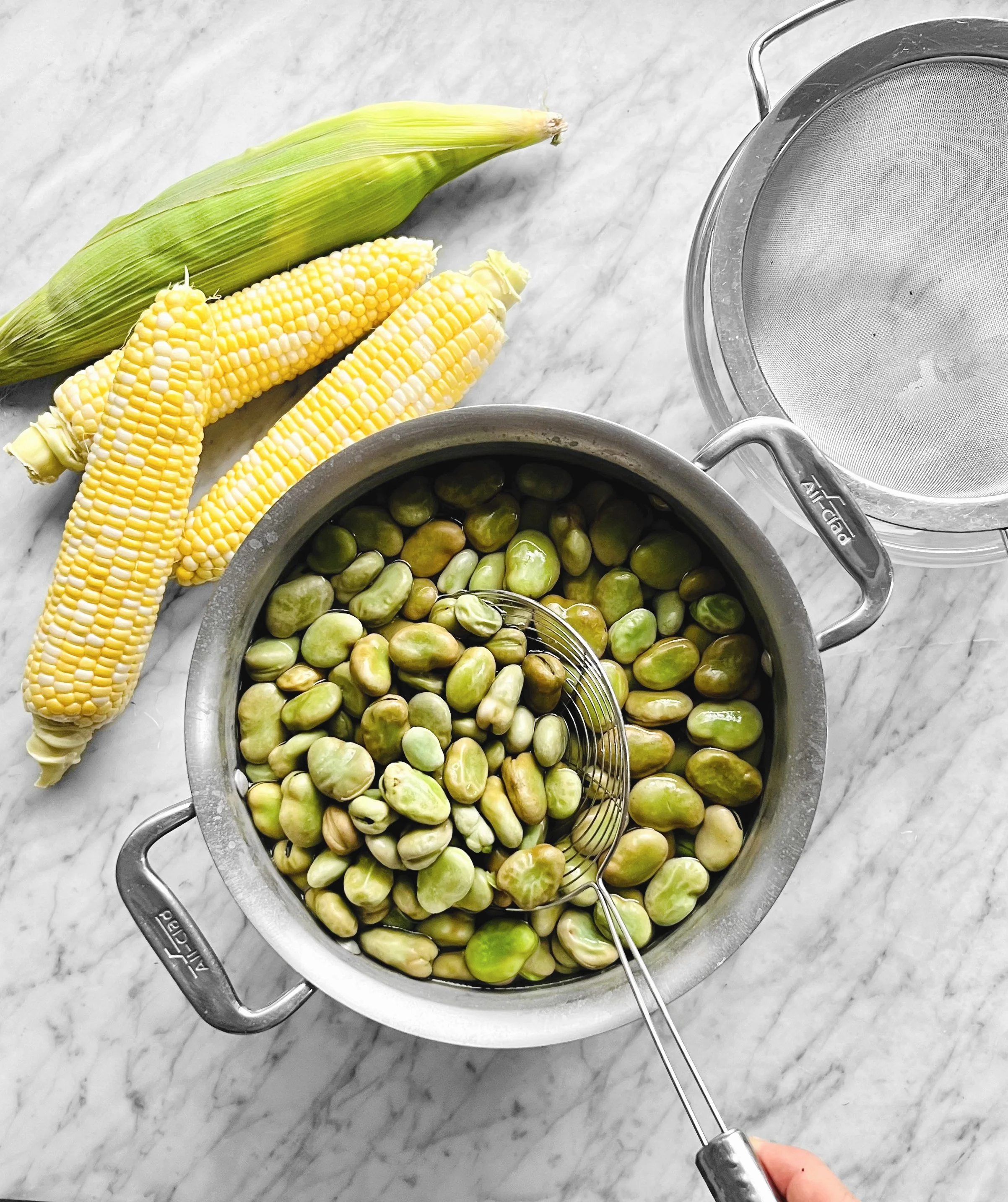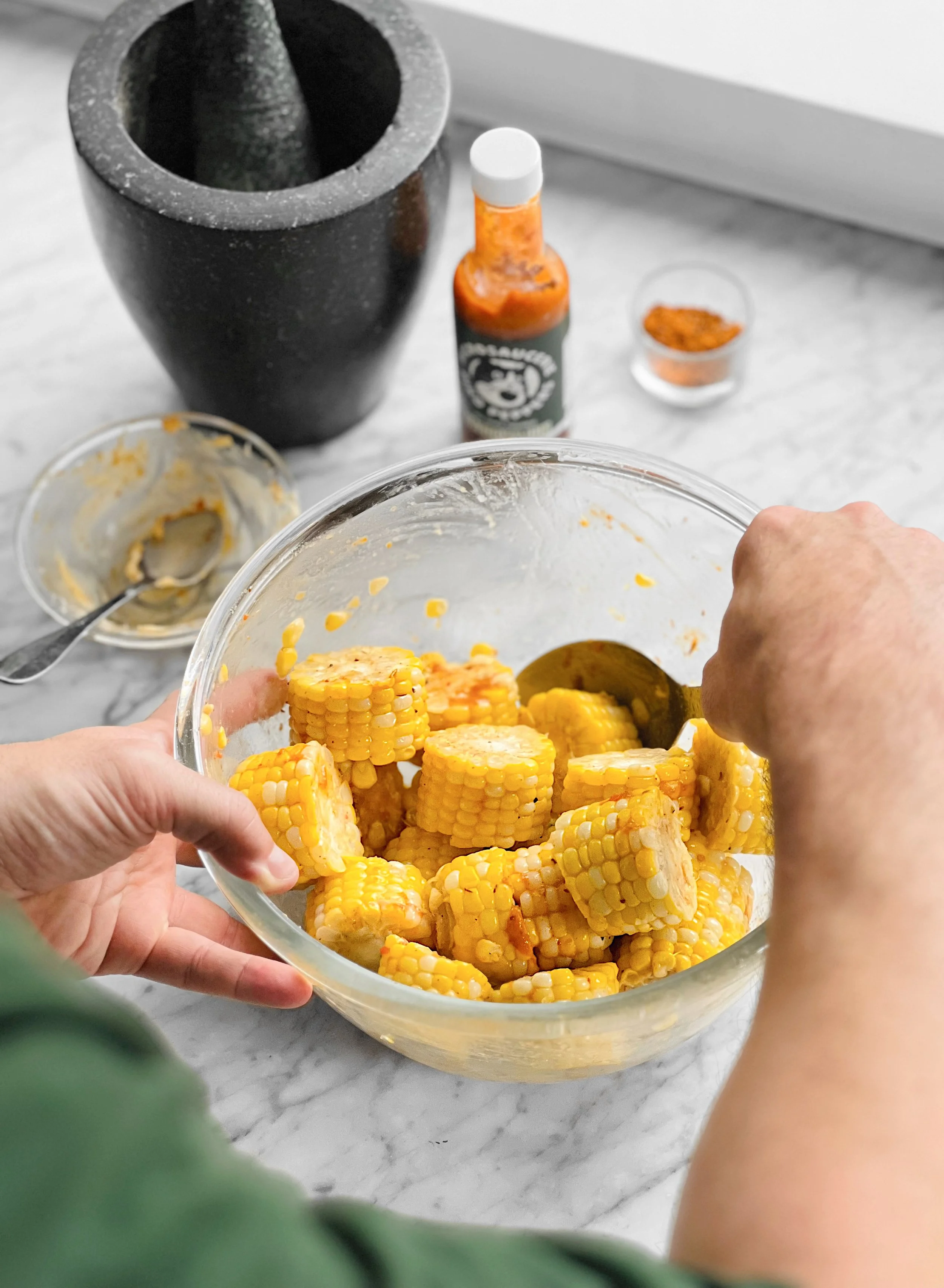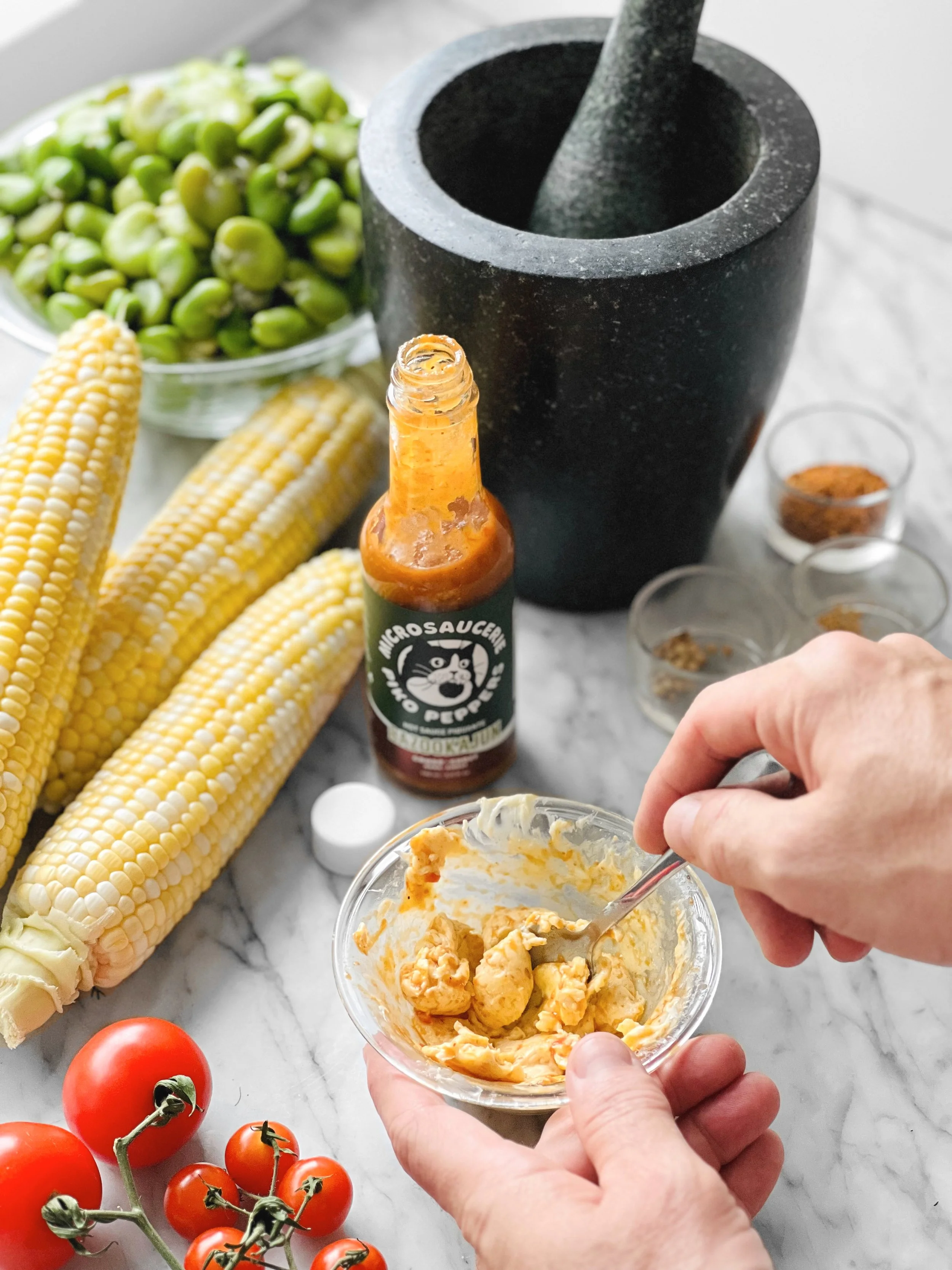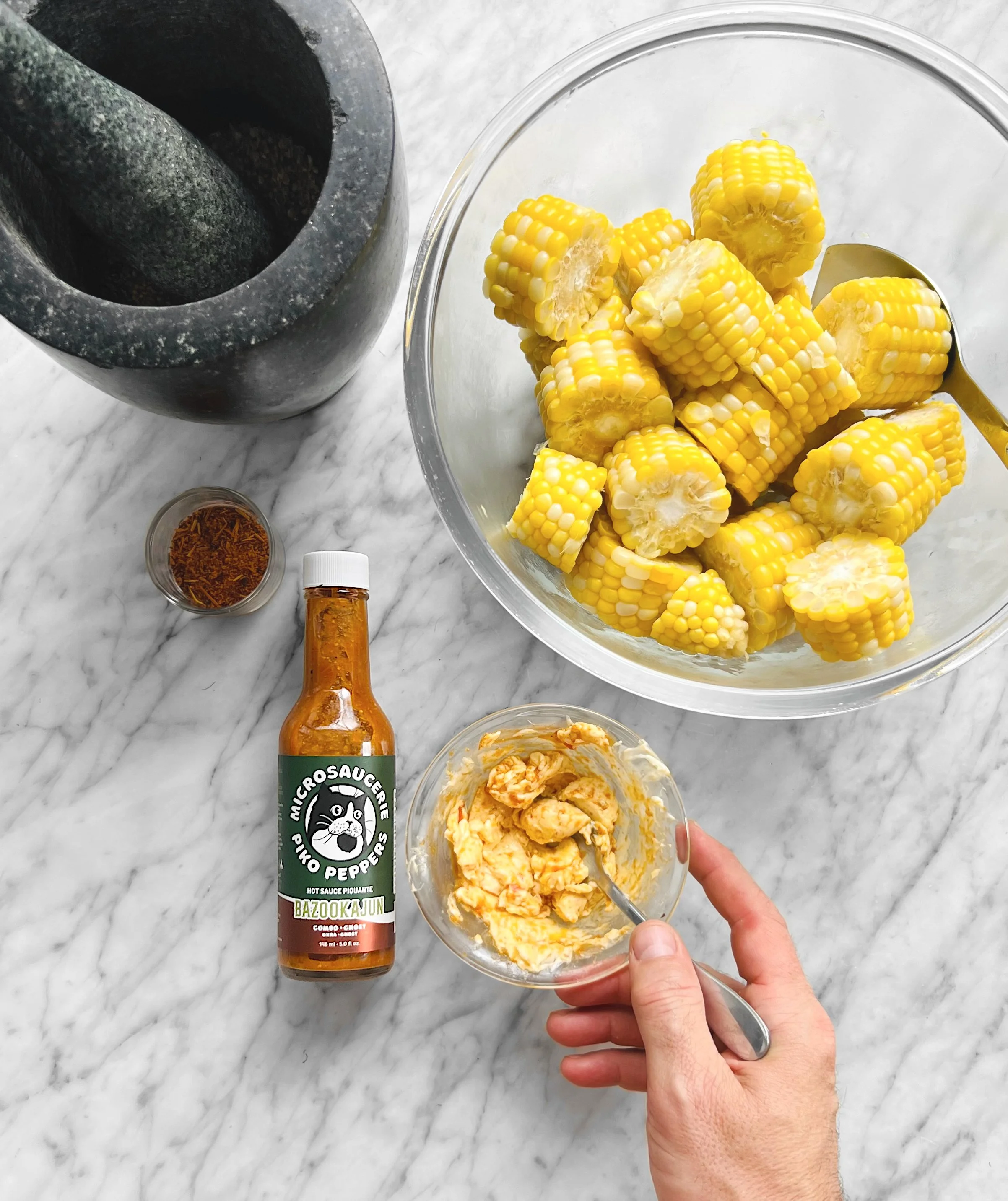 Porter un grand volume d’eau salée à ébullition. Blanchir d’abord les gourganes ou les fèves de lima 3 à 5 minutes selon leur taille. Repêcher à l’aide d’une cuillère trouée et rincer à grande eau froide dans une passoire. Peler les fèves si désiré (recommandé pour une meilleure texture en bouche). Dans la même eau, cuire ensuite les maïs 5 minutes. Une fois cuits, couper les maïs en petits tronçons et transférer dans un bol. Mélanger le beurre avec 1 c. à soupe de la sauce piquante Bazookajun de Piko Peppers dans un petit bol à part. Alors que le maïs est encore chaud, ajouter le beurre épicé et 1 c. à thé d’épices cajun. Bien mélanger pour faire fondre le beurre et bien enrober le maïs. Réserver.
