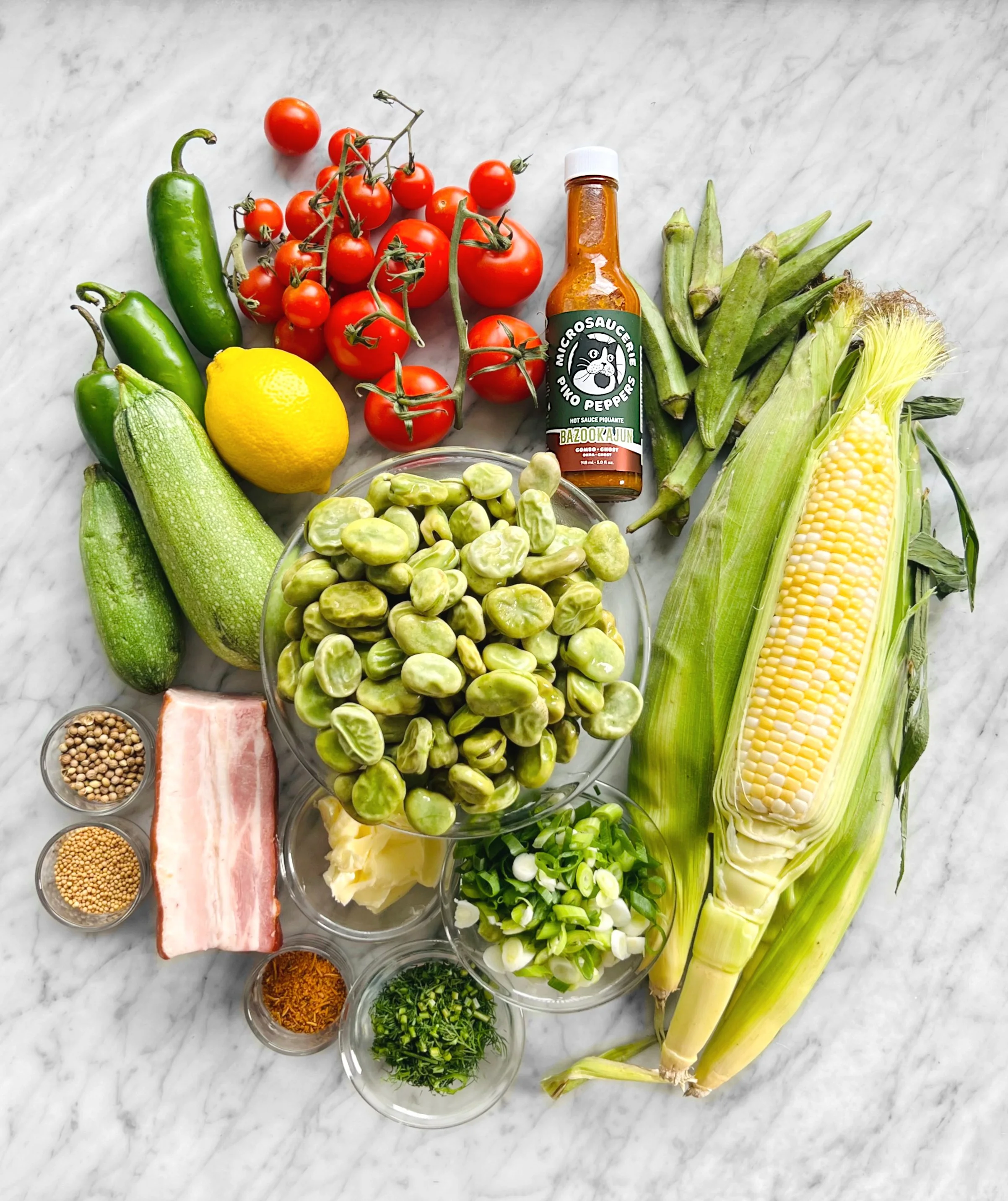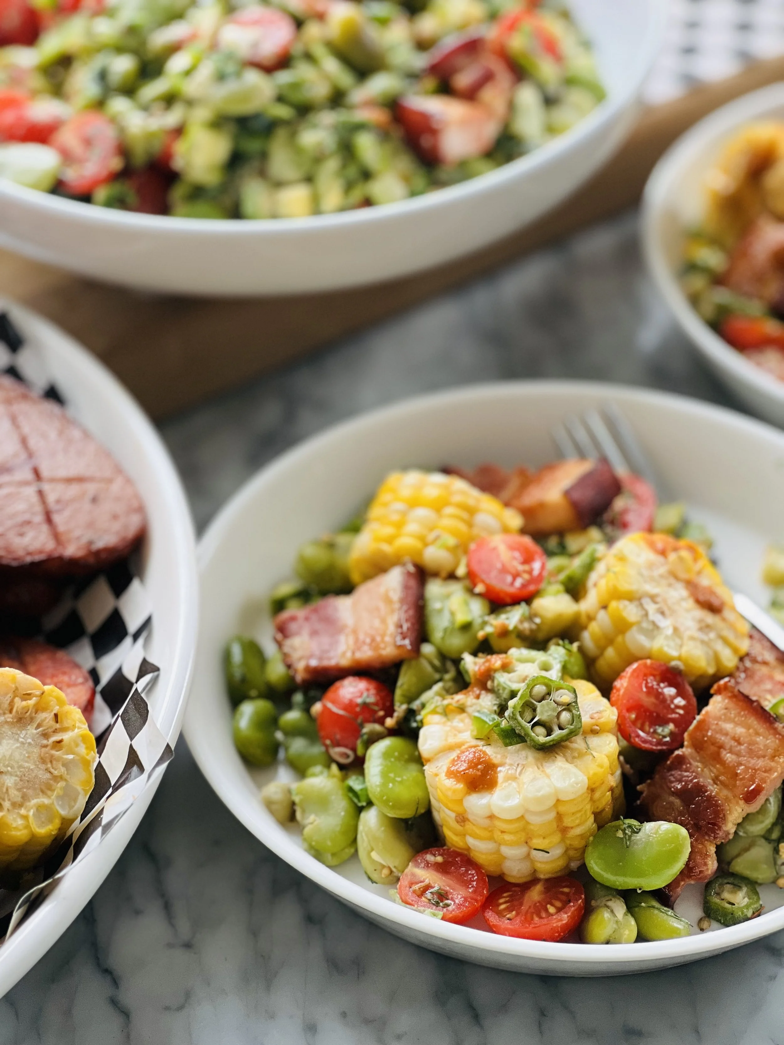 C’est recette est une occasion extraordinaire de profiter de la saison des gourganes (ou des fèves de Lima si vous arrivez à en trouver) et du maïs du Québec! Cette version, très personnelle, du succotash accompagna à merveille de belles grillades comme des saucisses, des chorizo ou encore la fameuse Kolbasa, une saucisse fumée à l’ail polonaise très prisée en Europe de l’est, certes, mais aussi beaucoup chez nos voisins du sud. On a qu’à penser au fameux Crab Boil à l’américaine, une autre spécialité cajun, qui utilise allègrement la kolbasa.