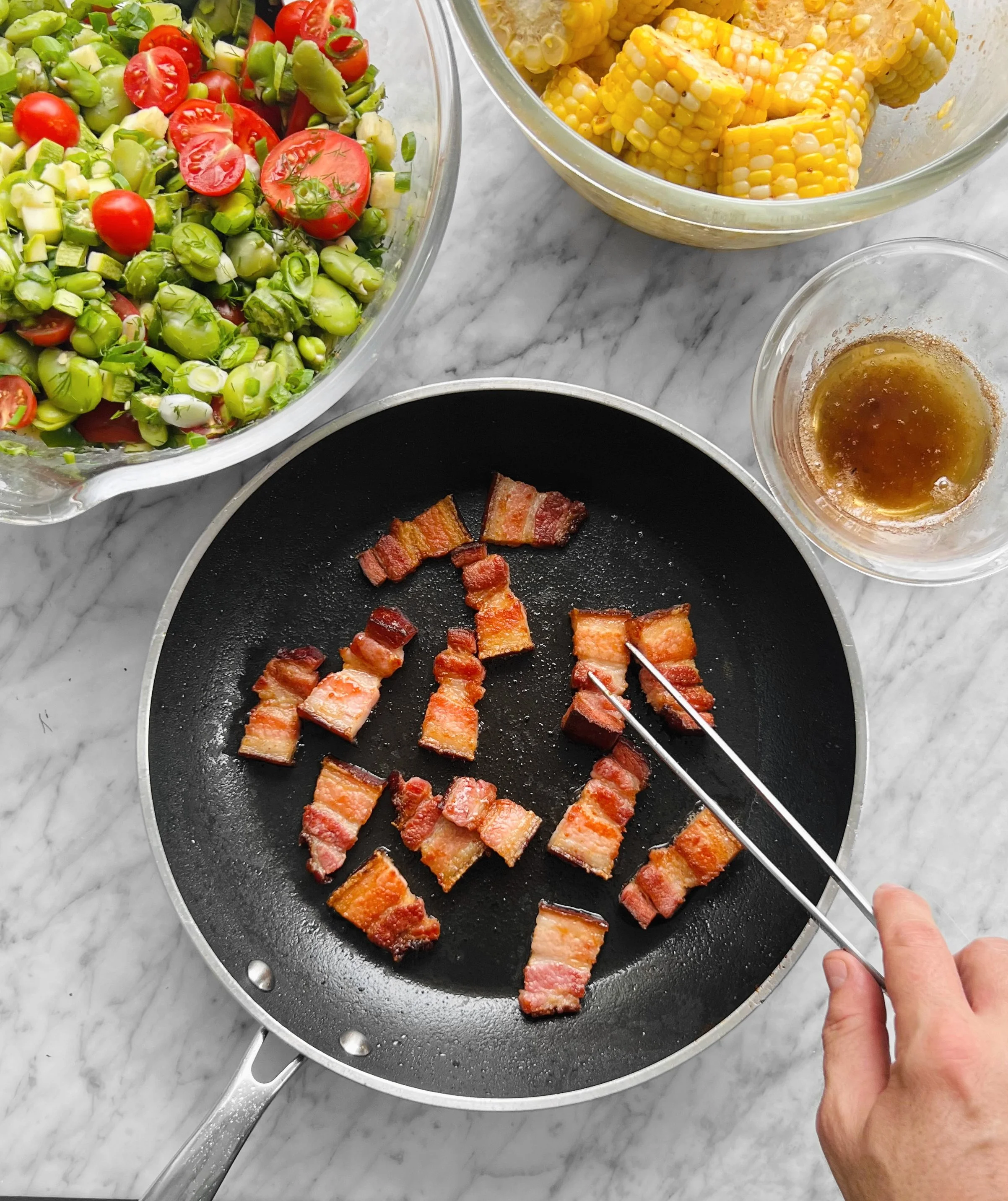 Dans un petit poêlon, faire rissoler les lardons de bacon à feu moyen-élevé. Laisser tempérer et conserver le gras de cuisson.