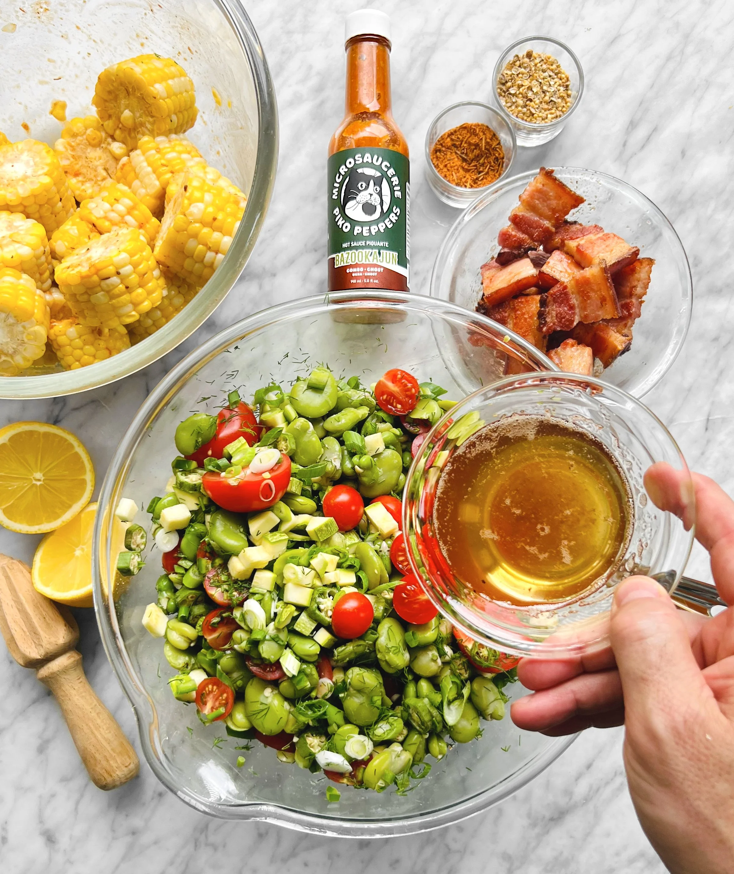 salade - salade-repas - accompagnement - légumes - gourganes - légumineuses - maïs - tomates - courgettes - bacon - herbes - ciboulette - aneth - épices - sauce piquante - piments - jalapeno - exclusivité - cuisine du monde - boîte à lunchs - salades estivales - collaboration - Piko Peppers