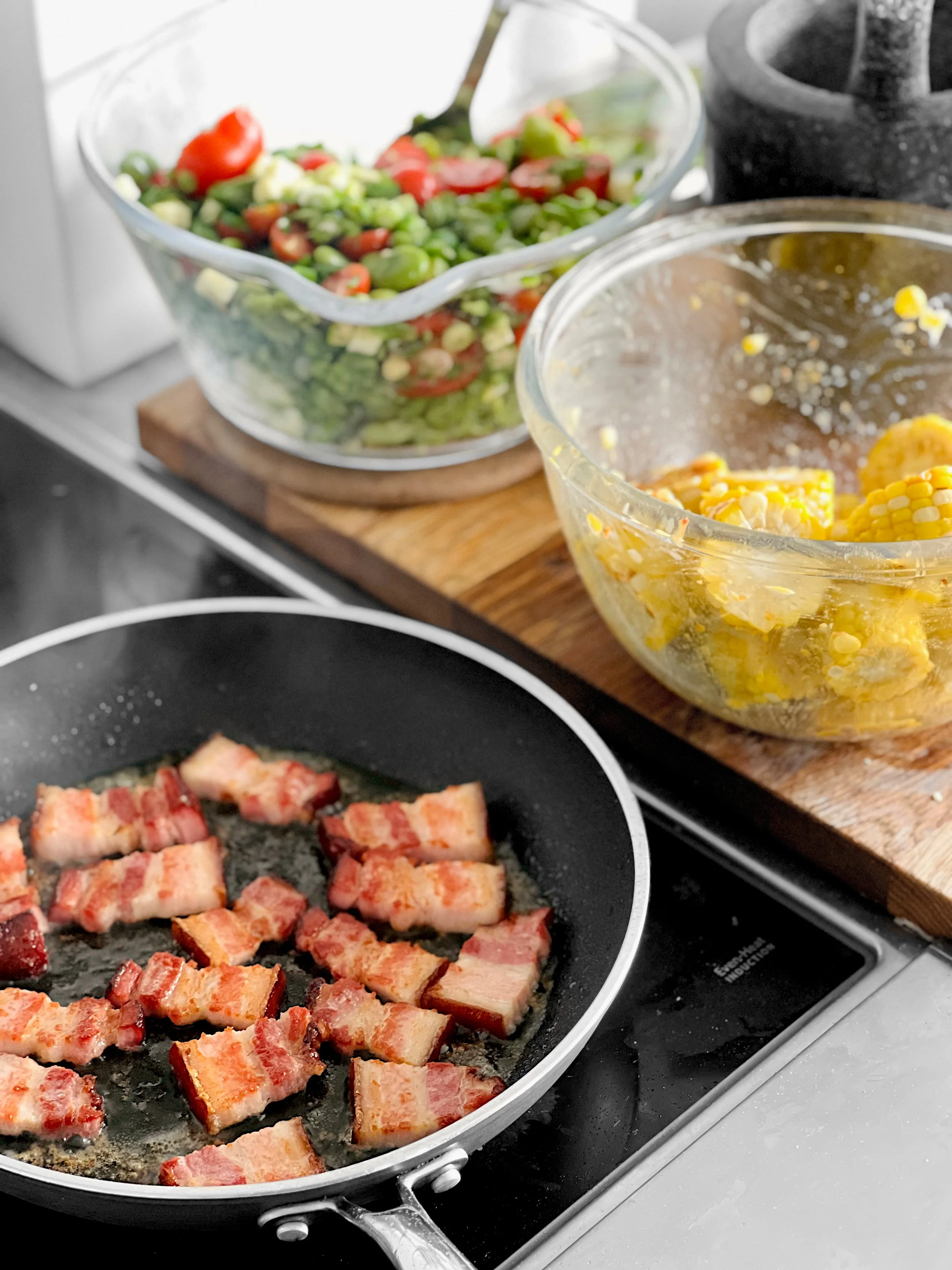 Servir la salade garnie de tronçons de maïs épicés et de gros lardons de bacon. Ce succotash réinventé et relevé est parfait comme salade repas ou accompagne à merveille les grillades.