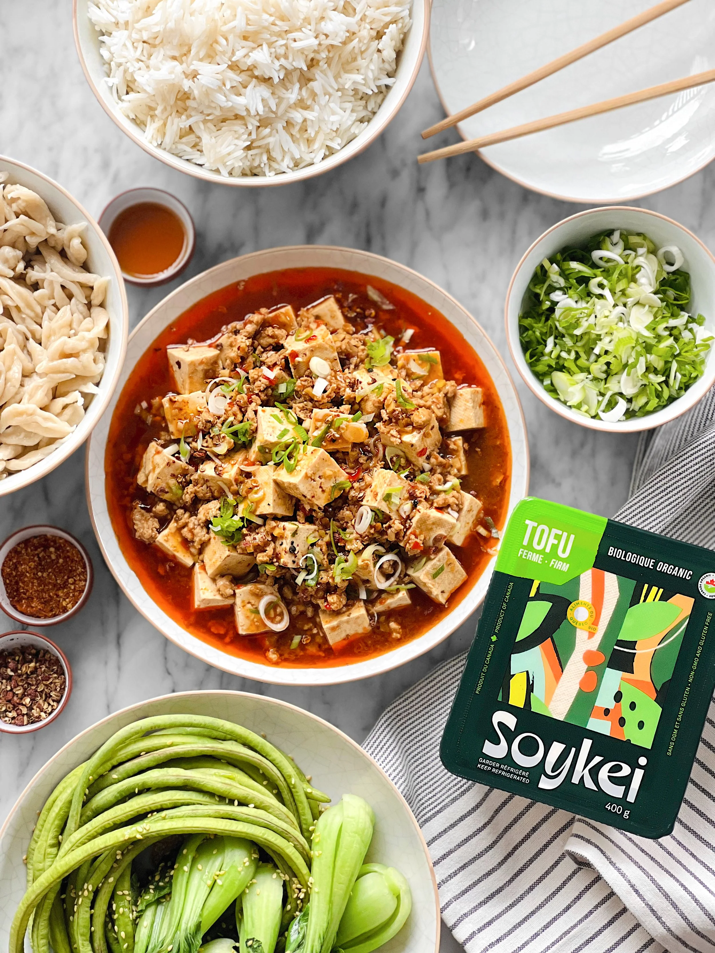 Des trois produits phares de Soykei, le tofu ferme est tout désigné pour notre recette de Tofu Mapo. Ferme mais tout de même relativement tendre, il tiendra parfaitement sa forme une fois ajouté à l’incroyable sauce bien relevée aux piments et au poivre du Sichuan. Tout comme les deux autres variétés de tofu Soykei, 100% produits au Québec, il est offert en version traditionnelle ou biologique et disponible dans tous les supermarchés.