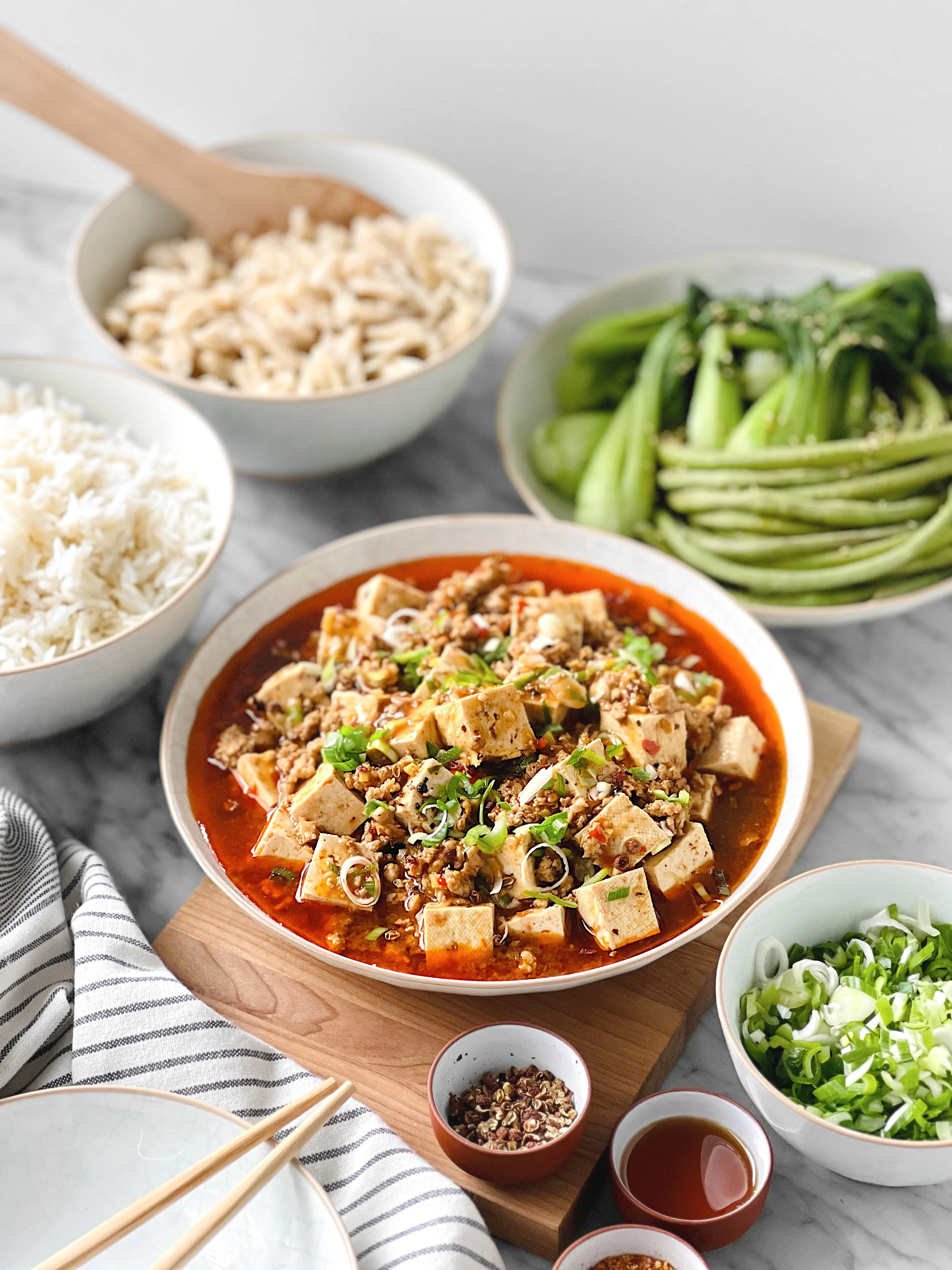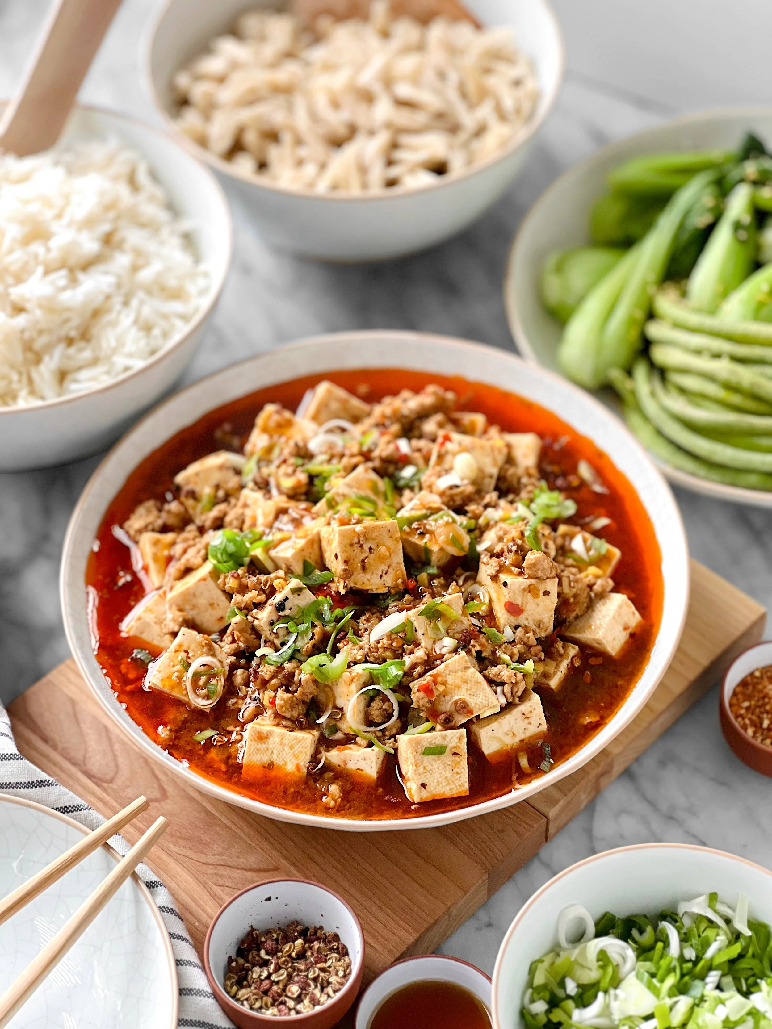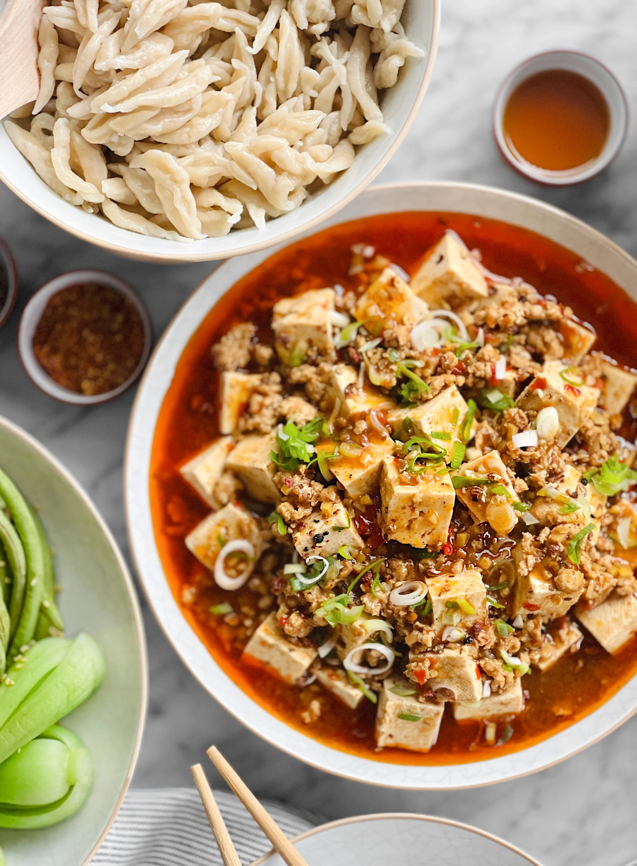 Ceux qui disent ne pas aimer le tofu n'ont fort certainement jamais goûté ce plat ! Il est savoureux, épicé, «viandeux» et onctueux à la fois et tellement satisfaisant. Et l’effet engourdissant du poivre du Sichuan fait que vous ne pourrez plus vous arrêter d’en manger! Servez le Tofu Mapo avec des légumes verts, du riz vapeur ou encore des nouilles fraîches. J’ai d’ailleurs, en bas de page, une recette de nouilles maison express à couper… aux ciseaux!