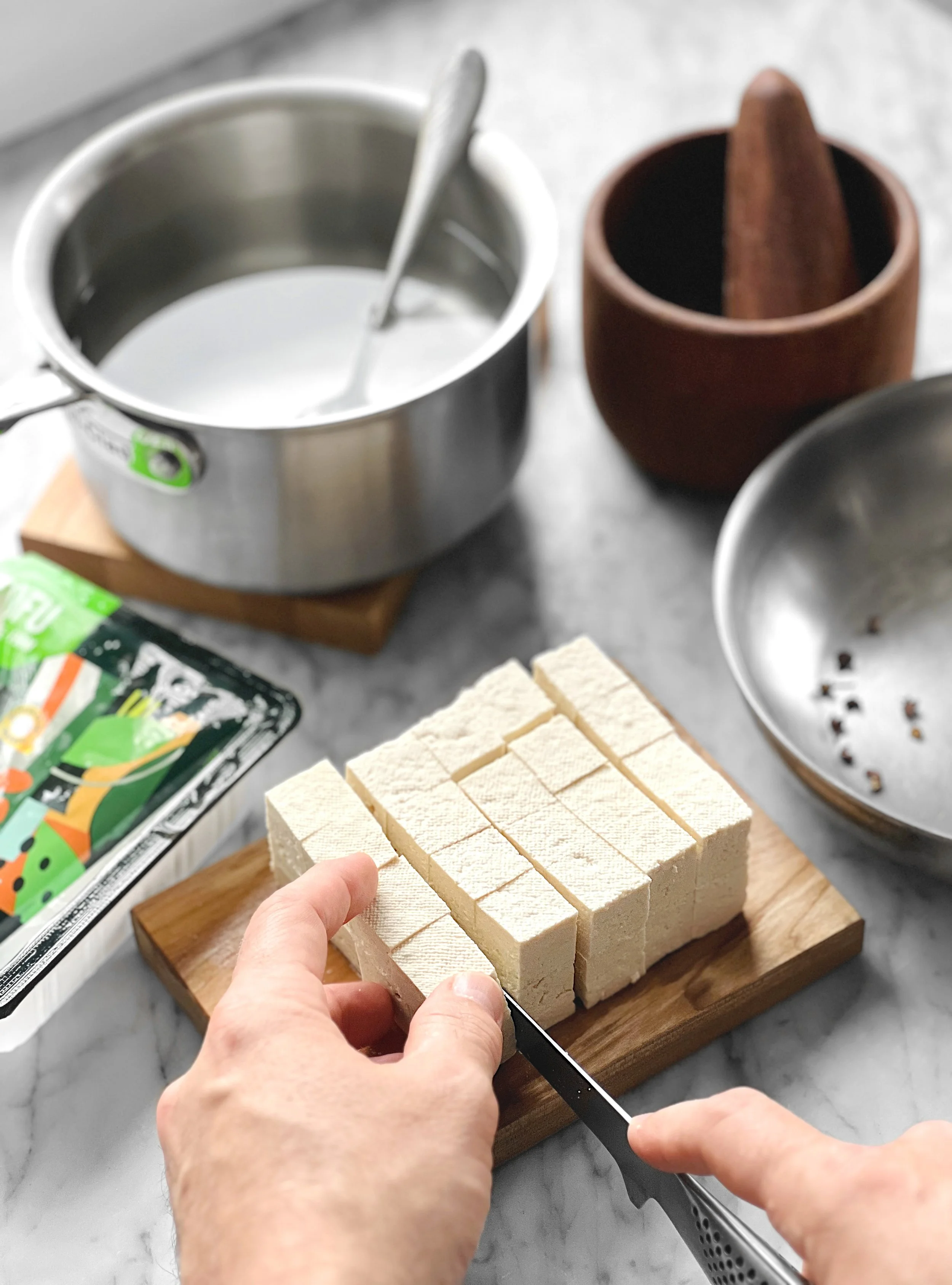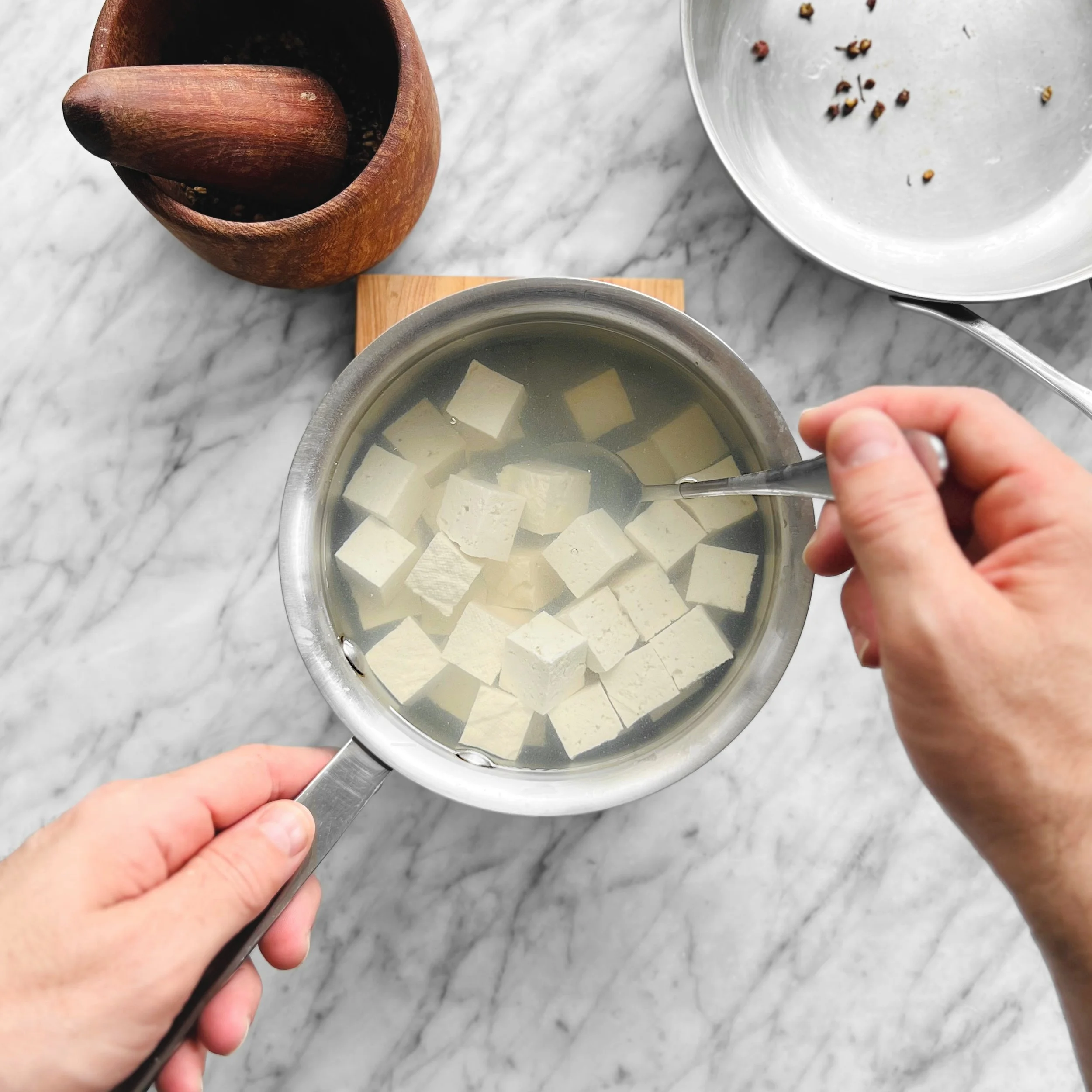 Égoutter et éponger le tofu ferme Soykei et détailler en cubes. Faire chauffer une petite casserole d’eau jusqu’à frémissement et ajouter quelques pincées de sel. Ajouter les cubes de tofu. Mijoter très très doucement 2 minutes et fermer le feu. Réserver le tofu dans l’eau chaude salée jusqu’à utilisation. Cette étape permet de bien assaisonner le tofu en plus de le réchauffer et de lui donner ne meilleure tenue au moment de l’ajouter à la sauce en fin de recette.
