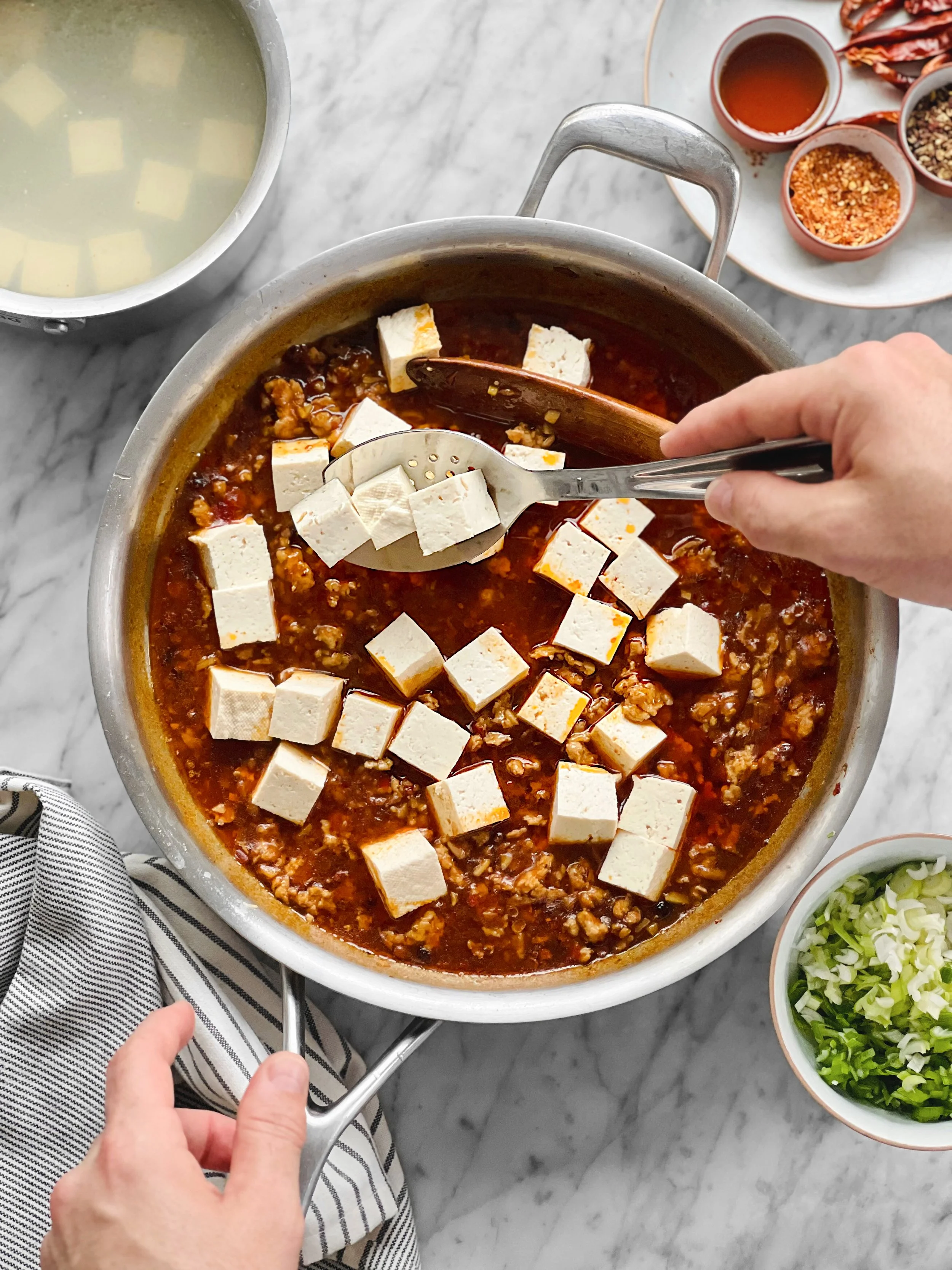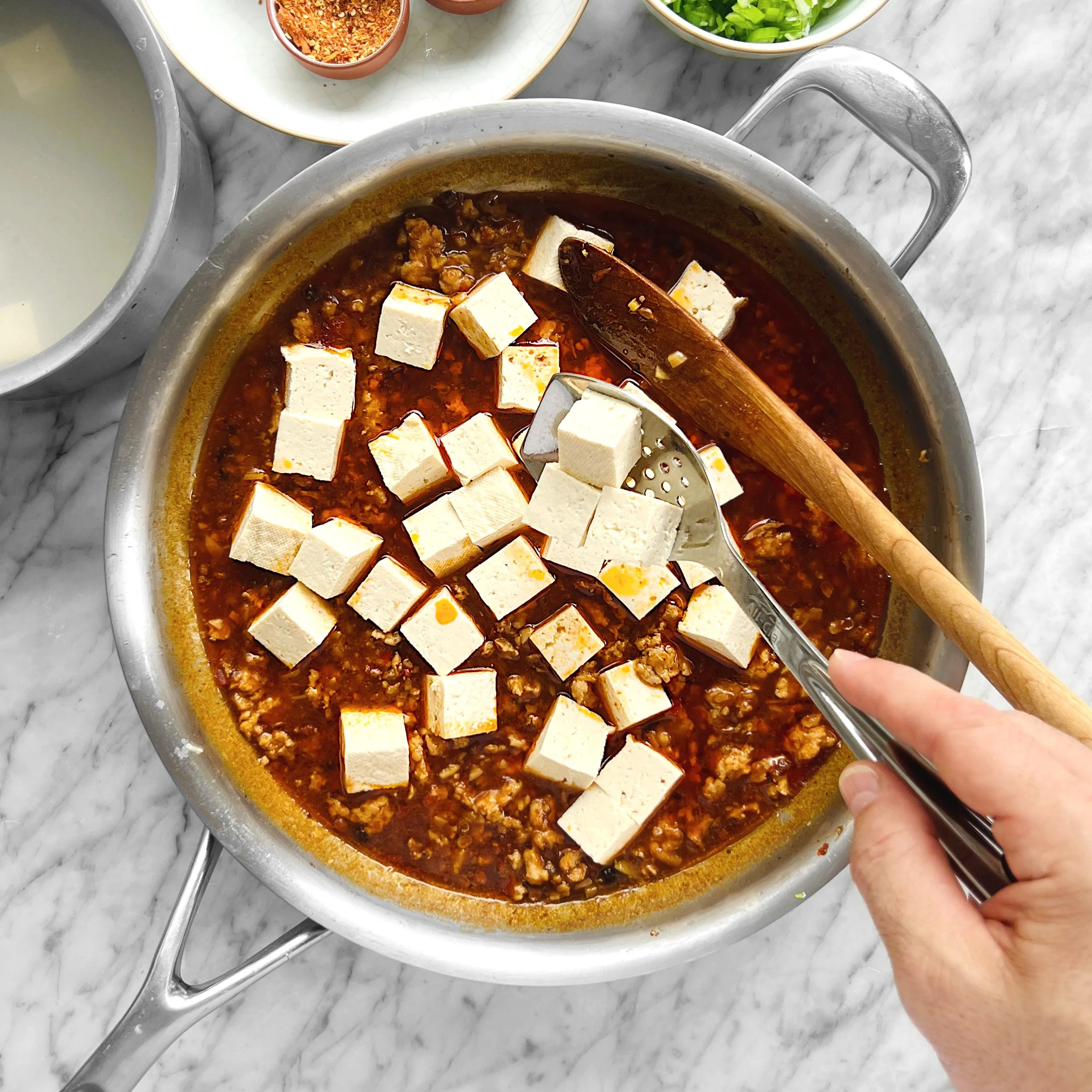 Terminer en ajoutant délicatement les cubes de tofu repêchés à l’aide d’une cuillère trouée. Fermer le feu. Enrober doucement le tofu de sauce et transférer dans un plat de service. Arroser d’un trait d’huile de sésame et coiffer d’oignon vert ciselé et d’un peu de poivre du Sichuan au moment de servir.