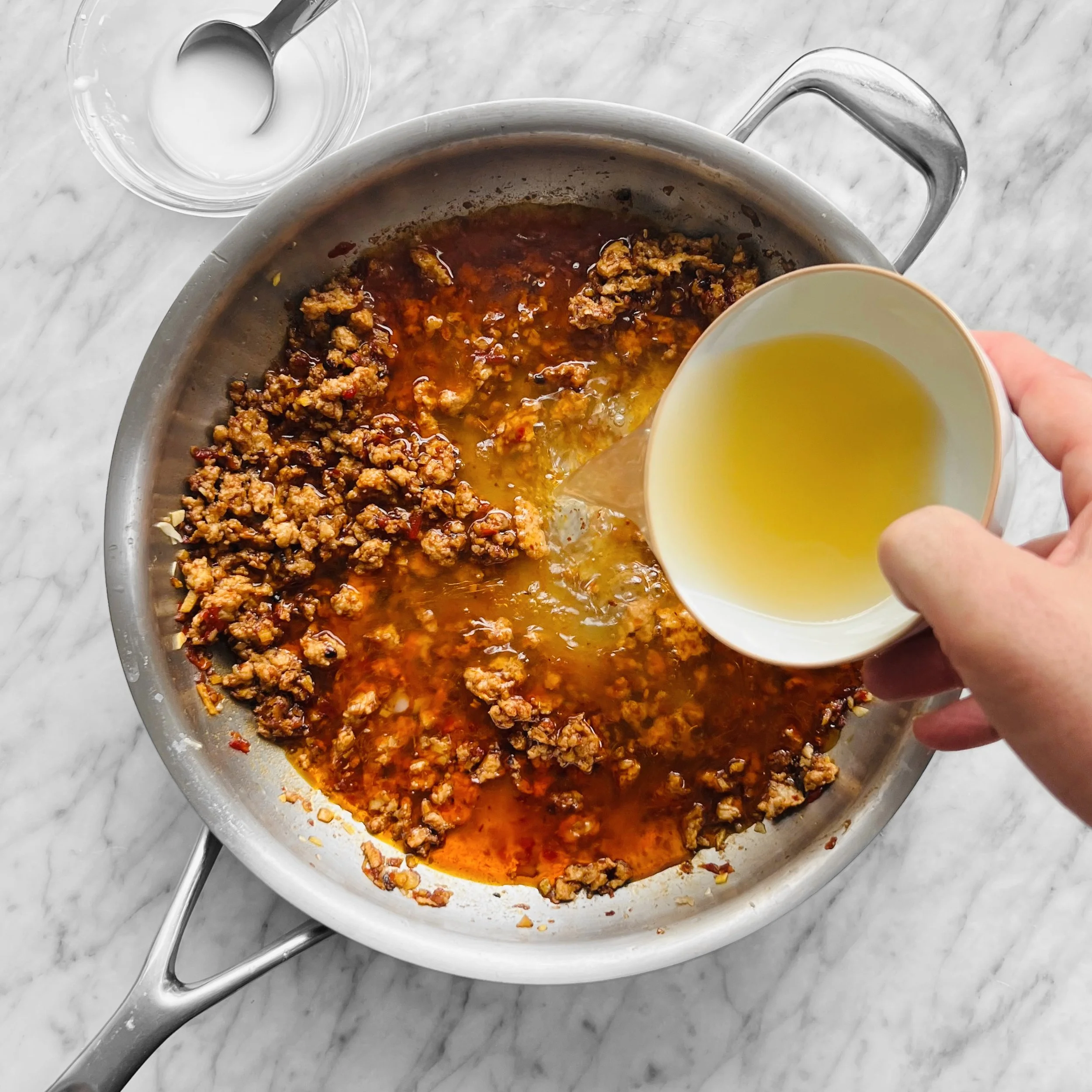 Pour une version 100 % végétarienne, remplacer le porc haché par la même quantité de champignons hachés ou d’aubergines en petits dés. Remplacer le bouillon de poulet par du bouillon de légumes ou simplement de l’eau.