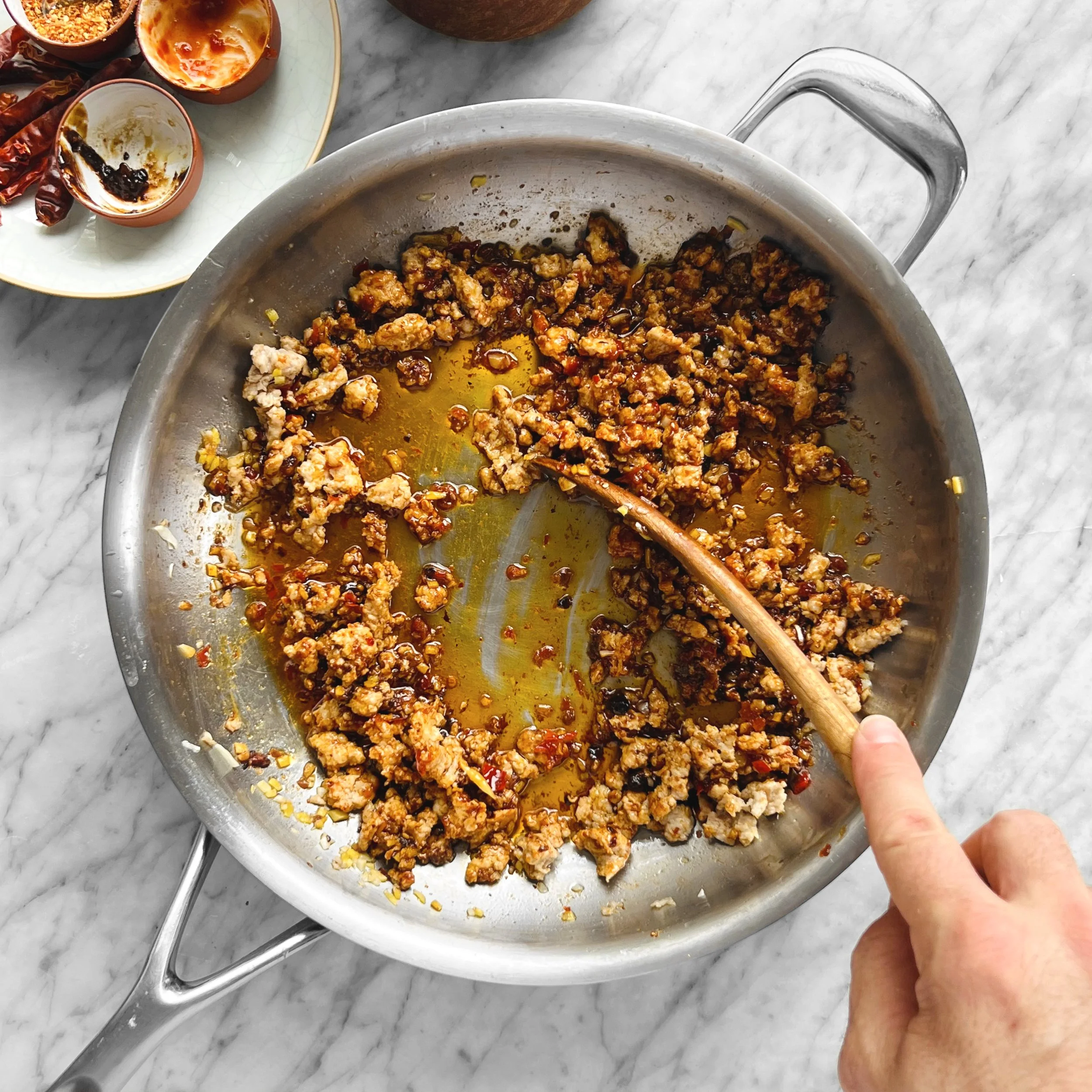 Dans un grand poêlon ou un wok, chauffer l’huile à feu élevé puis faire revenir le porc haché en l’émiettant 5 minutes ou jusqu’à ce qu’il soit tout juste cuit. Ajouter l’ail et le gingembre et poursuivre la cuisson 1-2 minutes. Ajouter le doubanjiang, la pâte de haricots noirs fermentés, la poudre de piment et 1/2 c. à thé du poivre du Sichuan grossièrement moulu. Cuire 1 minute de plus avant d’ajouter le bouillon et le vinaigre de riz. Porter à frémissement et réduire le feu pour laisser mijoter 5 minutes. Pendant ce temps diluer la fécule de maïs dans l’eau froide et ajouter au mélange. Laisser épaissir et rectifier l’assaisonnement.