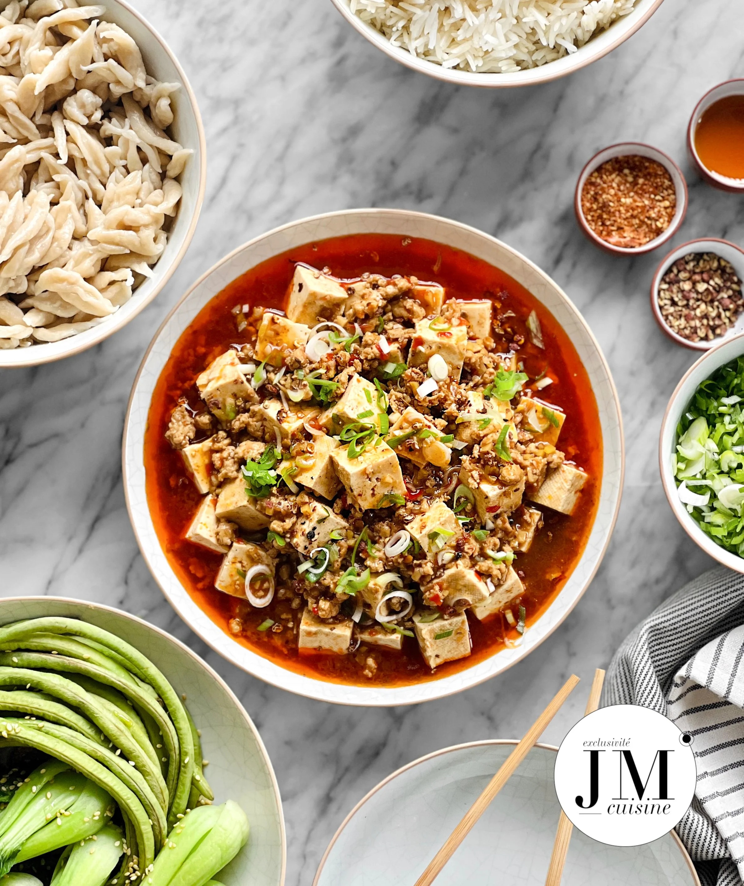 Le Tofu Mapo (麻婆豆腐, mápó dòufu) est un plat emblématique de la cuisine sichuanaise, réputé pour son goût intense et piquant, son effet légèrement engourdissant dû au poivre du Sichuan ainsi que sa couleur d’un rouge bien vif. Son nom signifie littéralement « tofu de la vieille femme au visage tacheté », en référence à une certaine Mme Chen, une cuisinière de Chengdu au XIXe siècle que l’on reconnaissait par des marques sur son visage. Son tofu épicé est devenu si célèbre qu’il a pris son surnom. Il y a le Général Tao et il y a la madame Mapo!