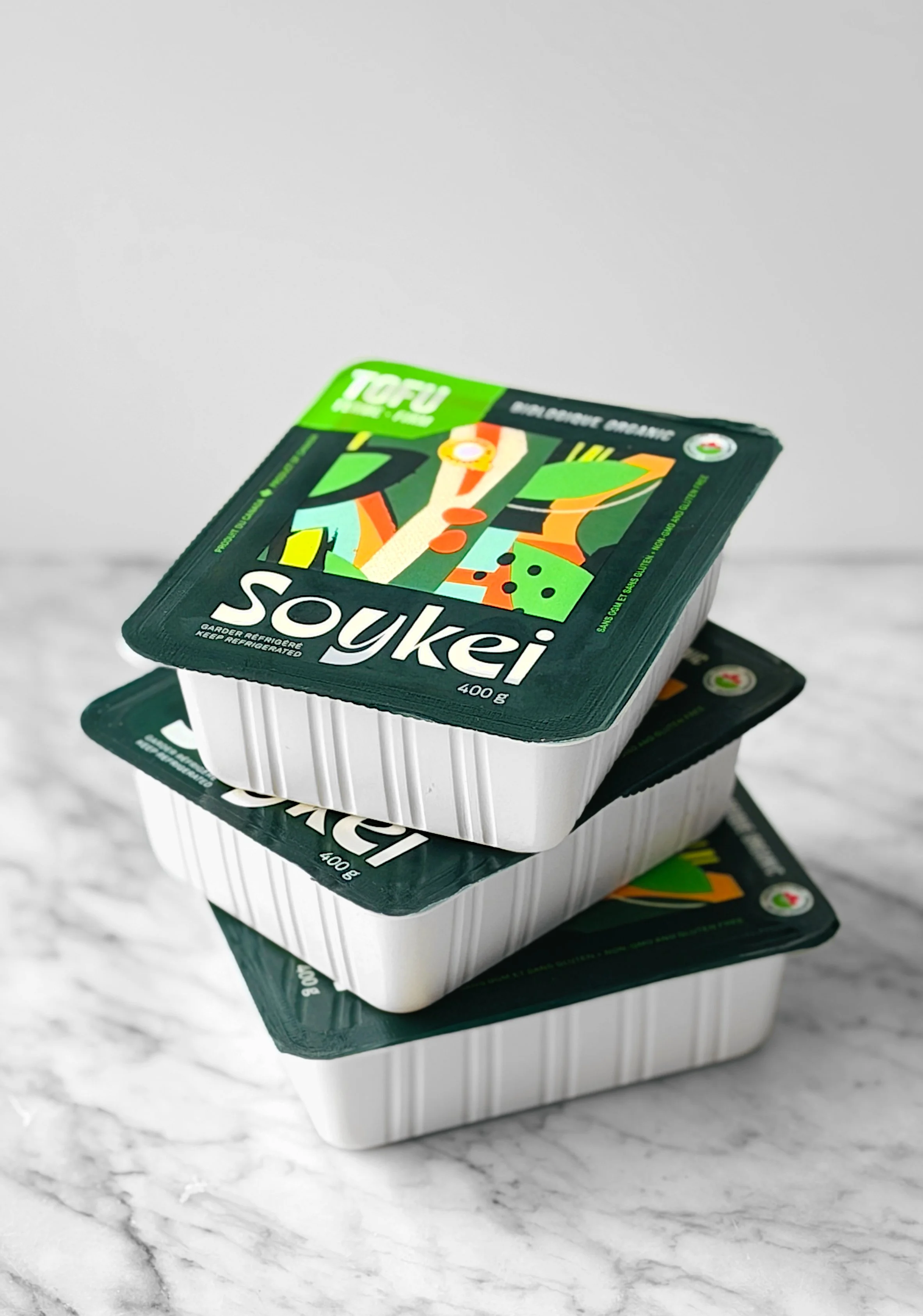 Le tofu Soykei est au départ beaucoup plus savoureux que tous les autres tofus sur le marché, mais je veux tout de même porter votre attention sur une étape que je vous encourage à ne pas omettre : le saumurage. Faire tremper le tofu dans une saumure permet de l’assaisonner en profondeur et d’améliorer sa texture. Ce procédé déclenche une osmose : le sel pénètre doucement au cœur du tofu pendant qu’une partie de son eau est libérée, ce qui raffermit légèrement sa texture. Résultat : un tofu plus moelleux, bien assaisonné et qui se tient mieux. Le trempage peut durer de 15 minutes à la température ambiante à 12 heures au frigo, selon l’intensité de goût souhaitée. Une fois saumuré, il suffit de l’éponger : il sera prêt à être grillé, sauté, pané, rôti ou à être servi en garniture avec une tenue et un goût améliorés.