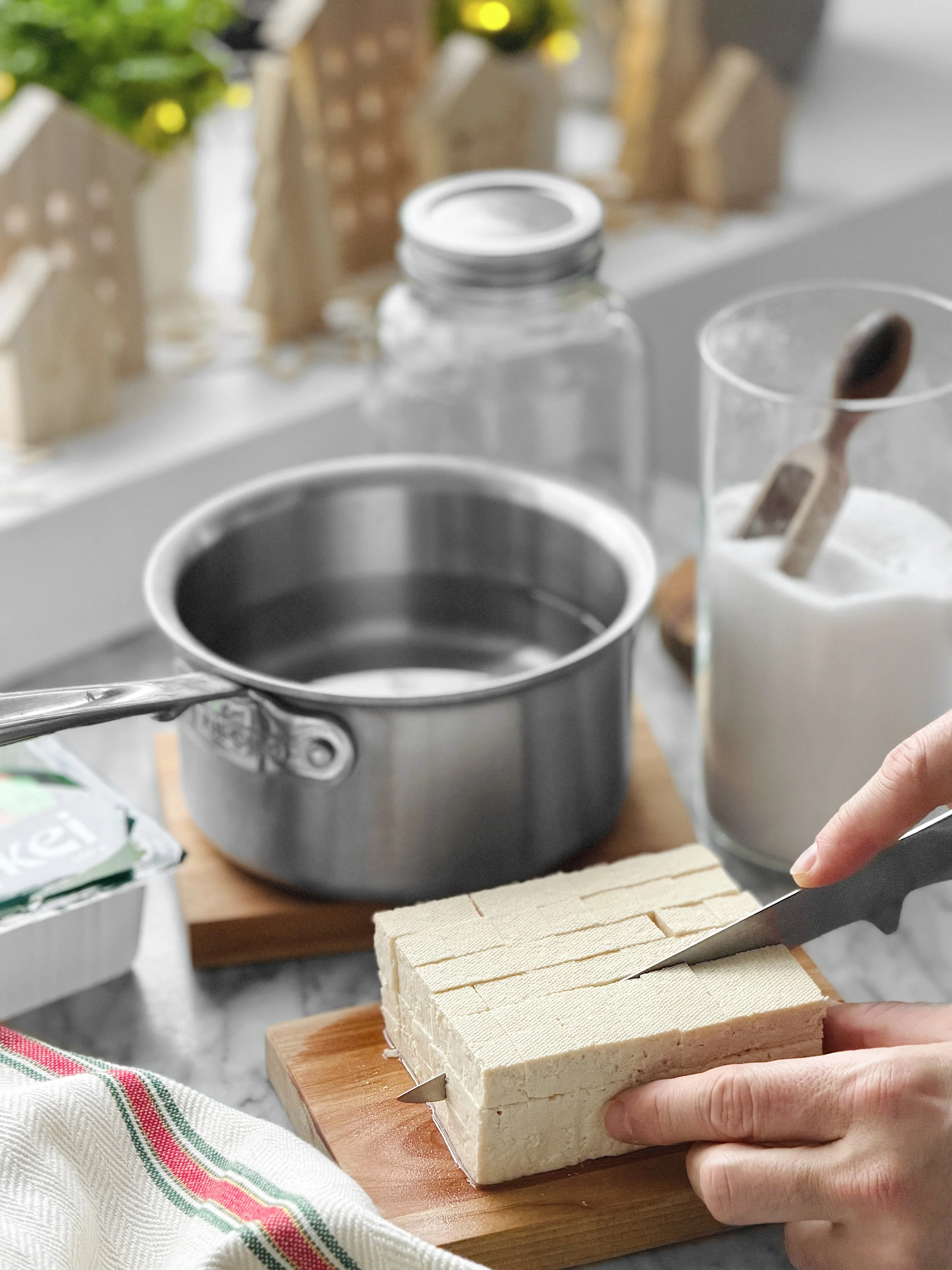Le tofu ferme Soykei est tout désigné pour ce que je vous propose aujourd’hui. Ferme mais tout de même relativement tendre, il tiendra parfaitement sa forme et sera encore plus savoureux après l’étape de saumurage et la marinade festive qui suivra. Tout comme les deux autres variétés de tofu Soykei, 100% produits au Québec, il est offert en version traditionnelle ou biologique et disponible dans tous les supermarchés.