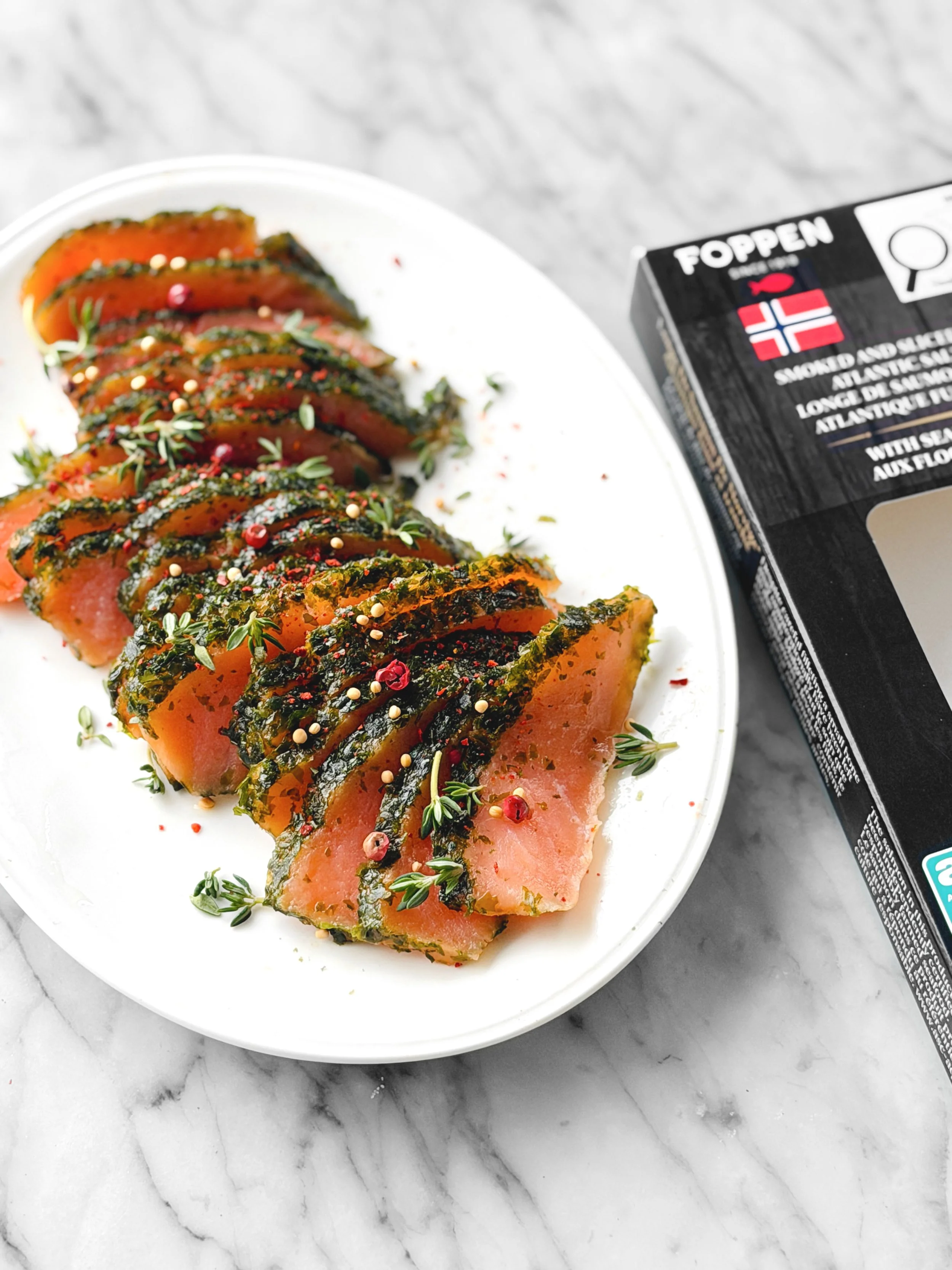 Étant donné que mon thème en ce temps des fêtes 2025 est «Noël norvégien», voici un beau produit déniché en grande surface qui vient justement de Norvège. Il ne s’agit pas de gravlax, mais bien de saumon fumé recouvert d’aromates (épices, algues, etc.) taillé en sashimi. Il ne vous resteras qu’à le déguiser un peu avec des petites garnitures pour le personnaliser : poivre rose, thym frais, graines de moutarde… Joli, bon et efficace!